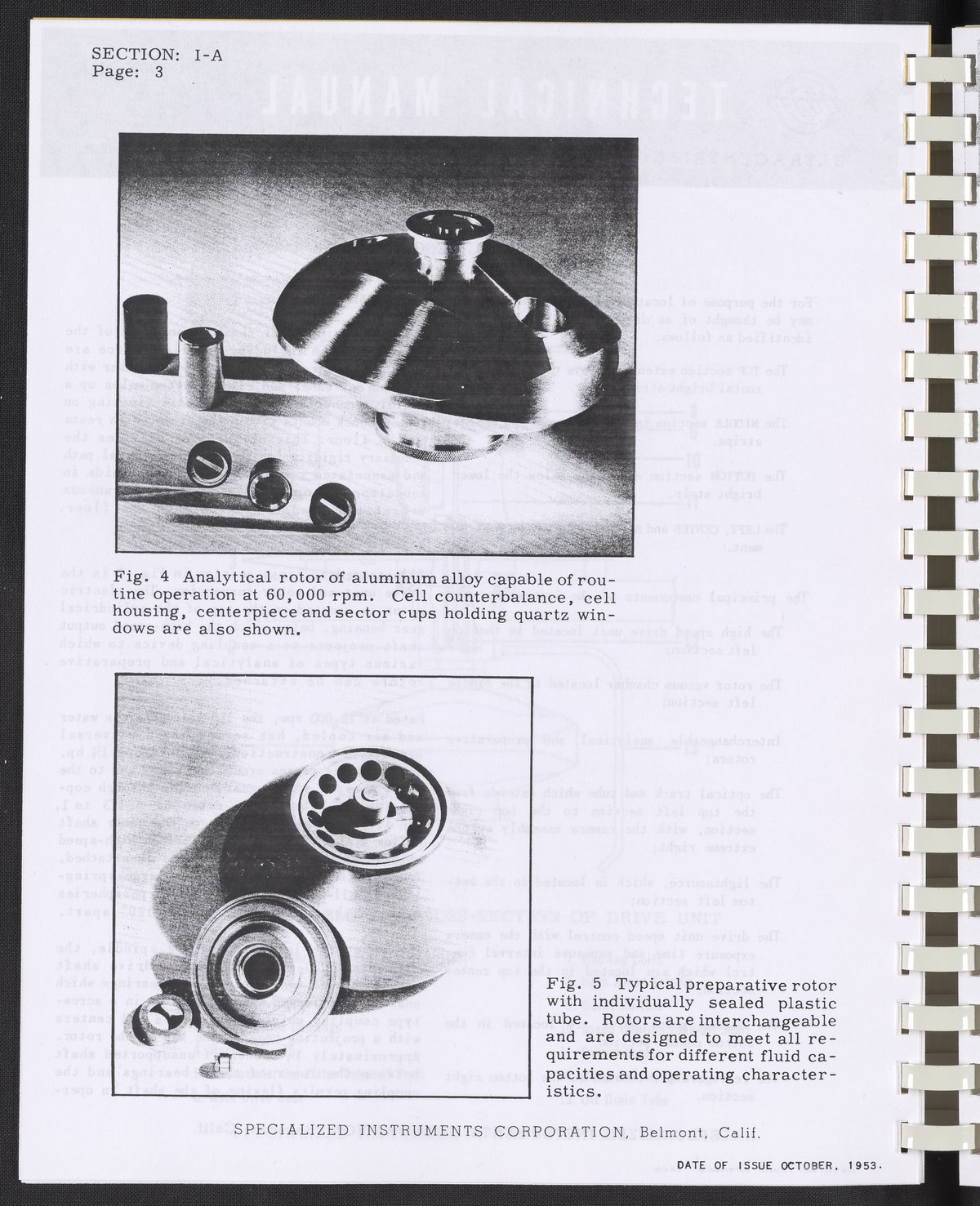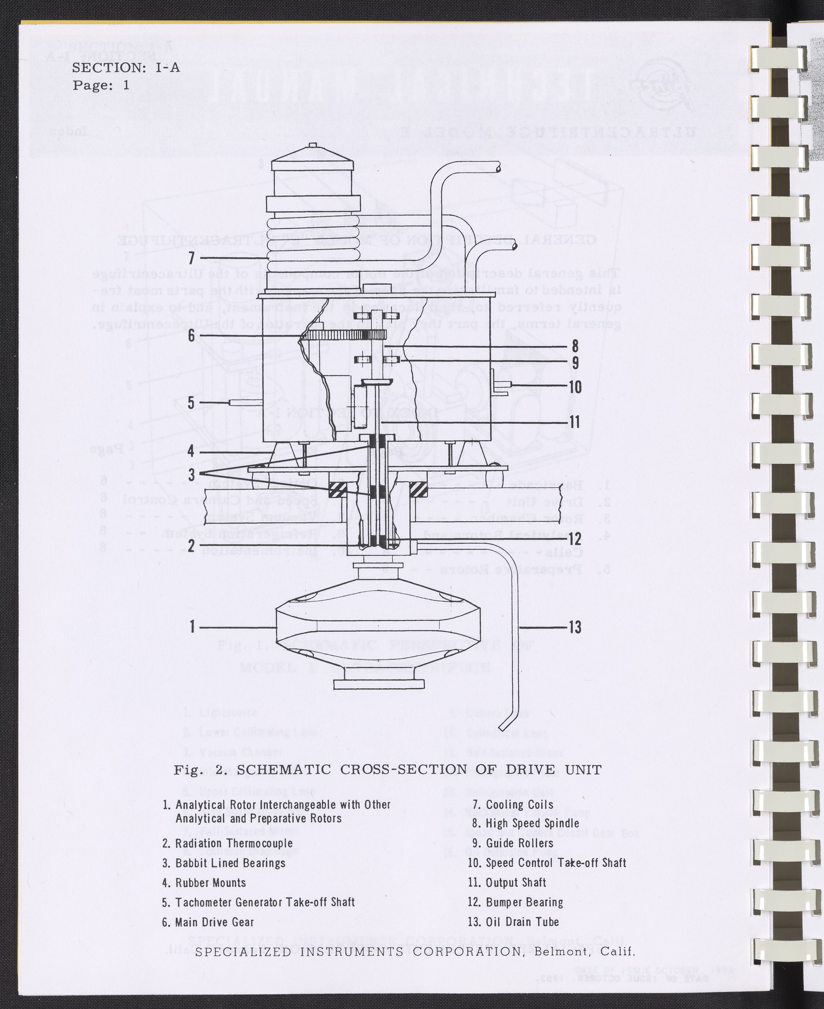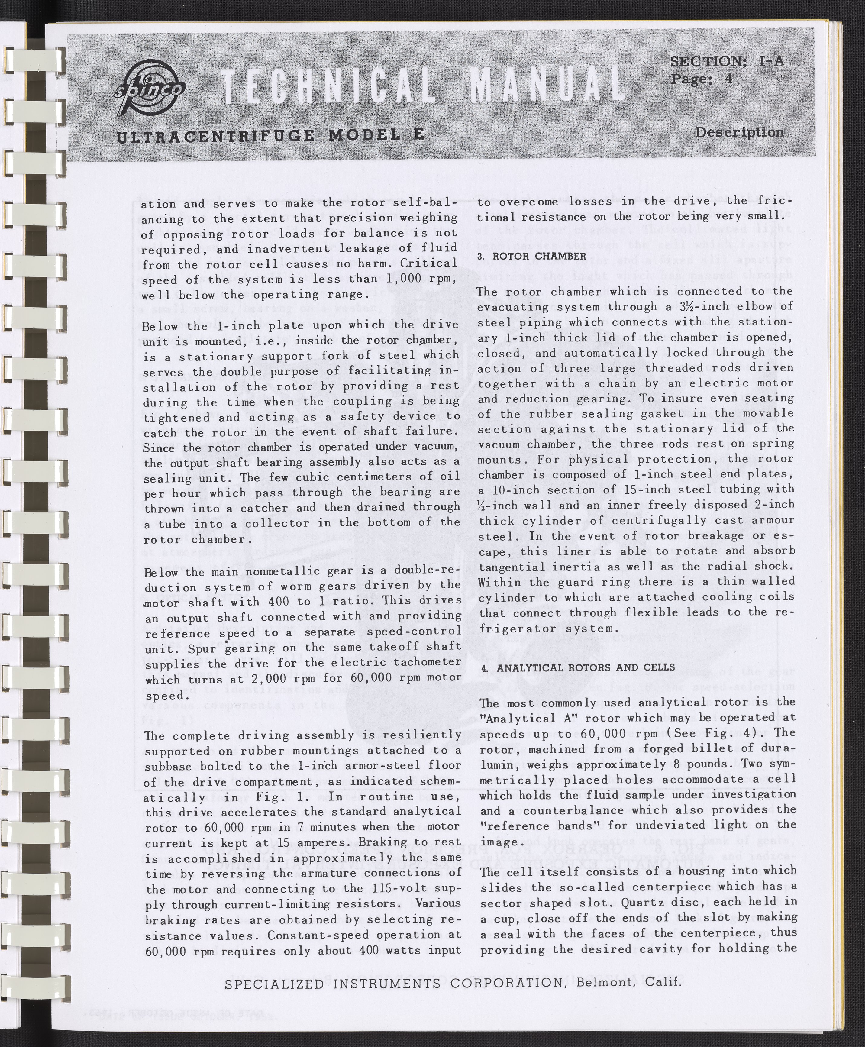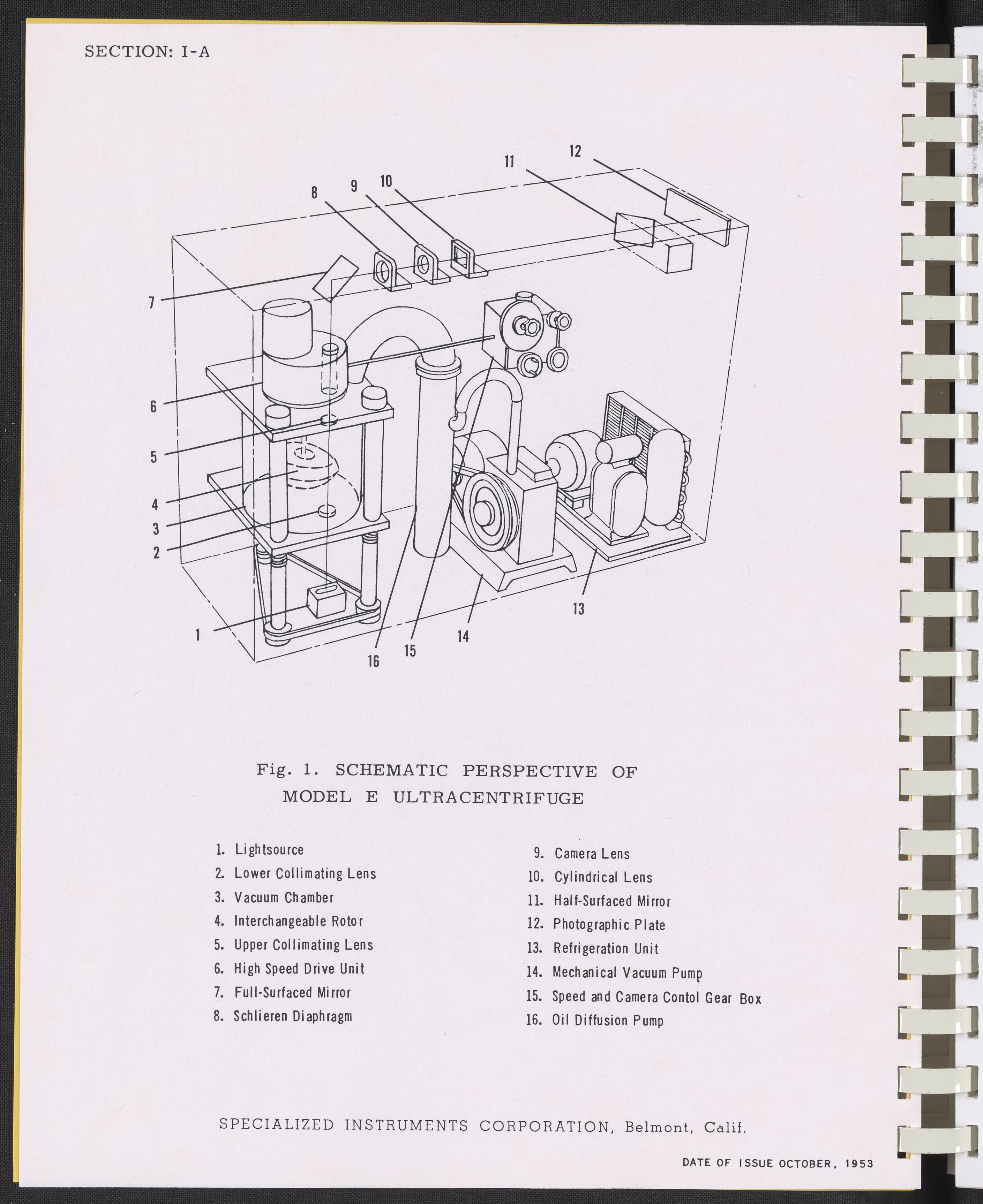 Beckman Instruments, Inc. Spinco Division. “Technical Manual, Spinco Ultracentrifuge Model E,” 1953–1954. Beckman Historical Collection, Box 121, Folder 9. Science History Institute. Philadelphia. https://digital.sciencehistory.org/works/hm50ts49m.