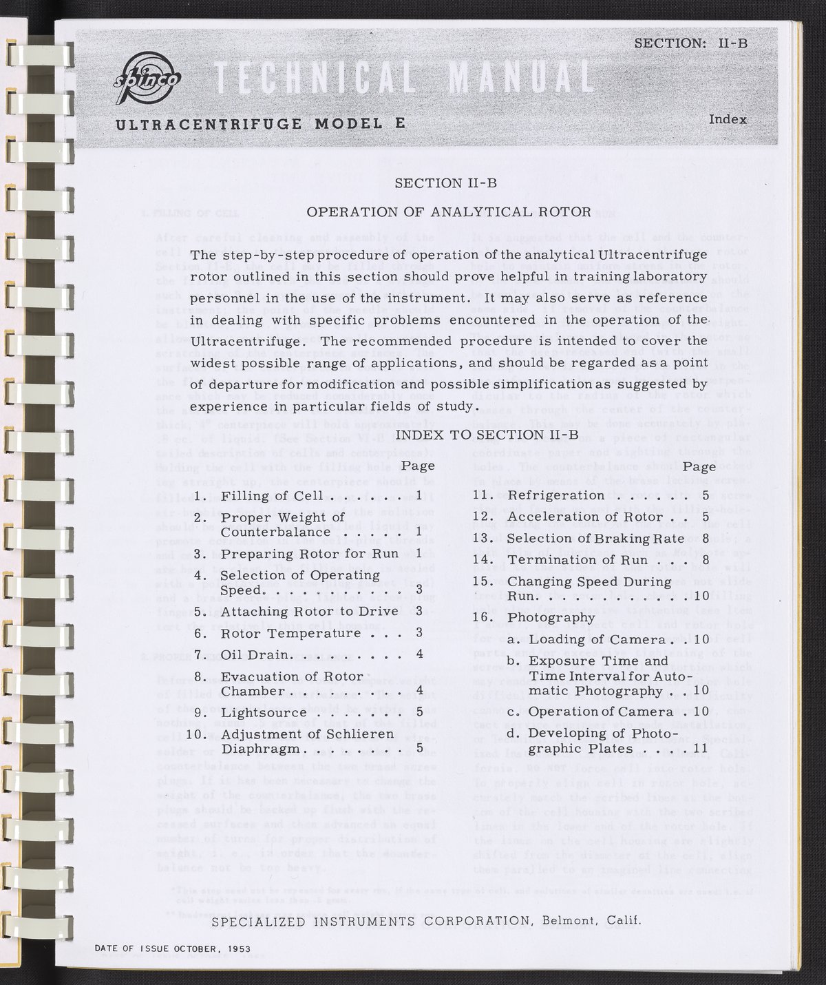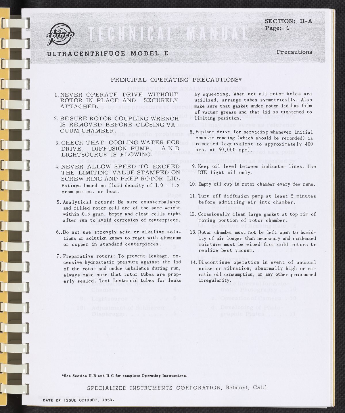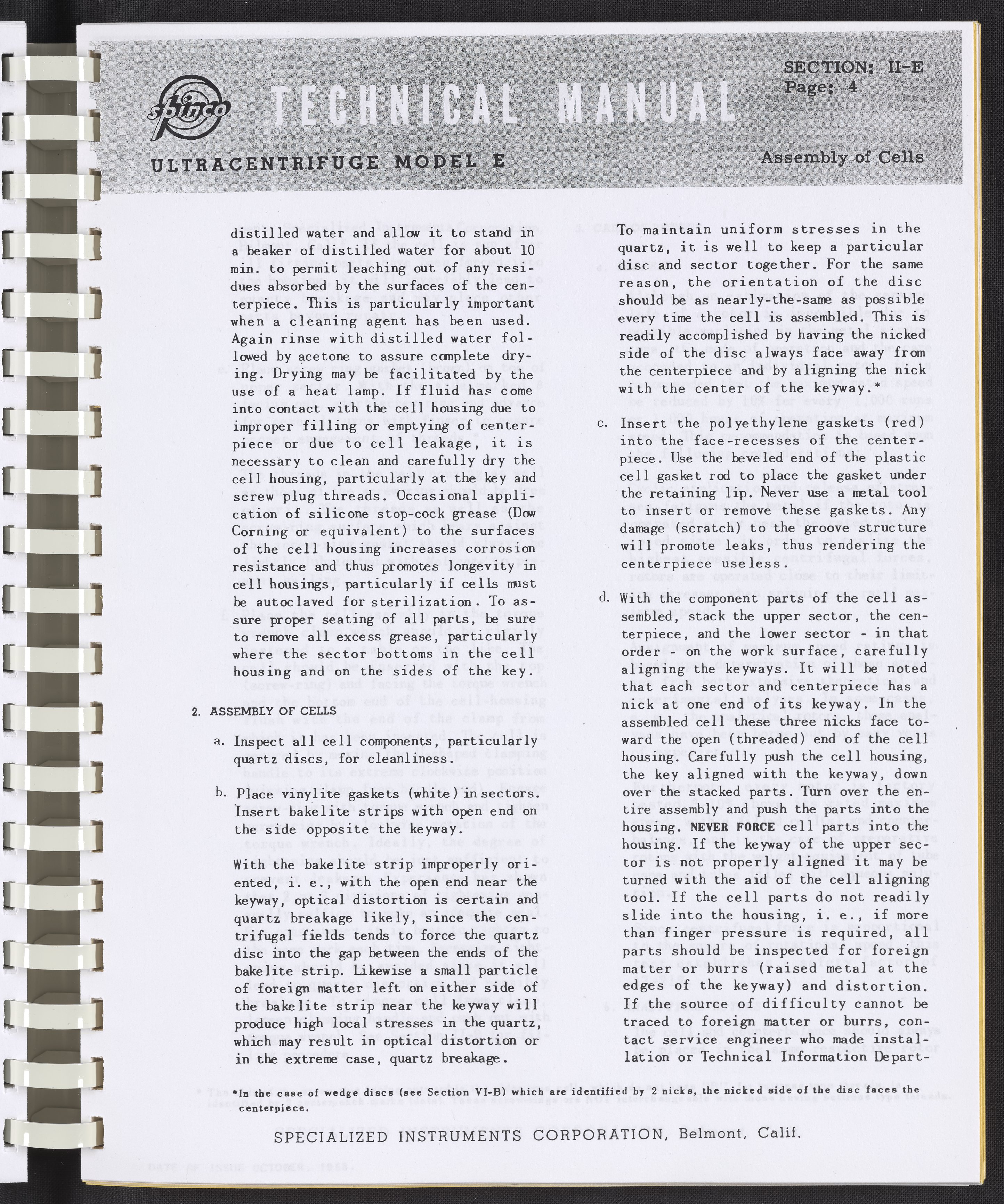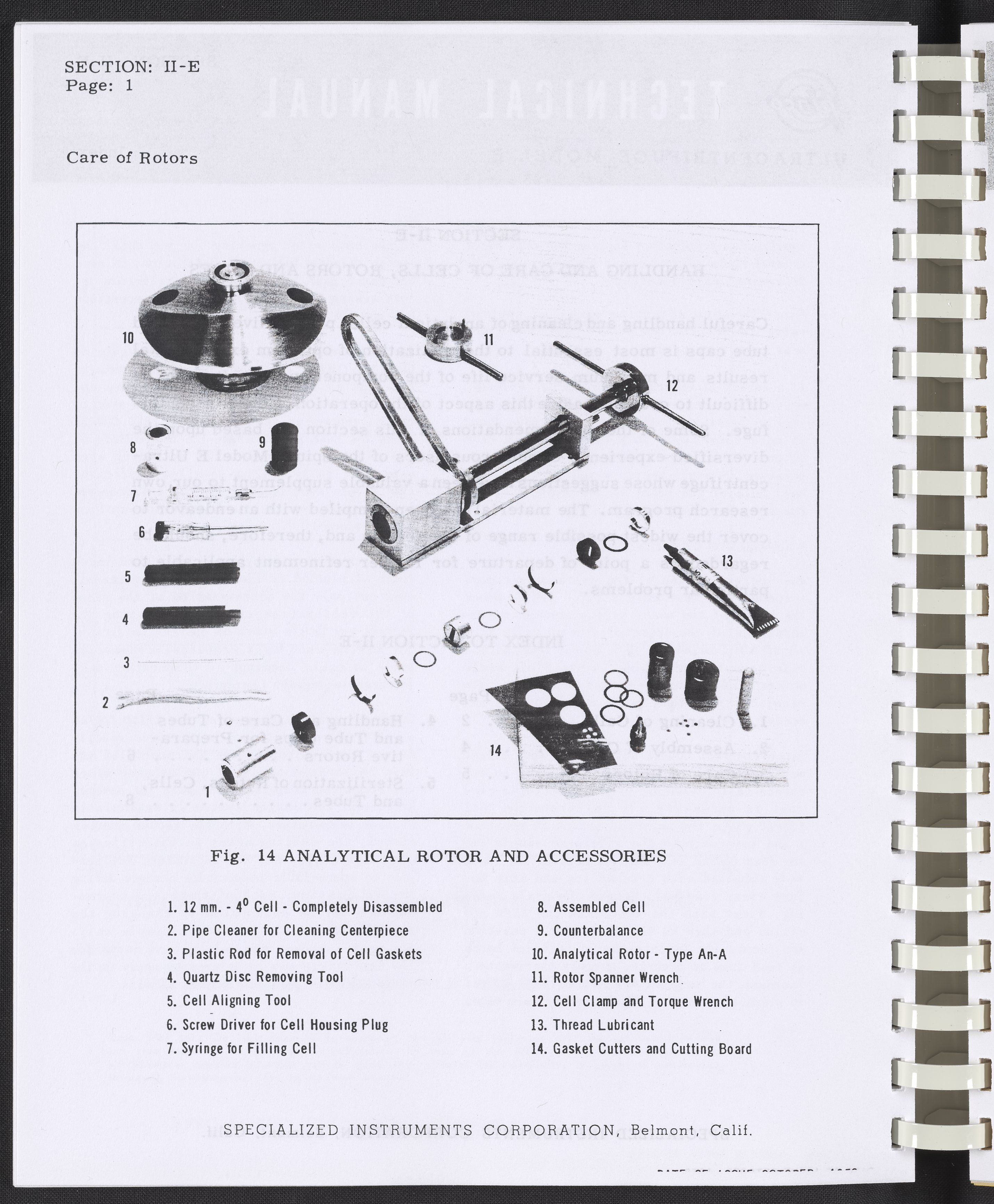 Beckman Instruments, Inc. Spinco Division. “Technical Manual, Spinco Ultracentrifuge Model E,” 1953–1954. Beckman Historical Collection, Box 121, Folder 9. Science History Institute. Philadelphia. https://digital.sciencehistory.org/works/hm50ts49m.