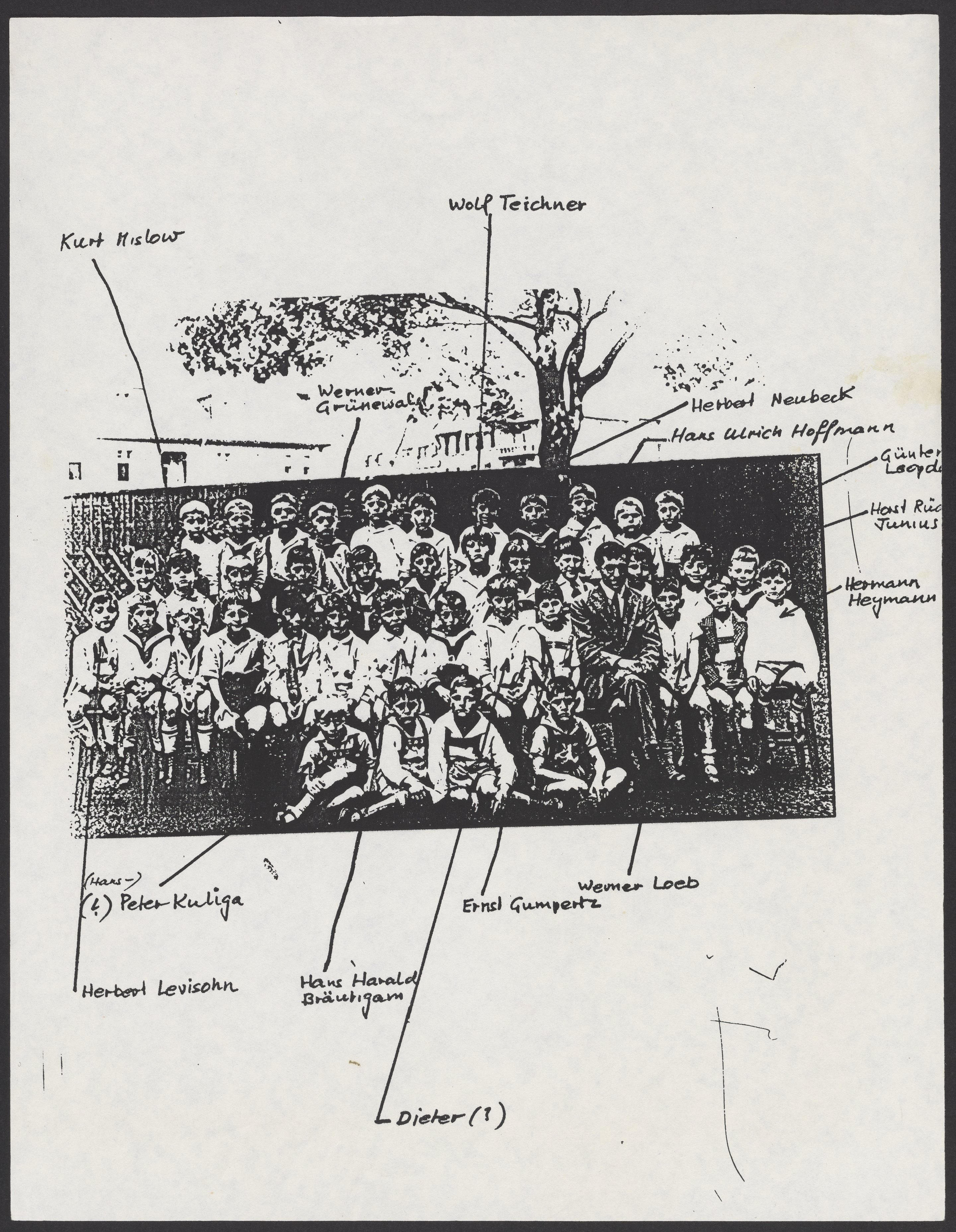 Small JPG1200 x 863px — 202 KBLarge JPG2880 x 2071px — 880 KBFull-sized JPG4356 x 3132px — 1.7 MBOriginal fileTIFF — 4356 x 3132px — 39.1 MBA group photograph of Kurt M. Mislow's (1923-2017) school class. Back of photograph reads "Kurti, 6-7 Jahre alt," suggesting that the photograph is from 1929-1930. Included is a photocopy of the photograph, with certain people labeled. Mislow is second to left, one row down.