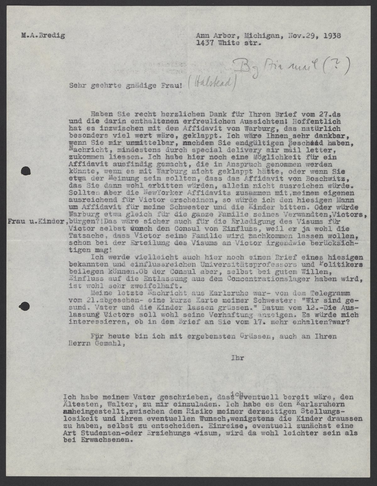 Letter from Fridel G. Halstead to Max Bredig, November 27, 1938