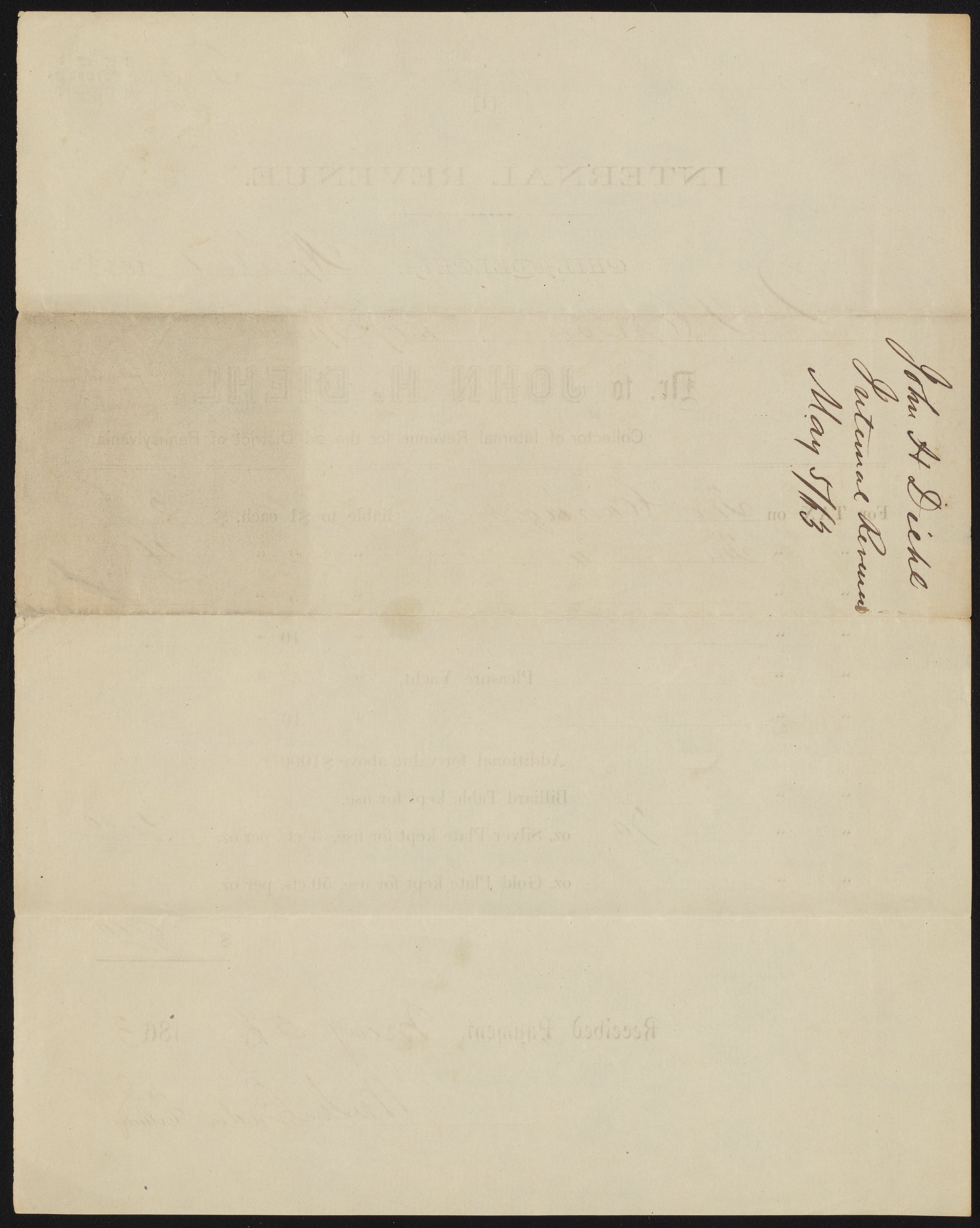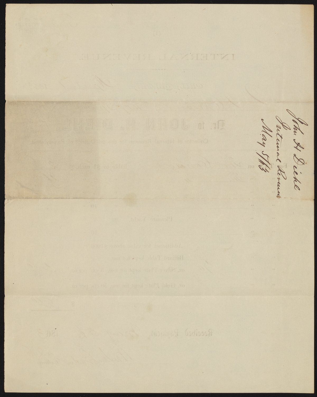 Receipt from John H. Diehl, Internal Revenue