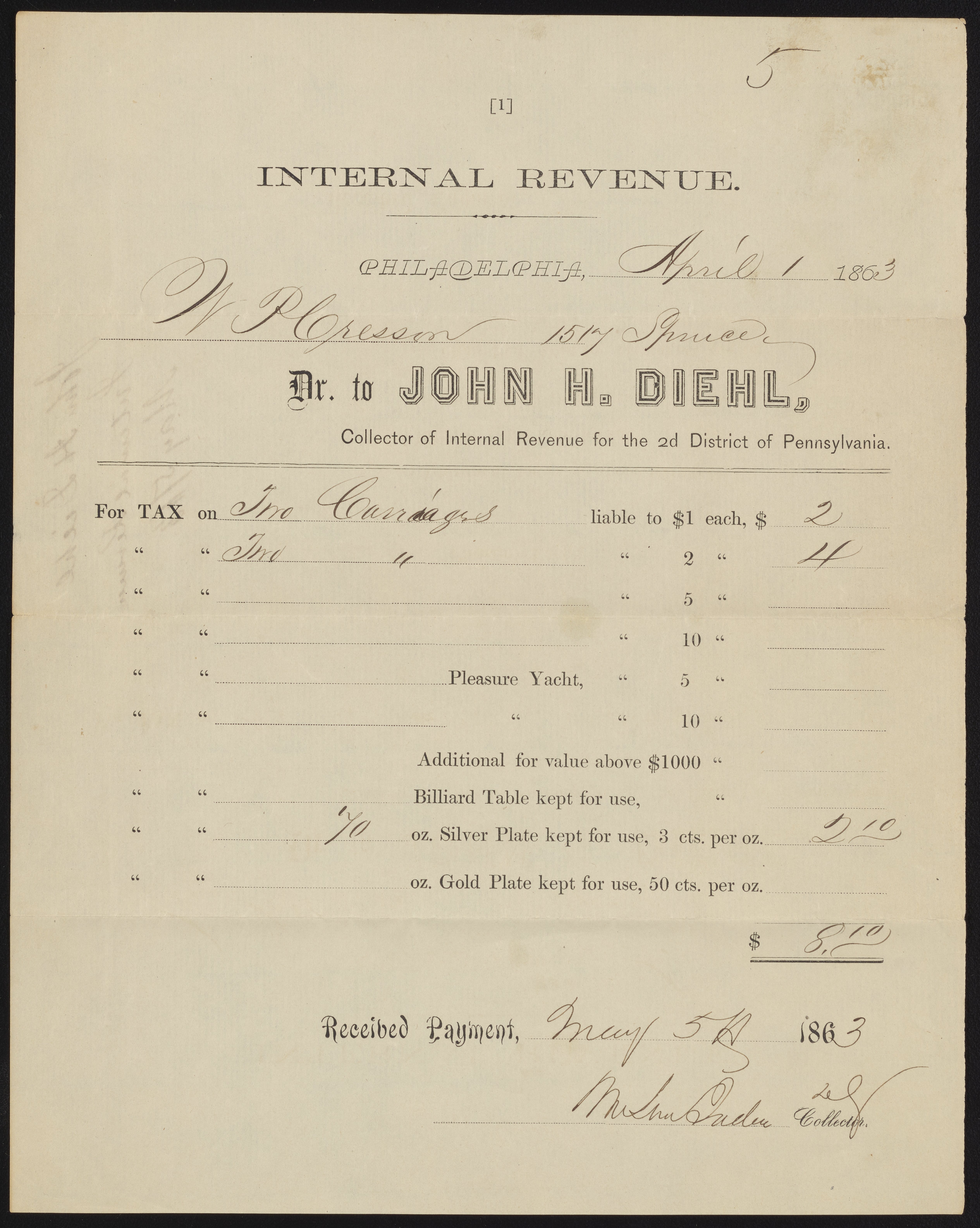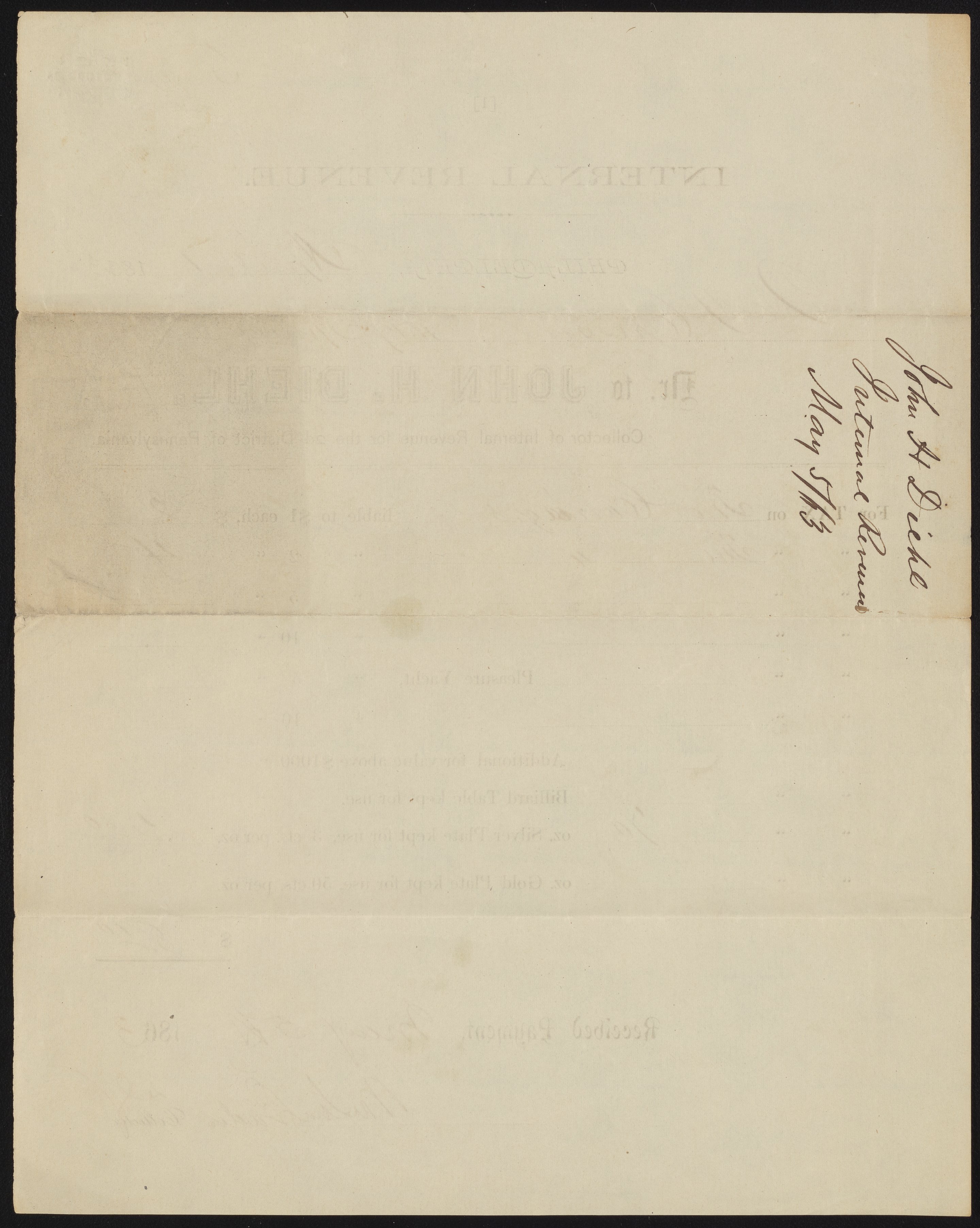 United States. Internal Revenue Service. Philadelphia Service Center. “Receipt from John H. Diehl, Internal Revenue,” May 5, 1863. Papers of James Curtis Booth, Box 8, Folder 13. Science History Institute. Philadelphia. https://digital.sciencehistory.org/works/hoygt16.