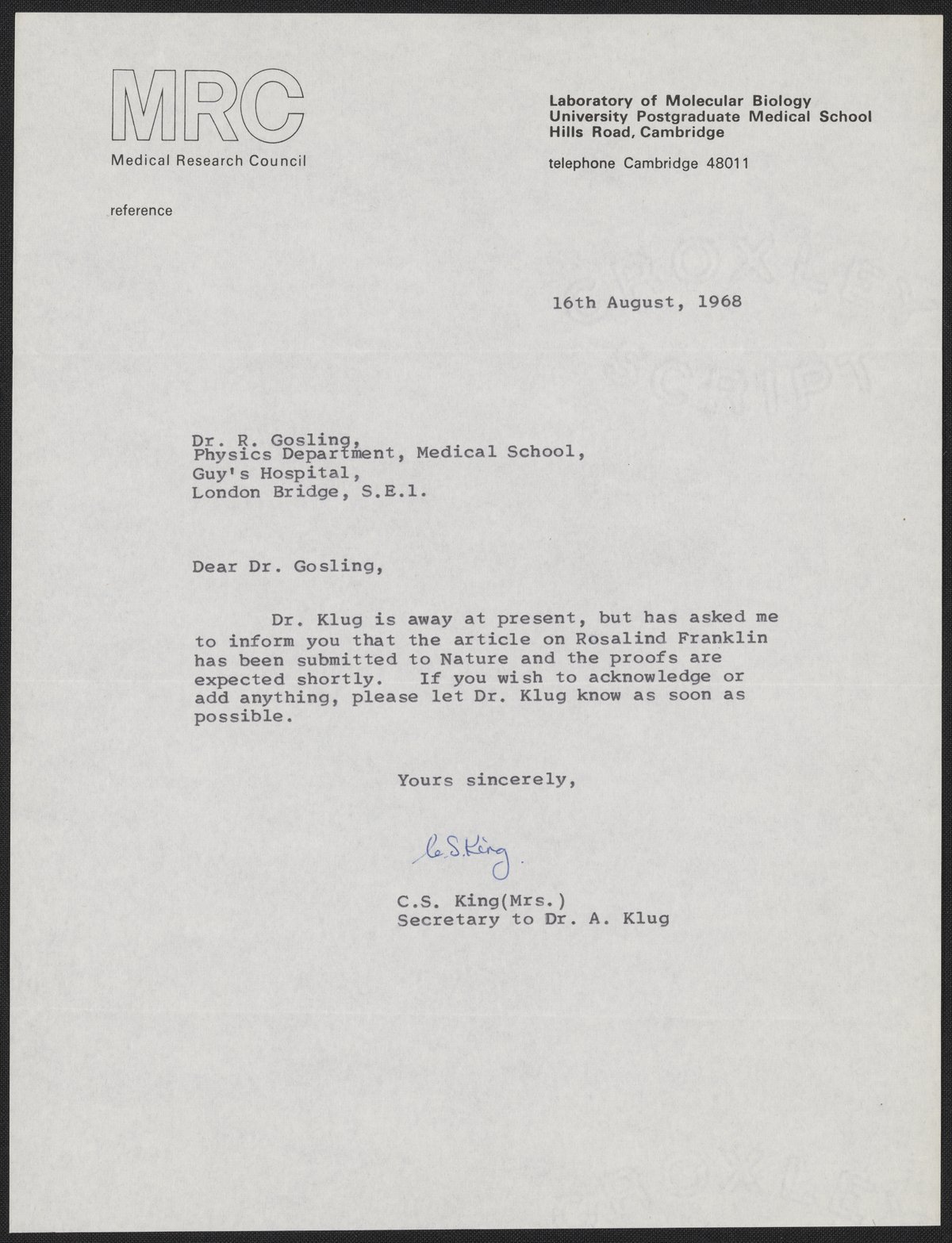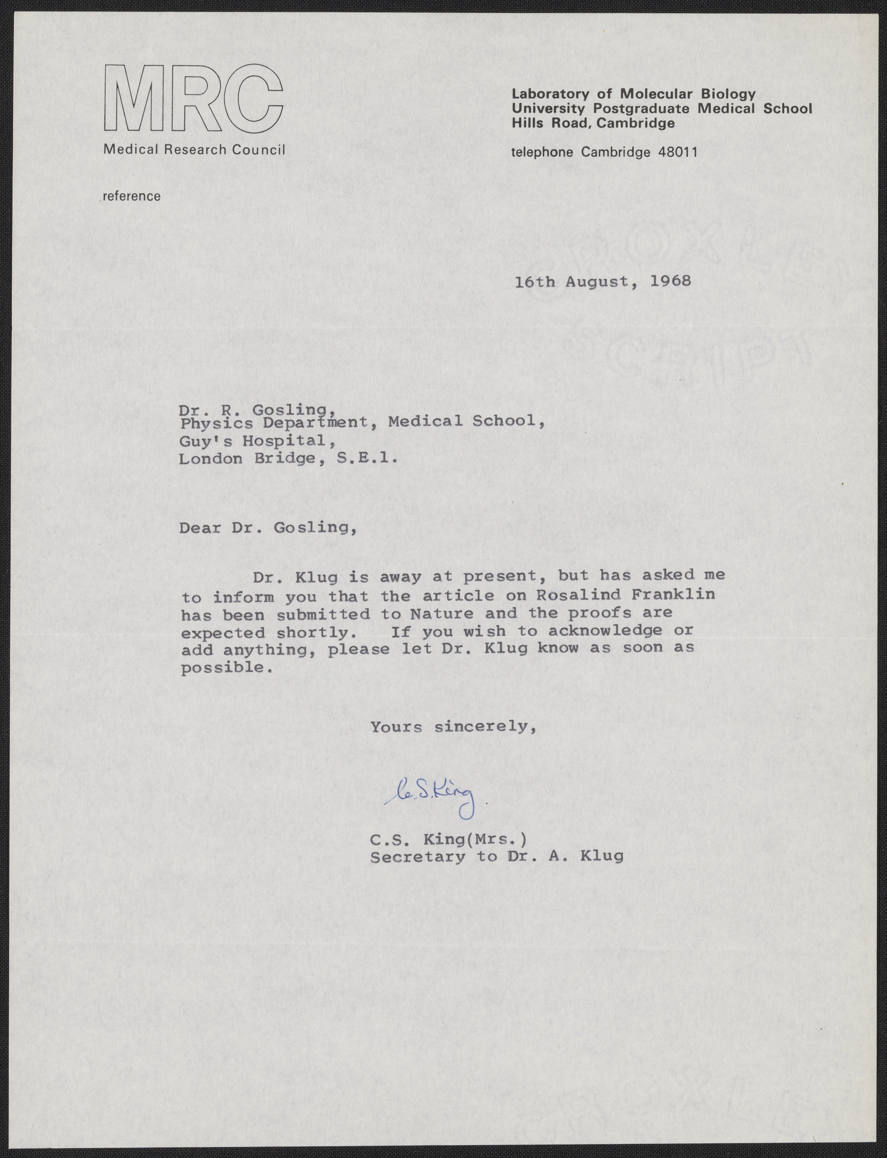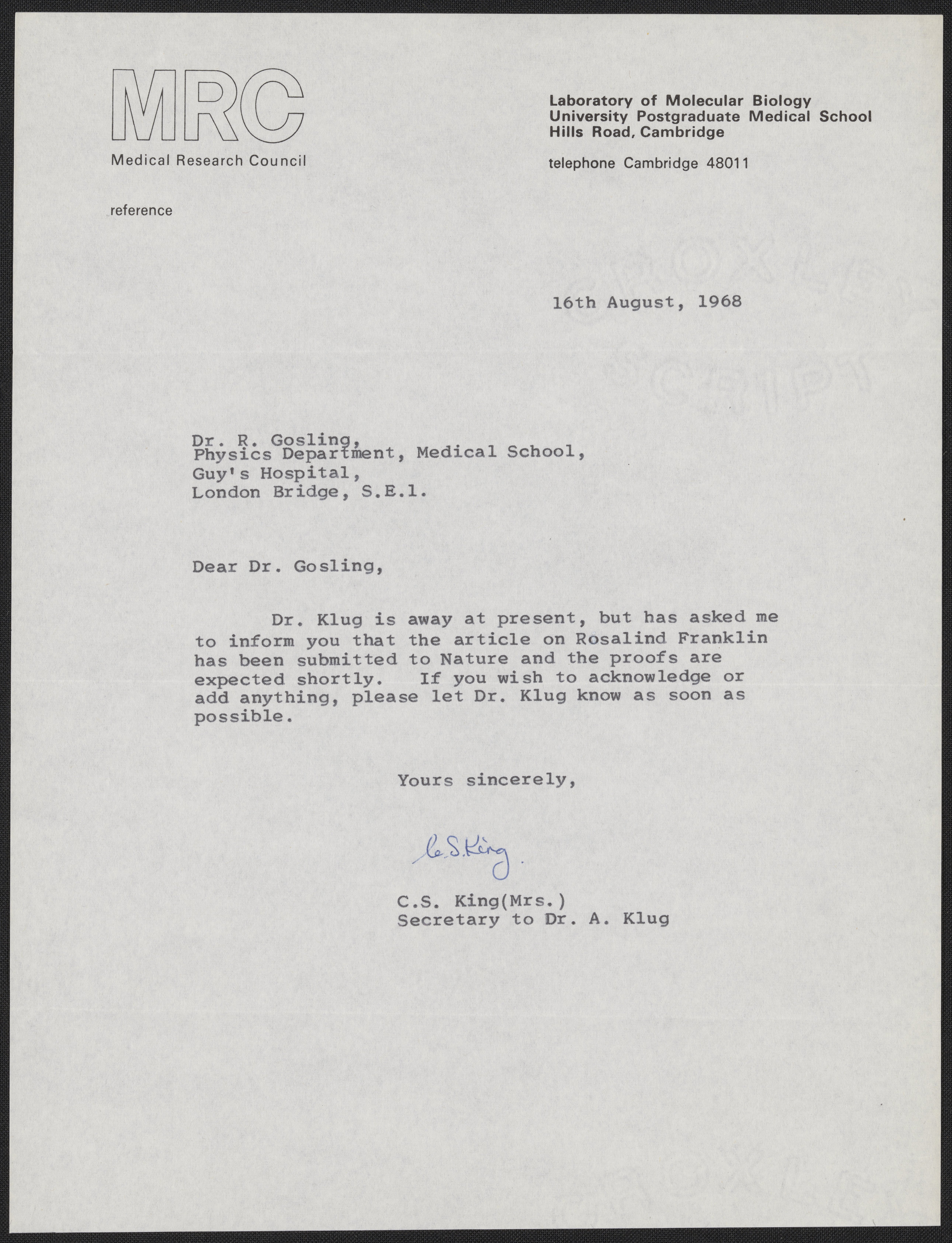 Letter to Raymond Gosling on behalf of Aaron Klug, August 16, 1968