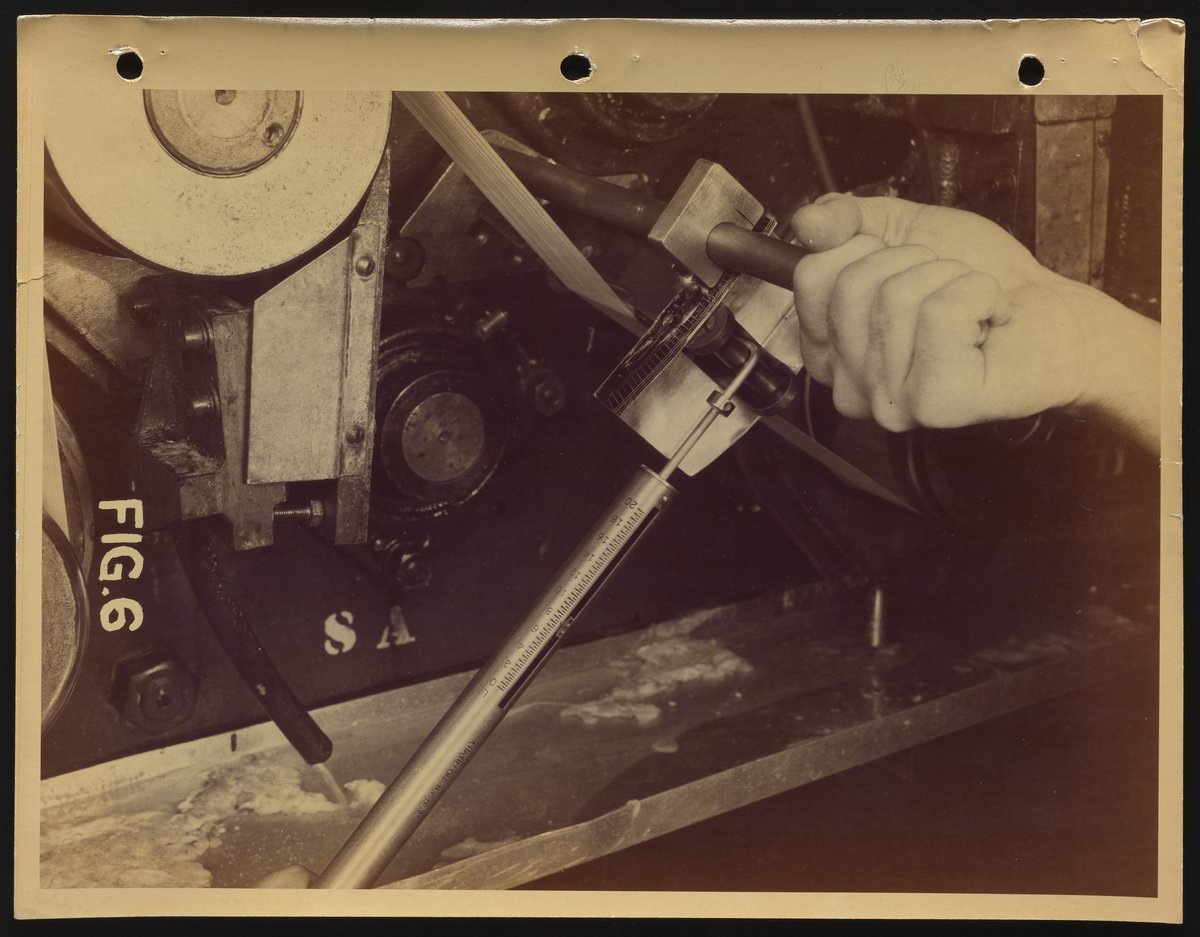 “Measuring Tension on Drawing Machine Used for Production of Nylon,” March 1947. Joseph X. Labovsky Collection of Nylon Photographs and Ephemera, Box 3. Science History Institute. Philadelphia. https://digital.sciencehistory.org/works/hq37vn659.