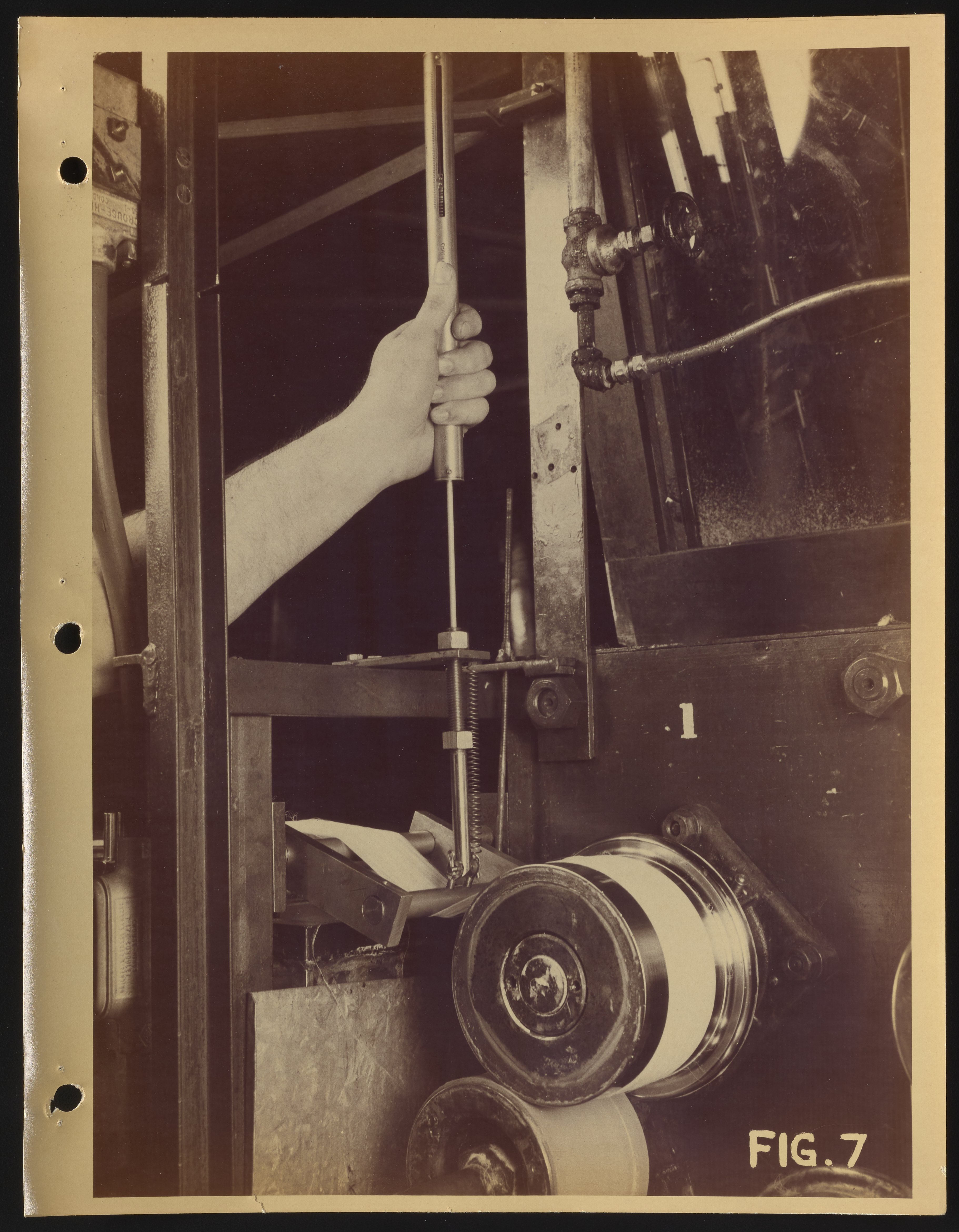 Small JPG1200 x 1542px — 252 KBLarge JPG2880 x 3702px — 1.1 MBFull-sized JPG3644 x 4684px — 1.5 MBOriginal fileTIFF — 3644 x 4684px — 48.9 MBThree close-up views of tension measurements taken on various components of a drawing machine, including the draw, creel, and crimper, used during the early stages of nylon production and research at DuPont. The photographs are labeled "Figure 6, "Figure 7," and "Figure 8," indicating that they were used in a report or publication.