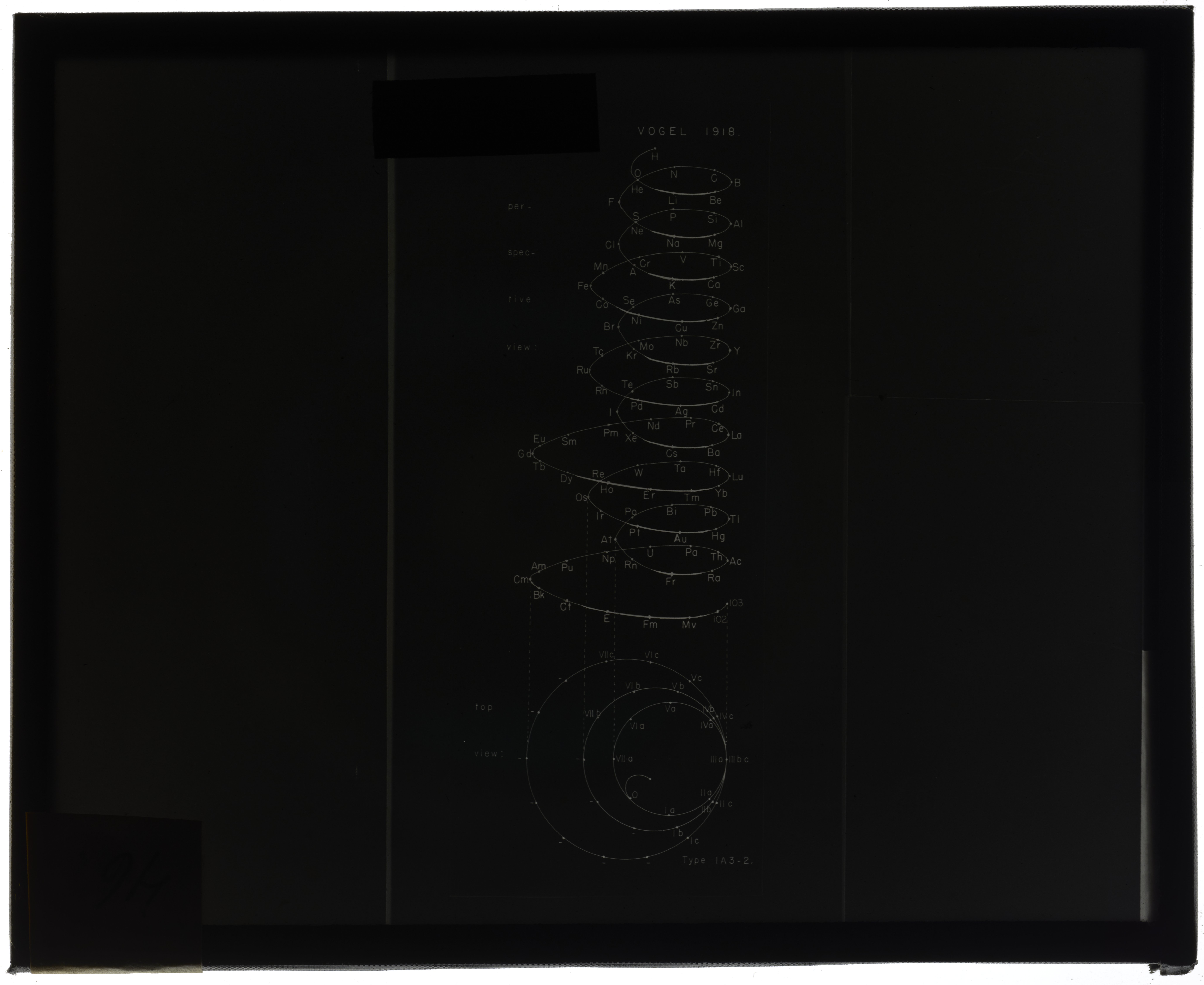 Top and perspective views of a graphic representation of the periodic table of chemical elements in the style of a helix with three sizes of revolutions for eight representative, ten transitional, and fourteen rare earth elements. This table was originated by Rudolf Vogel in 1918 and classified by chemist Edward G. Mazurs as Type IA3-2 in his seminal work Types of Graphic Representation of the Periodic System of Chemical Elements (1957). This illustration appears as Figure 38 on page 116 of Mazurs' 1957 publication.