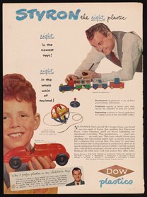 Color print advertisement for Styron 475, the trade name for Styrenic plastics historically manufactured and sold by the Dow Chemical Company for a variety of consumer applications. The advertisement features sets of small plastic toys against a blue-and-white background, with small figures of sleeping children. The accompanying text describes the use of Styron 475, "the new Dow plastics that is famous for its strength," in plastic toys and other consumer goods.