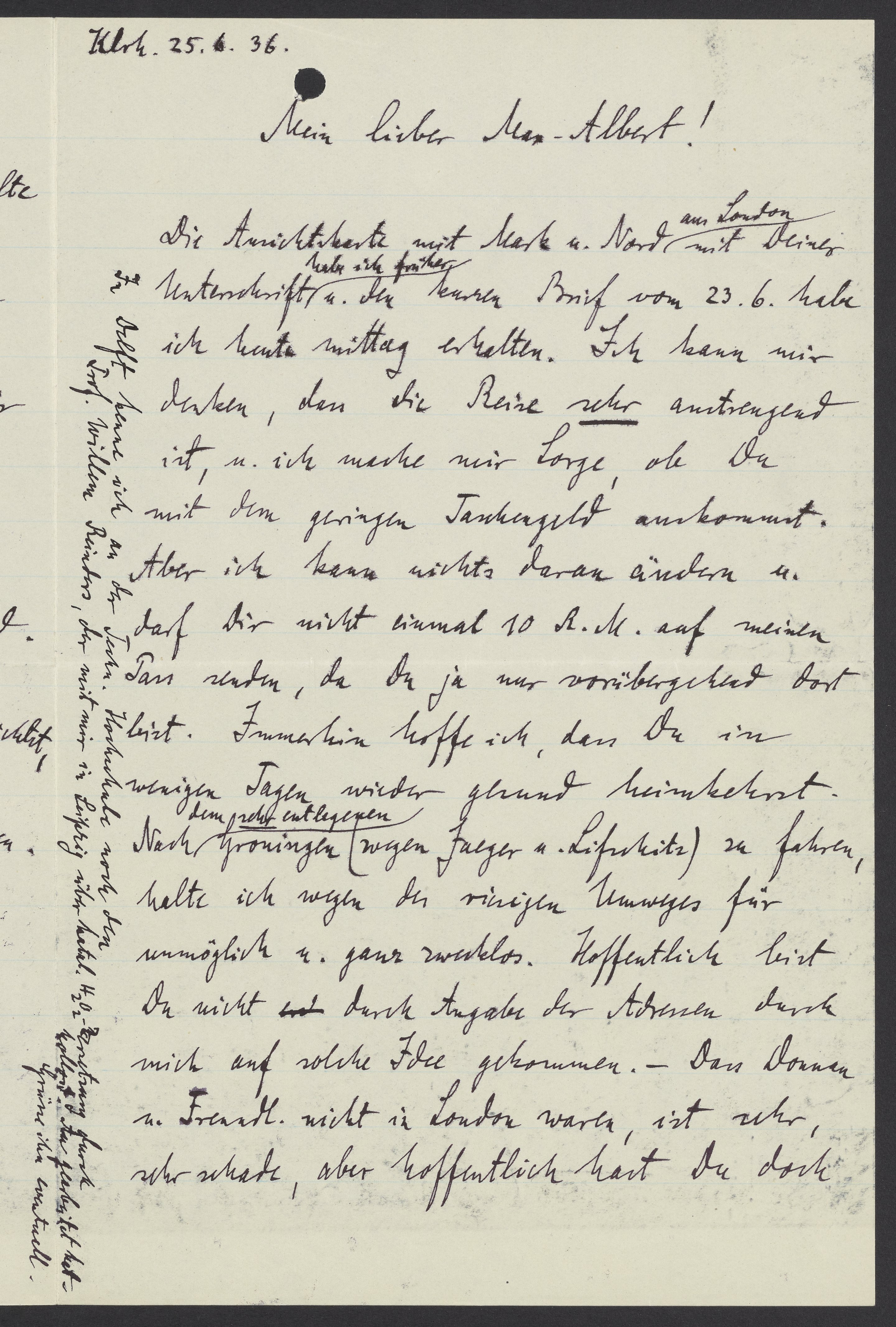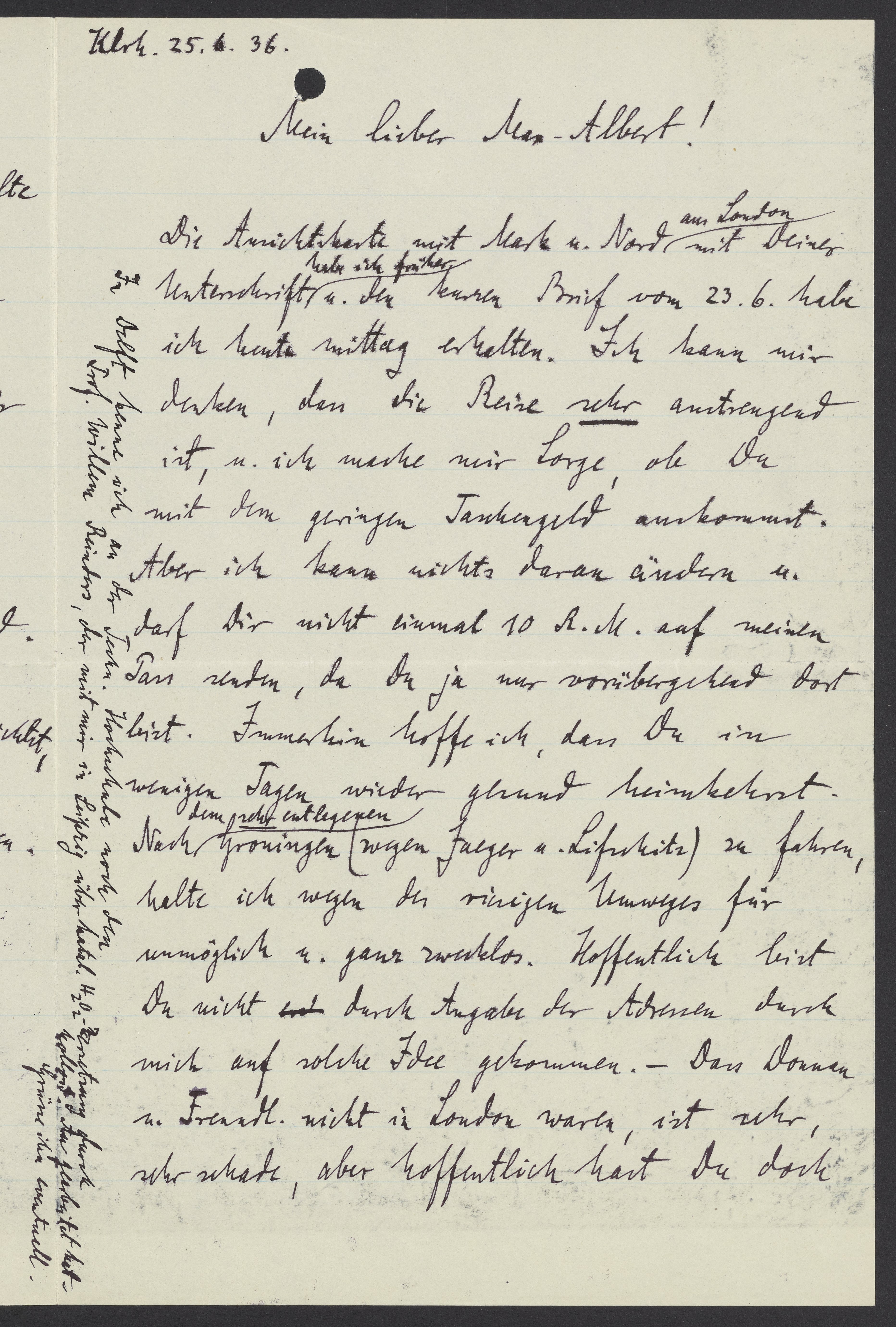 Die Ansichtskarte mit Mark u. Nord aus London mit Deiner Unterschrift habe ich früher u. den kurzen Brief vom 23. 6. habe ich heute Mittag erhalten. Ich kann mir denken, dass die Reise sehr anstrengend ist, u. ich mache mir Sorge, ob Du mit dem geringen Taschengeld auskommt. Aber ich kann nichts daran ändern u. darf Dir nicht einmal 10 R.M. auf meinen Pass senden, da Du ja nur vorübergehend dort bist. Immerhin hoffe ich, dass Du in wenigen Tagen wieder gesund heimkommst.