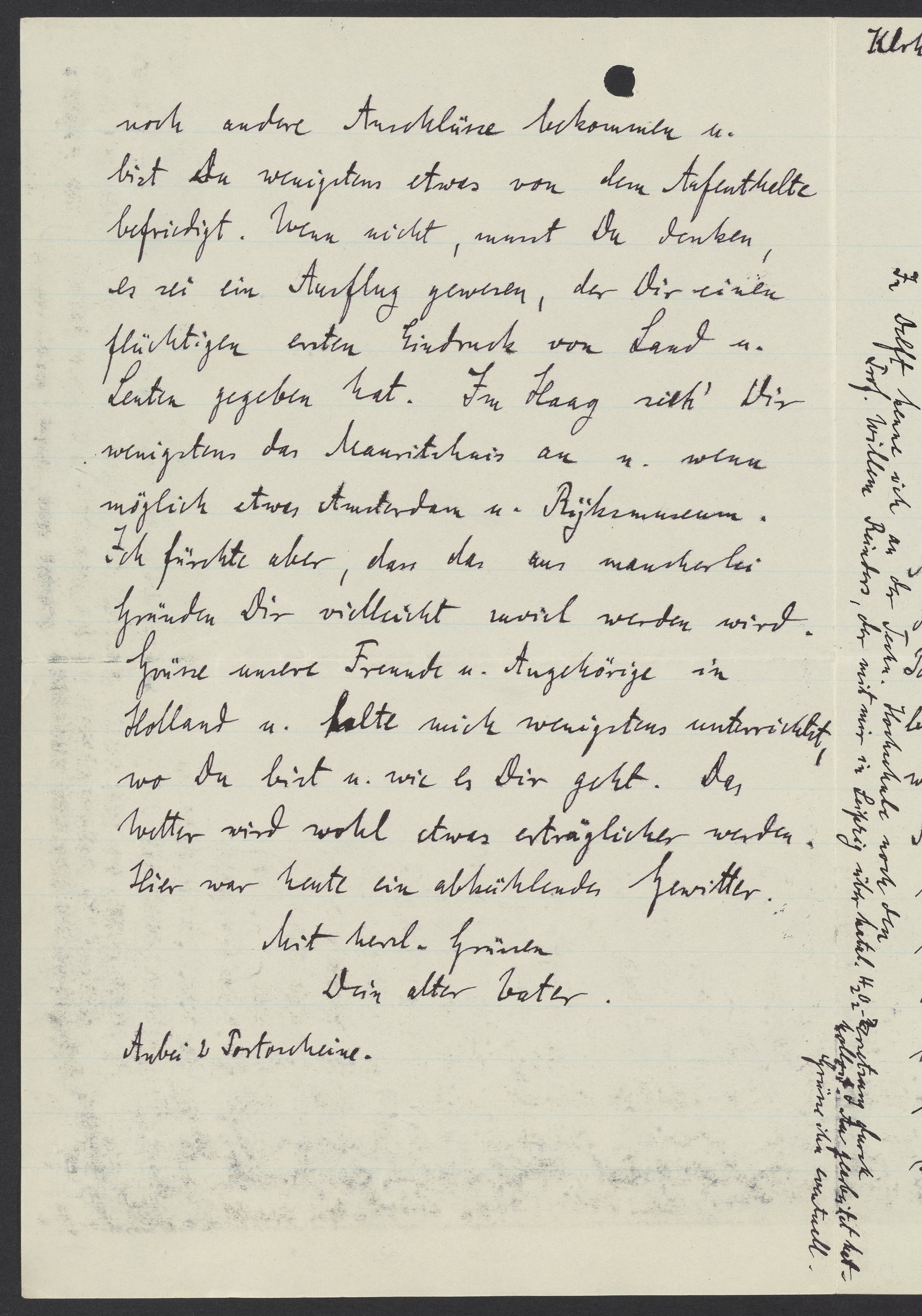 noch andere Anschlüsse bekommen u. bist Du wenigstens etwas von dem Aufenthalte befriedigt. Wenn nicht, musst Du denken, es sei ein Ausflug gewesen, der Dich einen flüchtigen ersten Eindruck von Land u. Leuten gegeben hast. Im Haag sieh Dir wenigstens das Mauritshuis an und wenn möglich etwas Amsterdam u. Rijksmuseum. Ich fürchte aber, dass das aus mancherlei Gründen Dir vielleicht zuviel werden wird.
