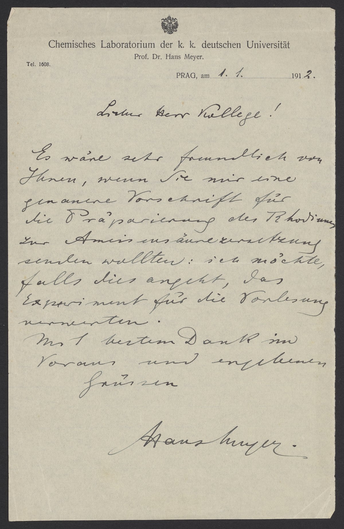 Letter from Hans Meyer (1858 -1929) a geographer and professor at the University of Leipzig. Meyer asks Georg Bredig (1868-1944) about the preparation of rhodium.