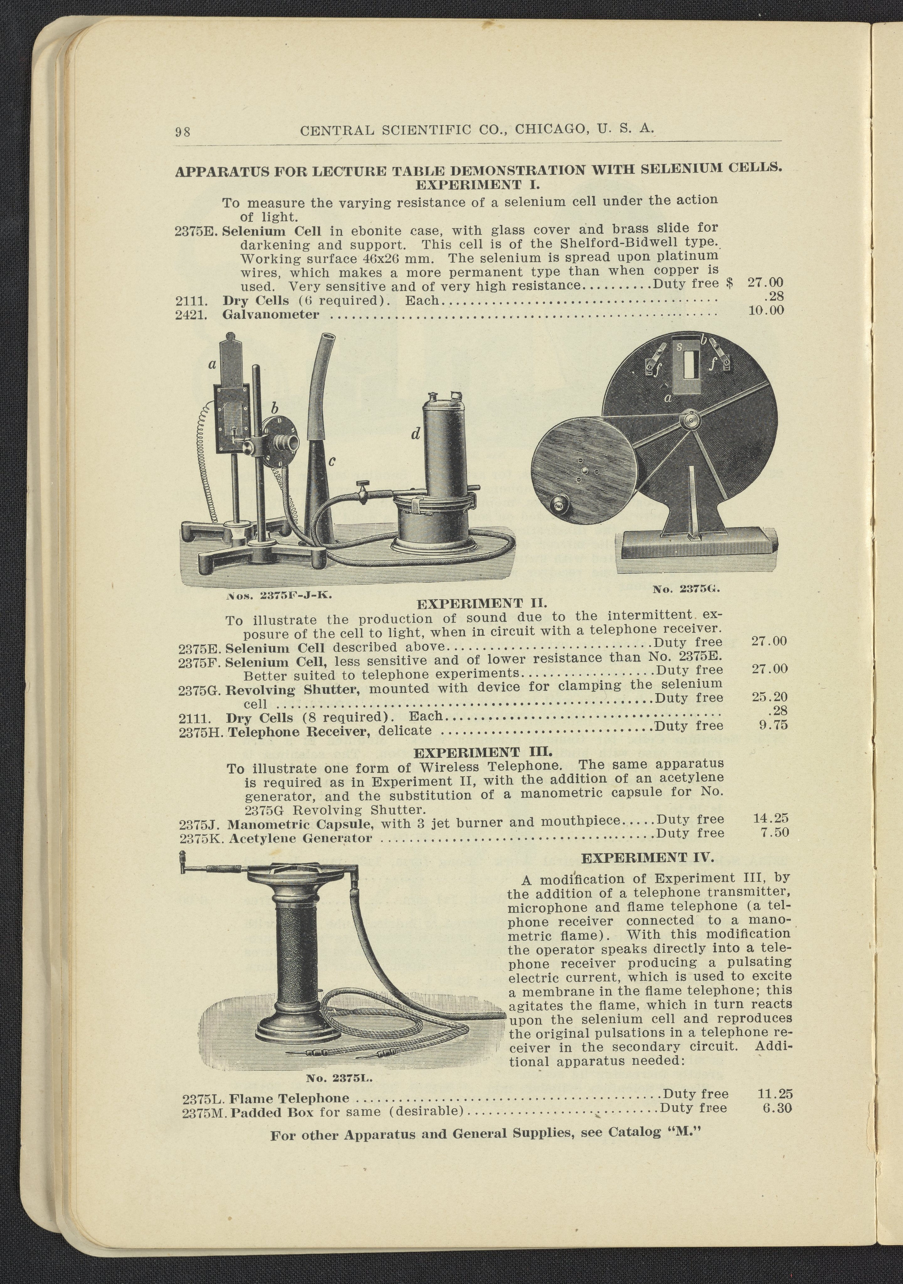 Central Scientific Company. “Apparatus for Lecture Table Demontration with Selenium Cells.” Physical Apparatus for Universities and Colleges Manufactured and Imported by Central Scientific Co. Chicago, Illinois: Central Scientific Company, 1912. Q185.7 .C46 1912. Science History Institute. Philadelphia. https://digital.sciencehistory.org/works/hteif0y.