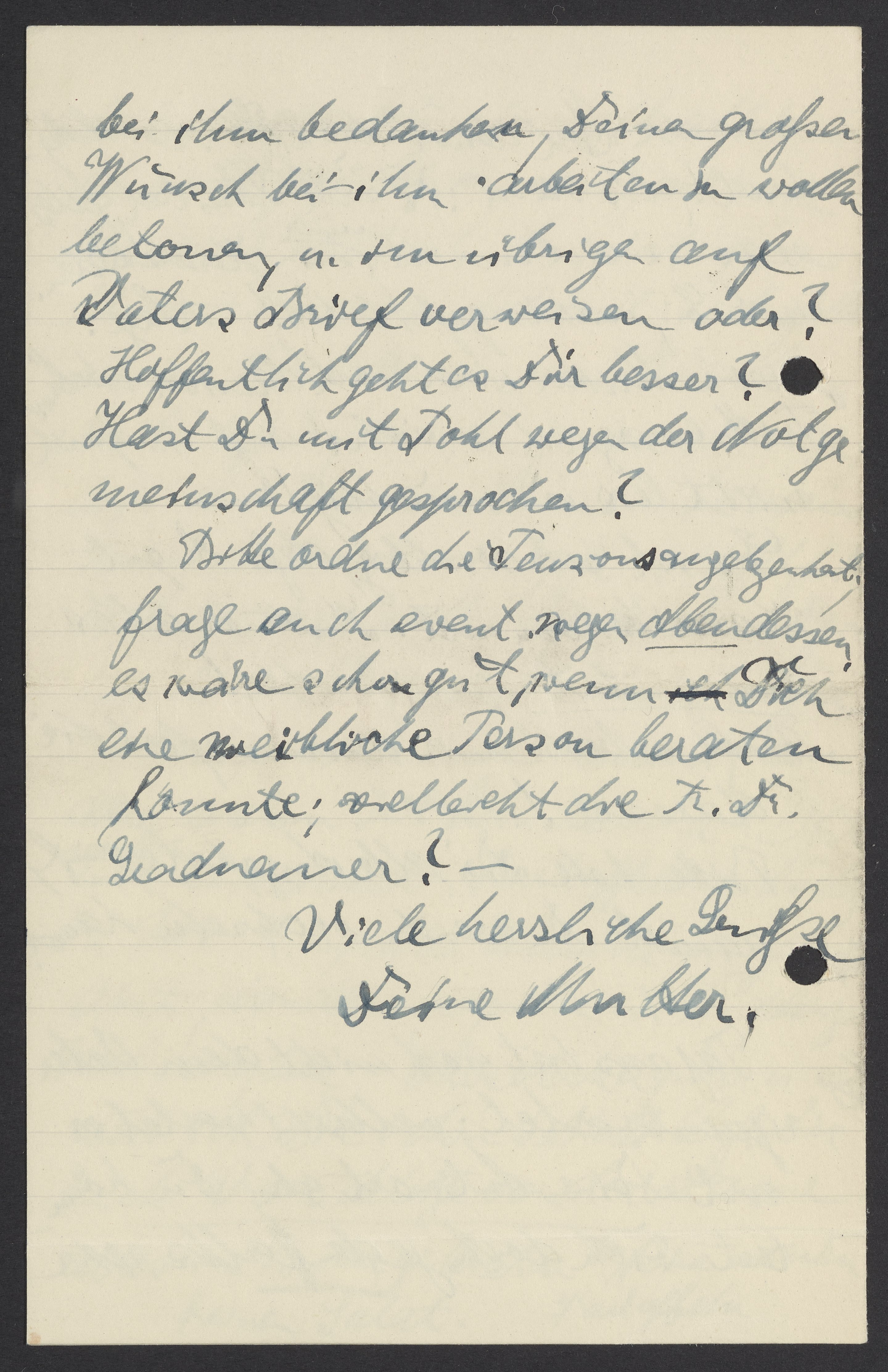 Bitte ordne die Pensionsangelegenheit; frage auch event. wegen Abendessen, es wäre schon gut, wenn Dich eine weibliche Person beraten könnte; vielleicht die Fr. Dr. Gradnauer? –