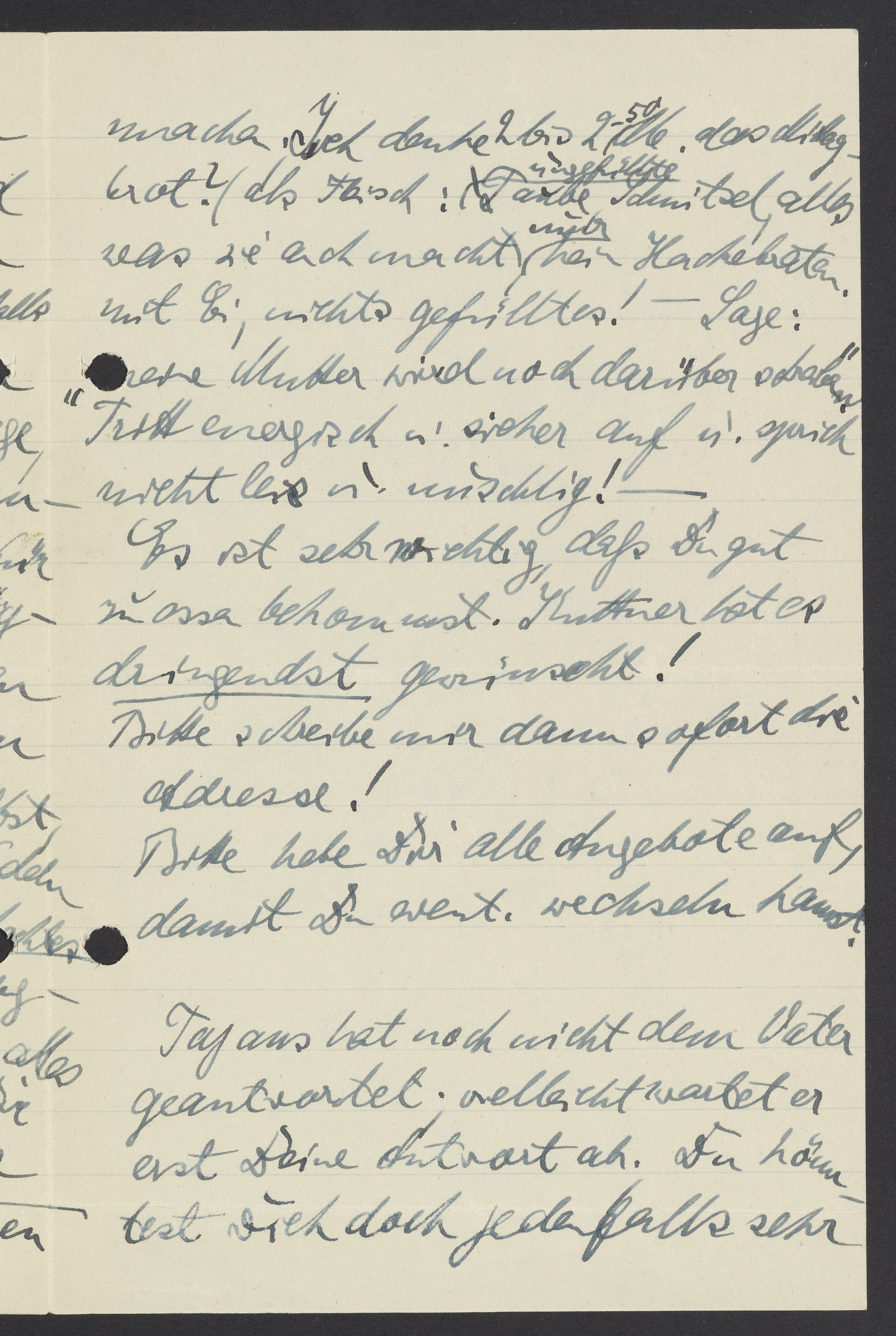 machen. Ich denke 2 bis 2,50 M. das Mittagbrot? Als Fleisch: ungefüllte Taube, Schnitzel, alles was sie auch macht, nur kein Hackebraten mit Ei, nichts gefülltes! – Sage: „Meine Mutter wird noch darüber schreiben.“ Tritt energisch u. sicher auf u. sprich nicht leise u. nuschlig! – Es ist sehr wichtig, daß Du gut zu essen bekommst. Kuttner hat es dringendst gewünscht! Bitte schreibe mir dann sofort die Adresse! Bitte hebe Dir alle Angebote auf, damit Du event. wechseln kannst!