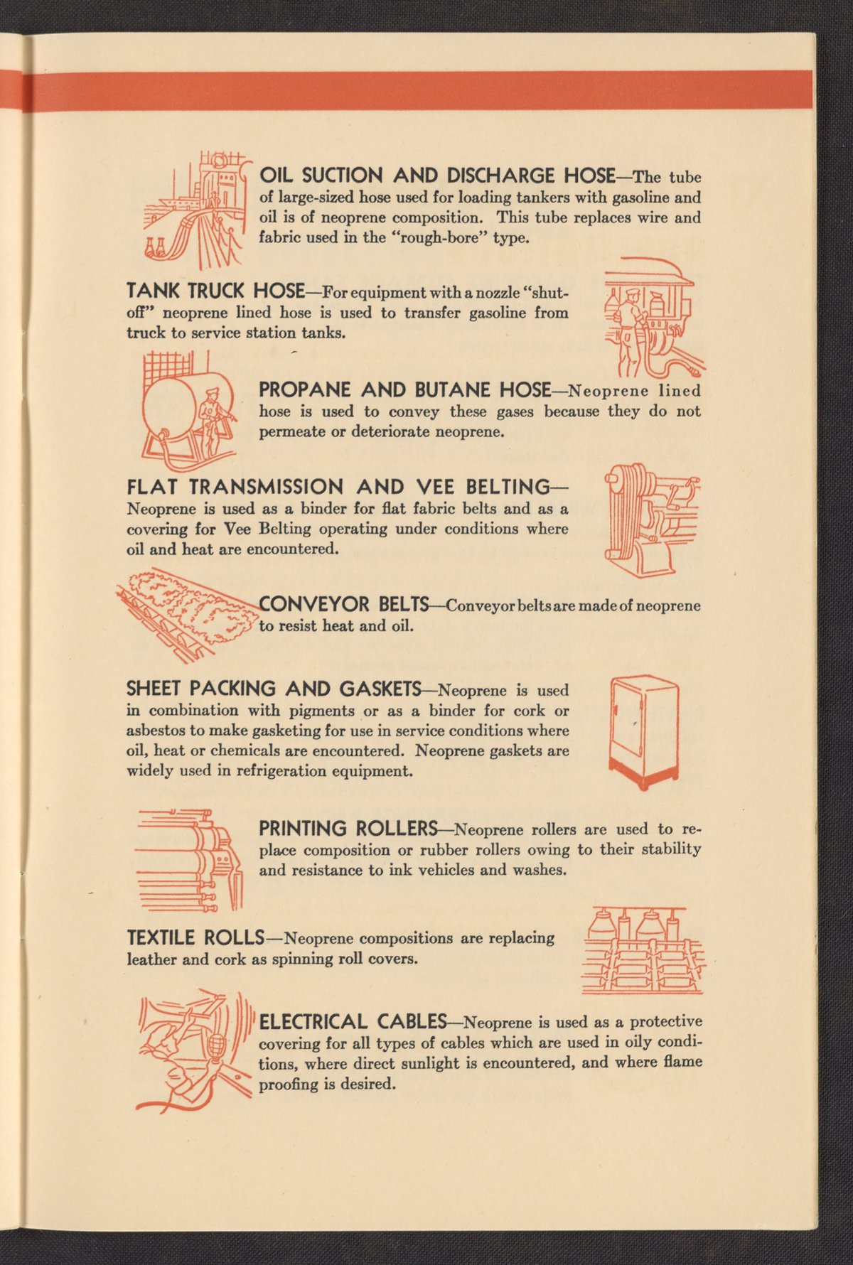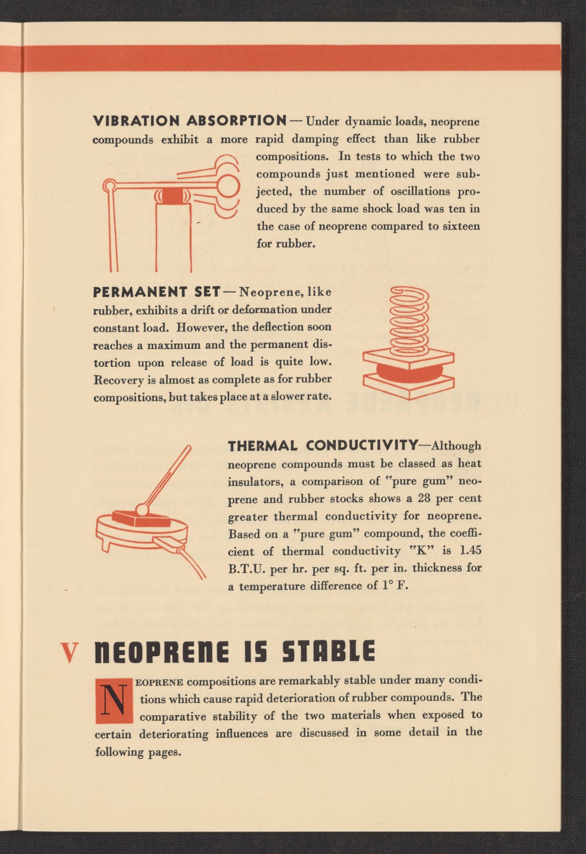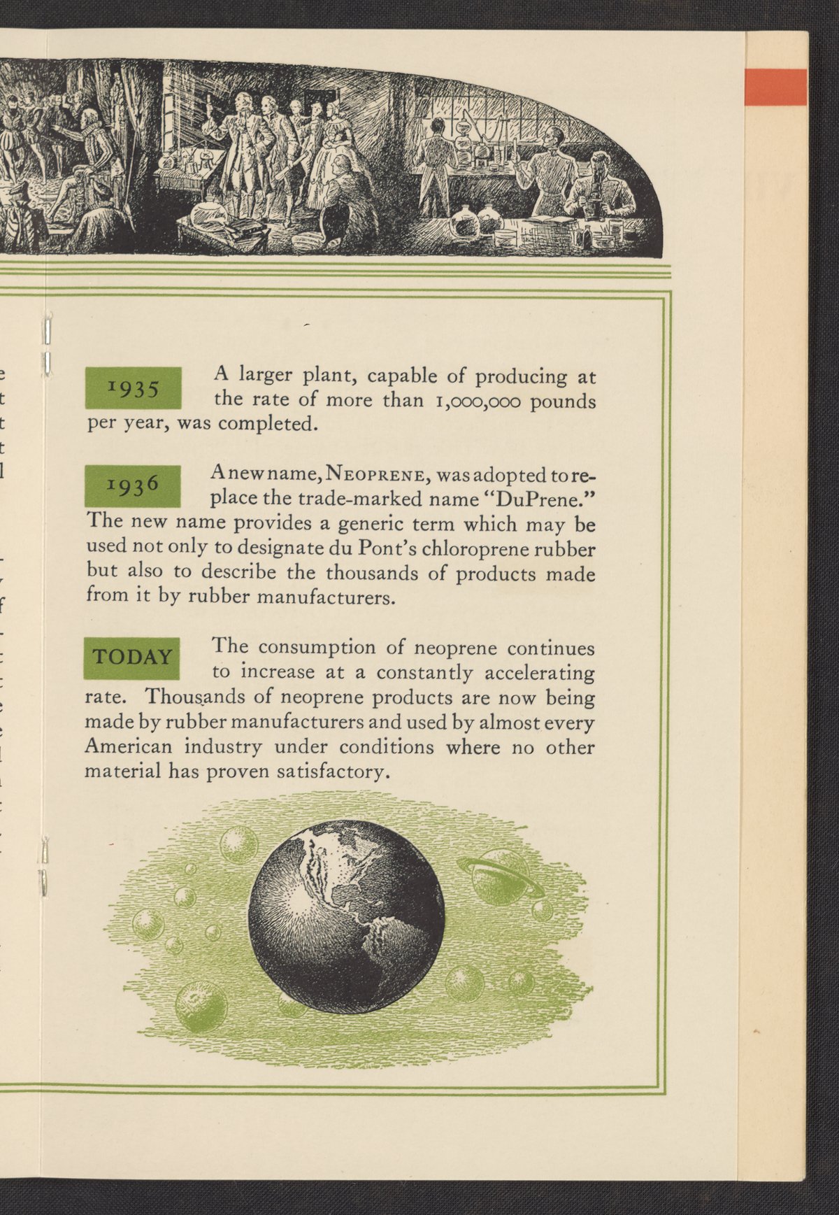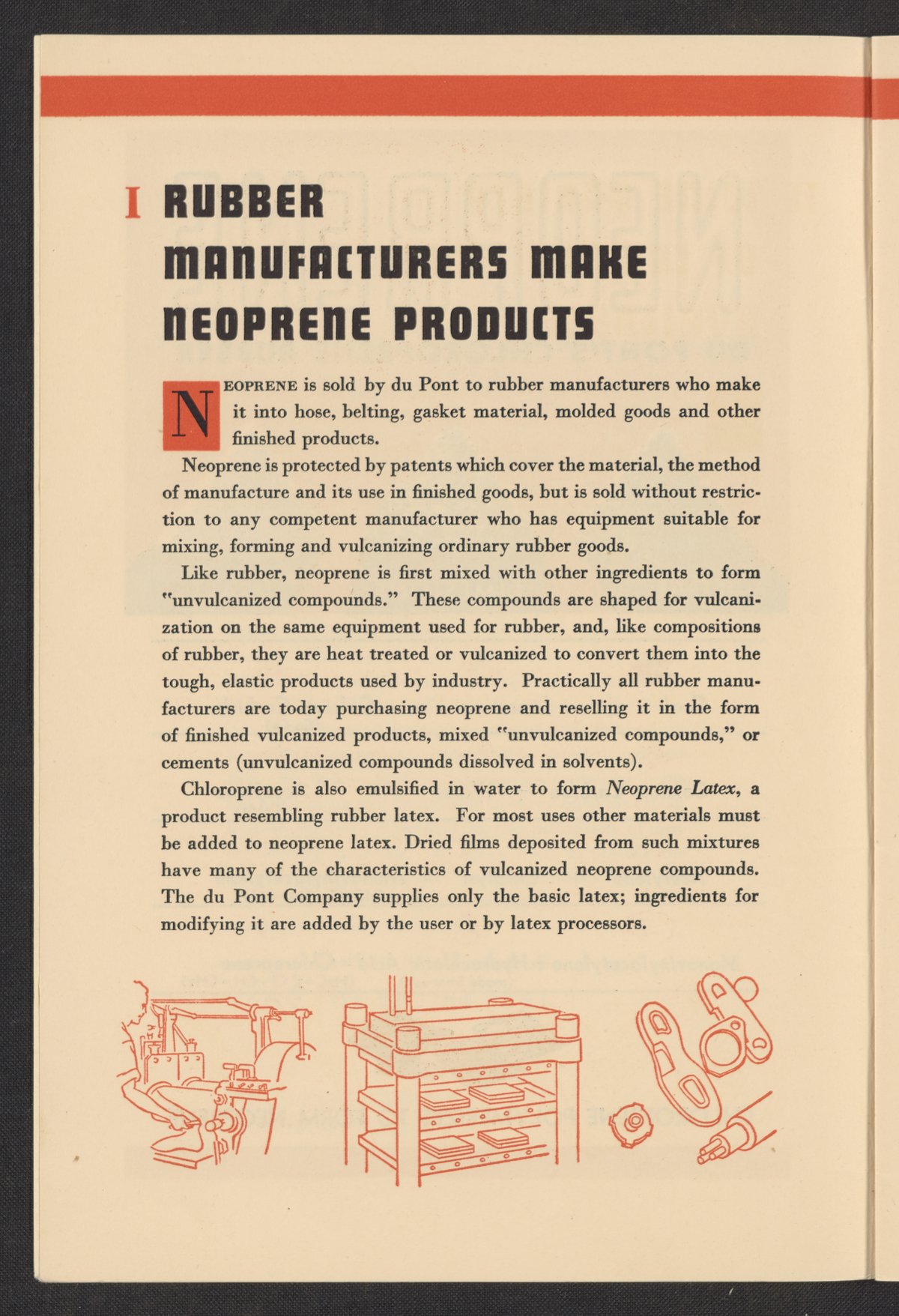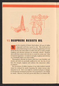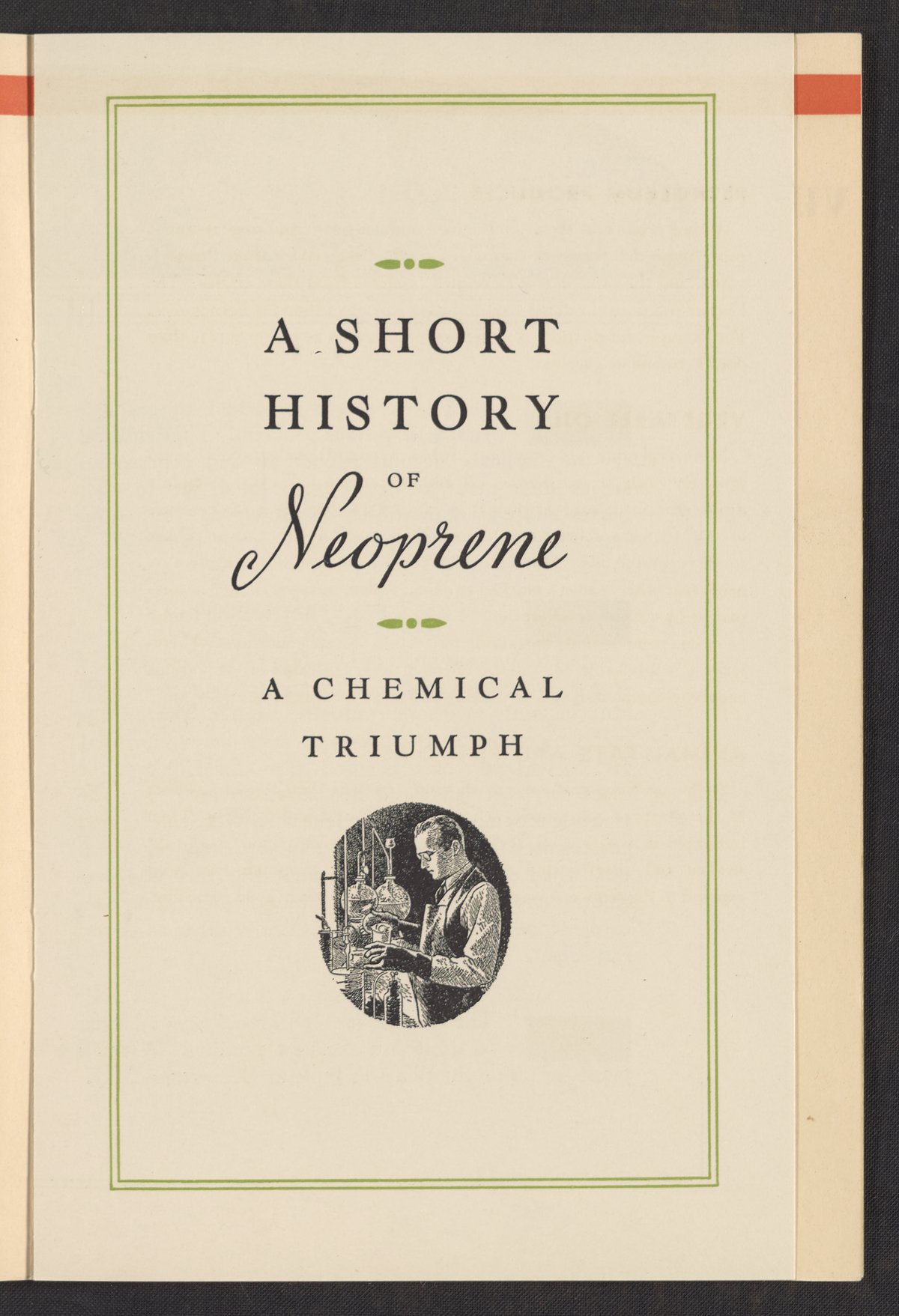 Small JPG1200 x 1743px — 396 KBFull-sized JPG2636 x 3829px — 1.8 MBOriginal fileTIFF — 2636 x 3829px — 28.9 MBPromotional booklet describing Neoprene, a rubber-like material made from polymerized chloroprene manufactured and sold by the E. I. du Pont de Nemours & Company. The publication describes the basic chemical and physical properties of the material, its potential uses, product varieties, and its desirable qualities for industrial applications. Includes an interleaved pamphlet titled A Short History of Neoprene: A Chemical Triumph, which provides a brief timeline of the substance's development, beginning in 1925 and ending with a note on future considerations.
