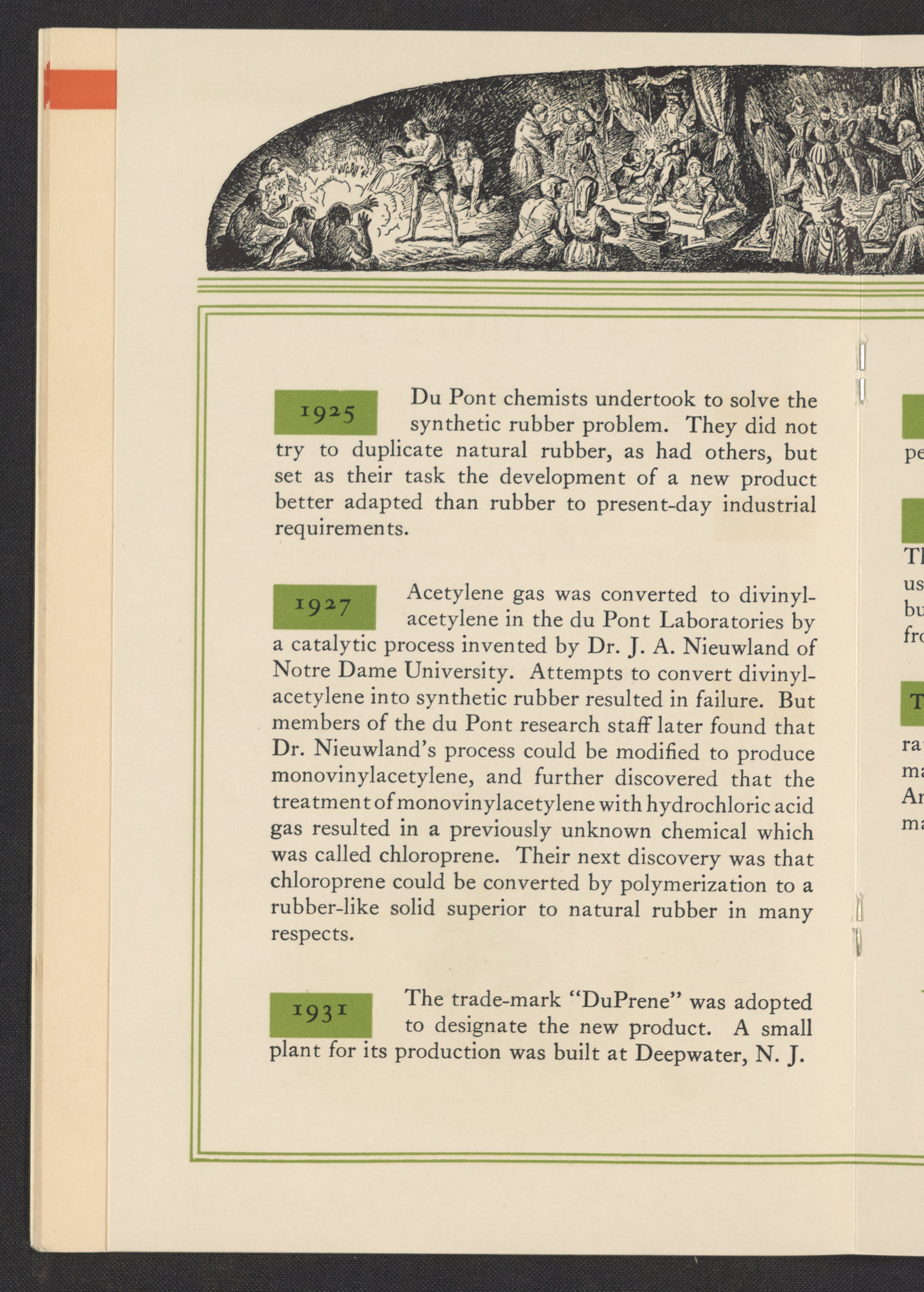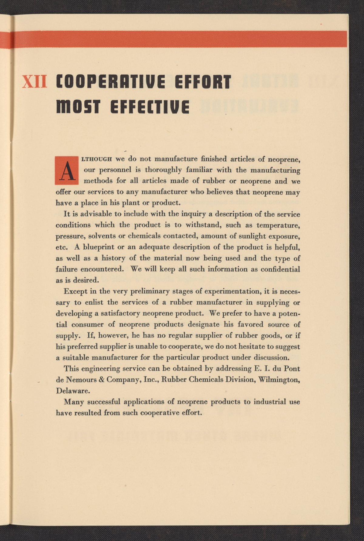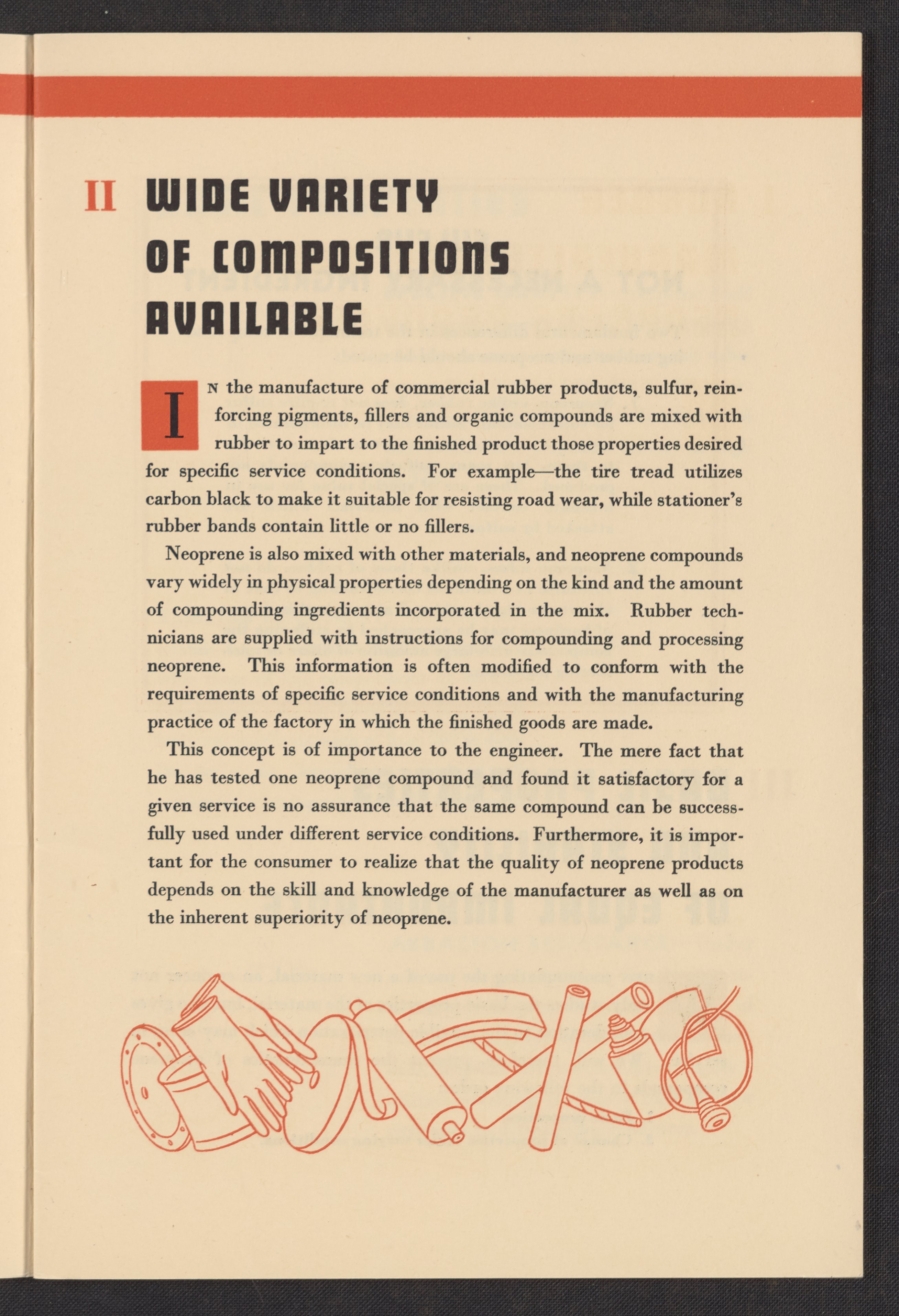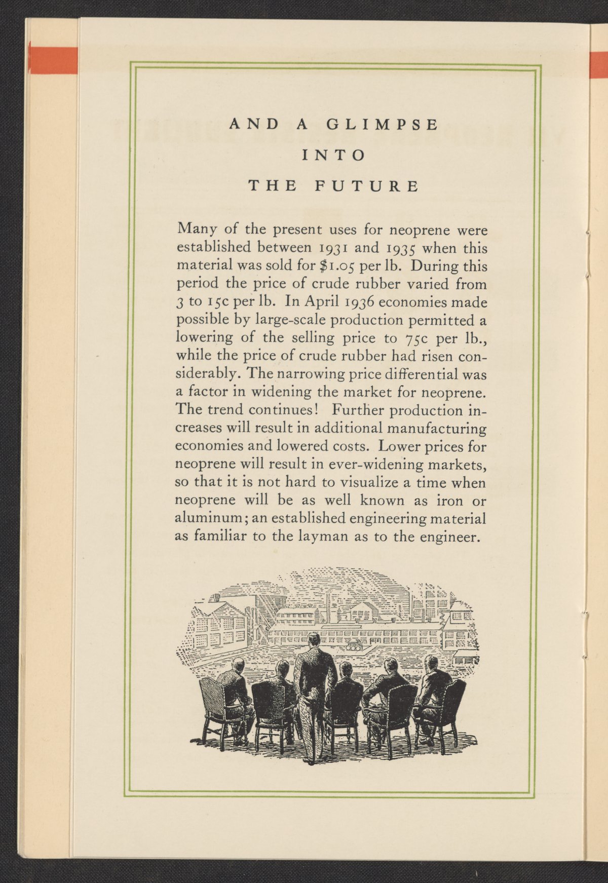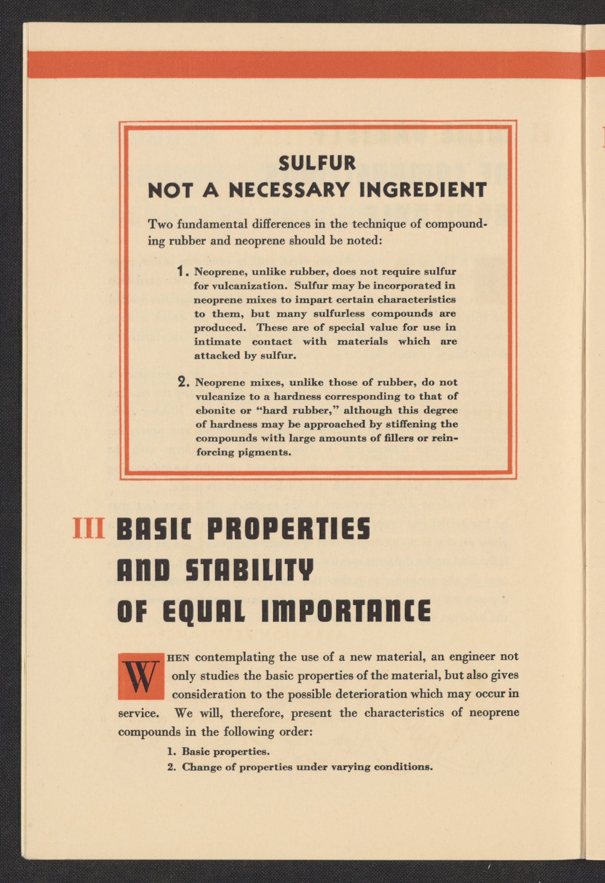 Small JPG1200 x 1743px — 396 KBFull-sized JPG2636 x 3829px — 1.8 MBOriginal fileTIFF — 2636 x 3829px — 28.9 MBPromotional booklet describing Neoprene, a rubber-like material made from polymerized chloroprene manufactured and sold by the E. I. du Pont de Nemours & Company. The publication describes the basic chemical and physical properties of the material, its potential uses, product varieties, and its desirable qualities for industrial applications. Includes an interleaved pamphlet titled A Short History of Neoprene: A Chemical Triumph, which provides a brief timeline of the substance's development, beginning in 1925 and ending with a note on future considerations.