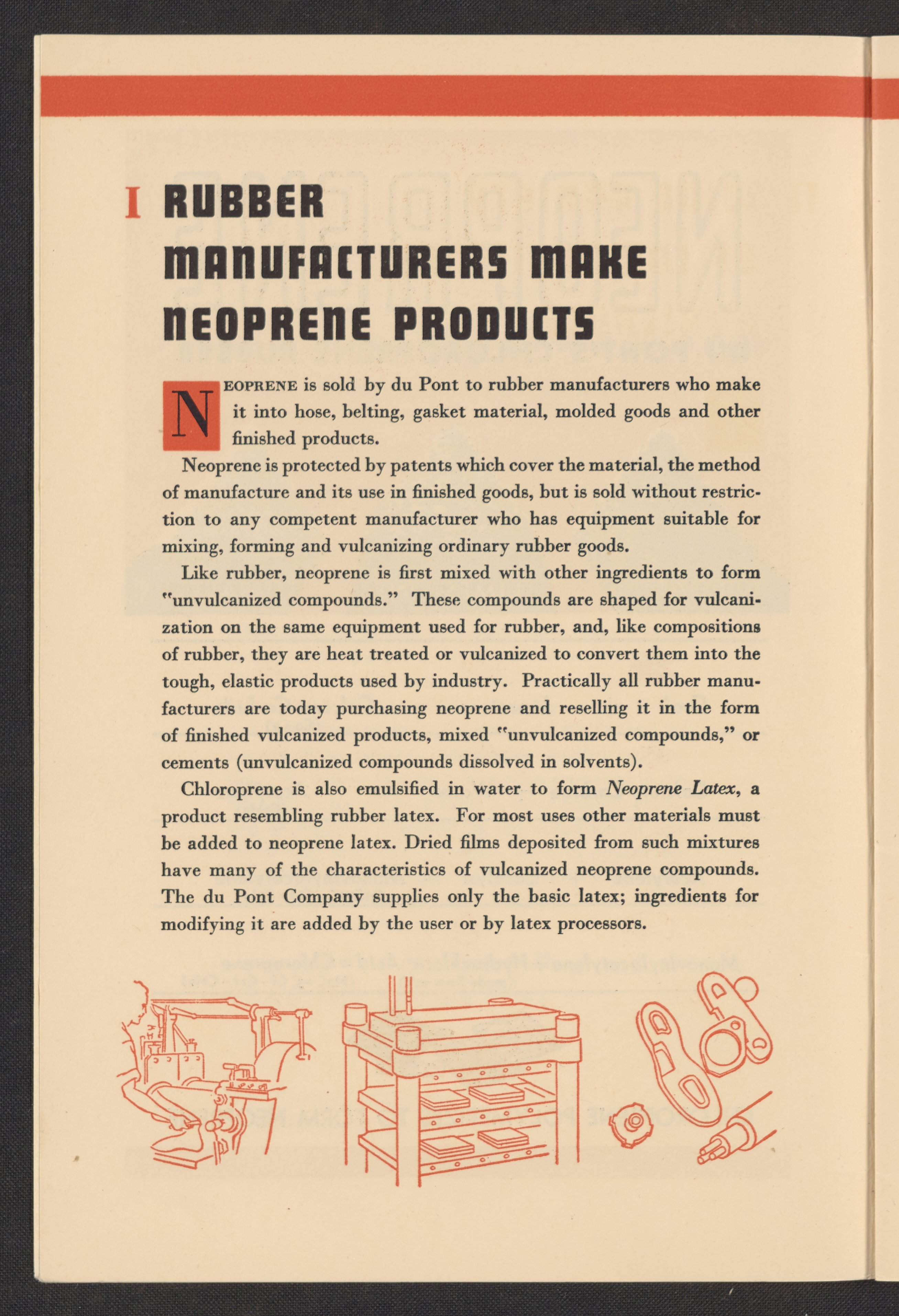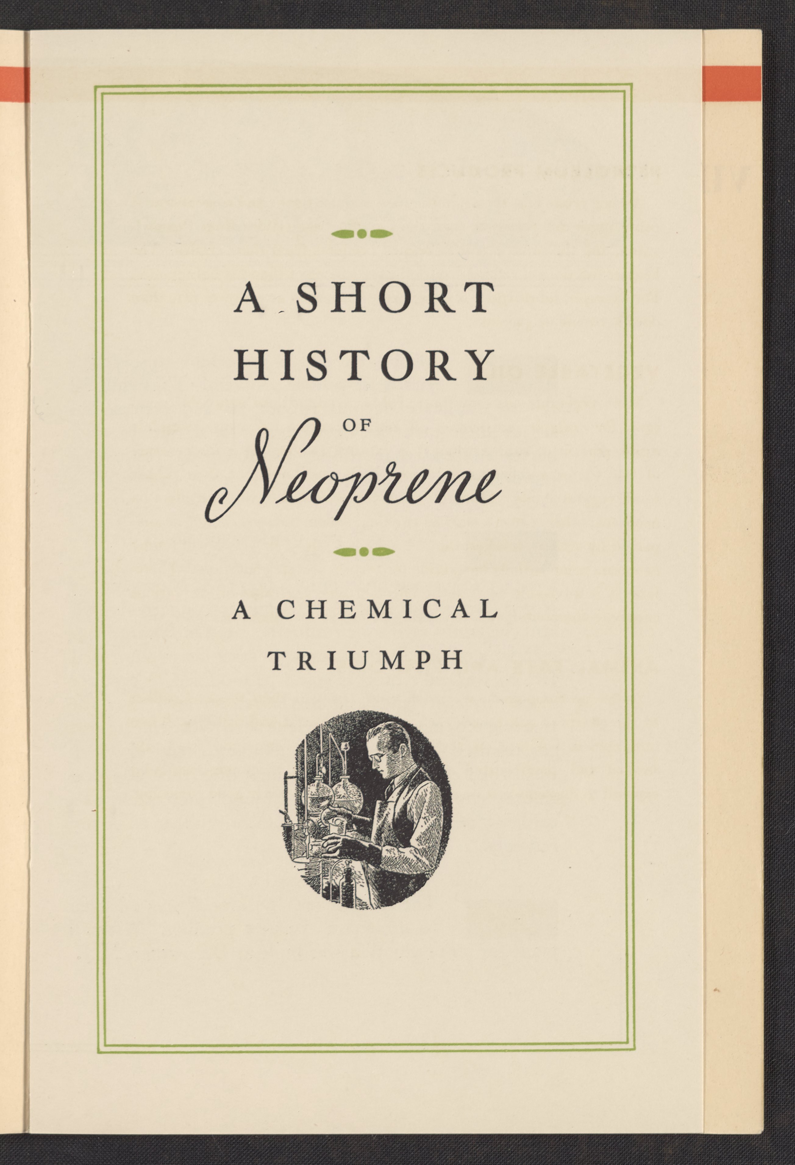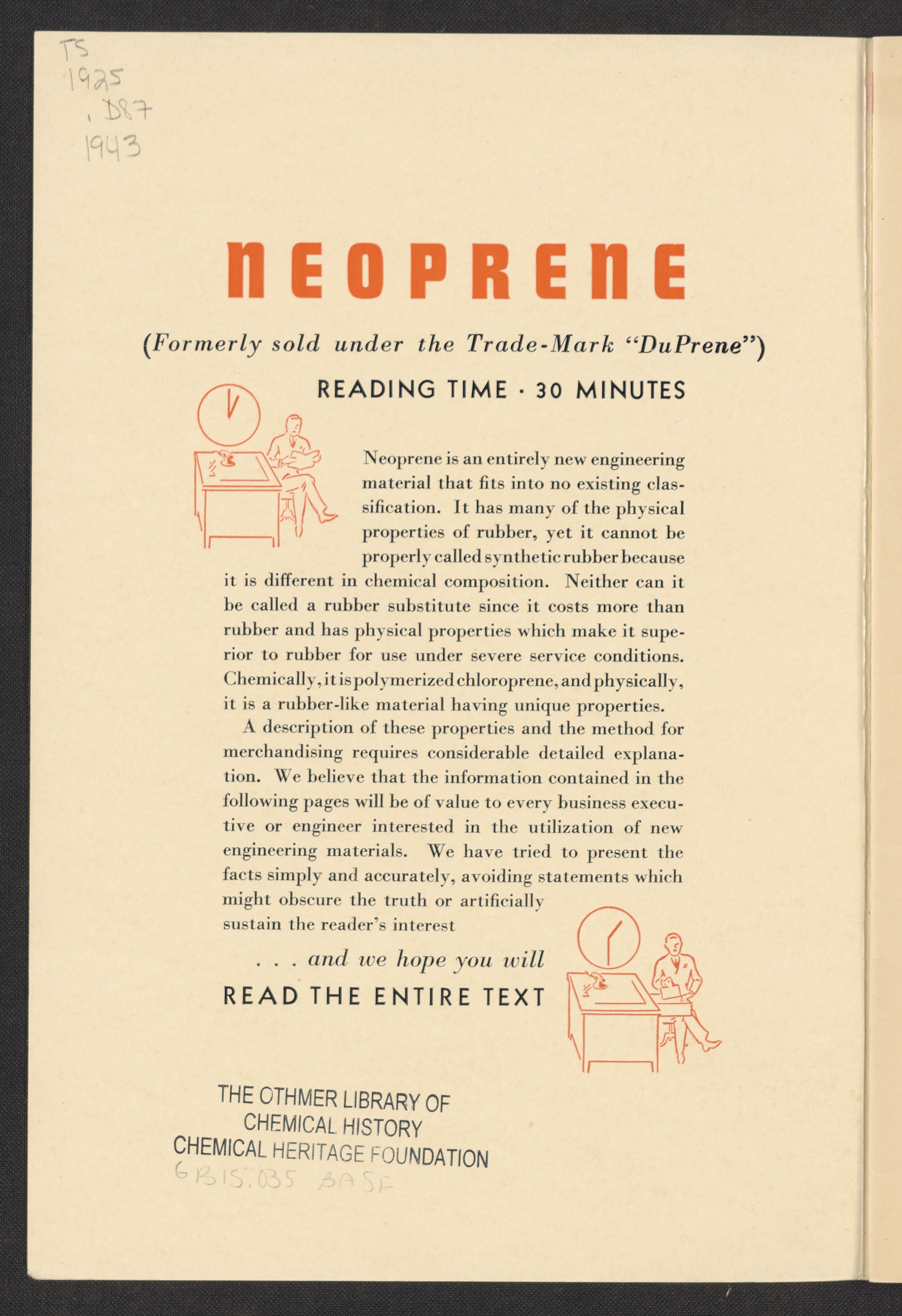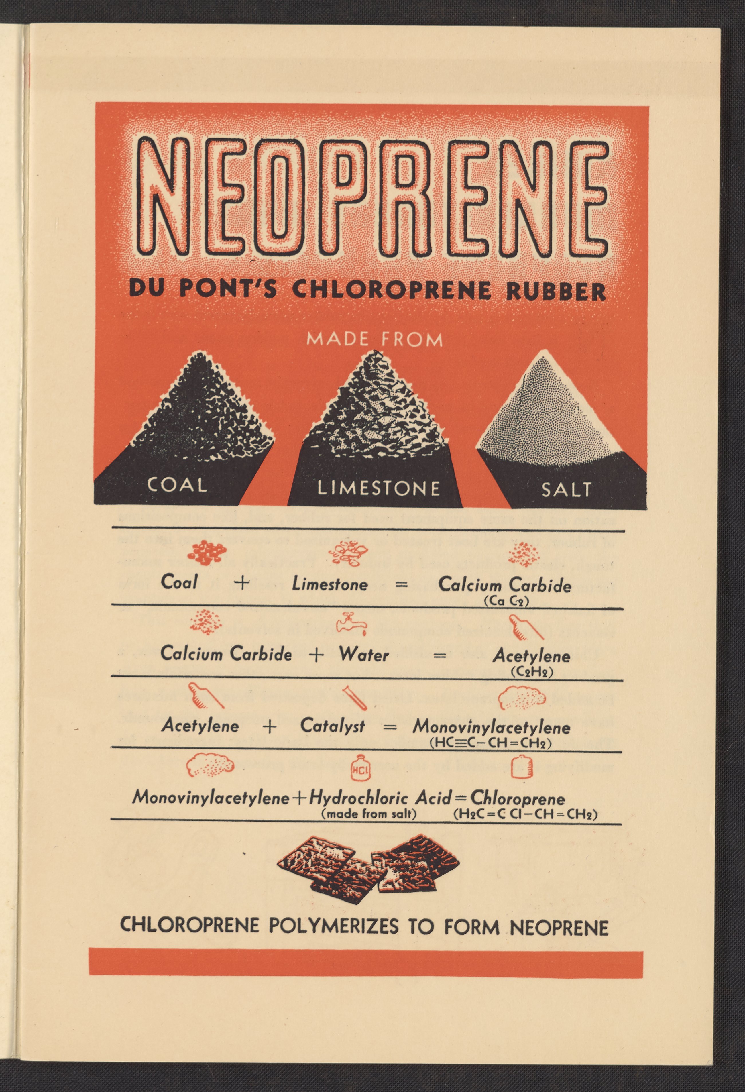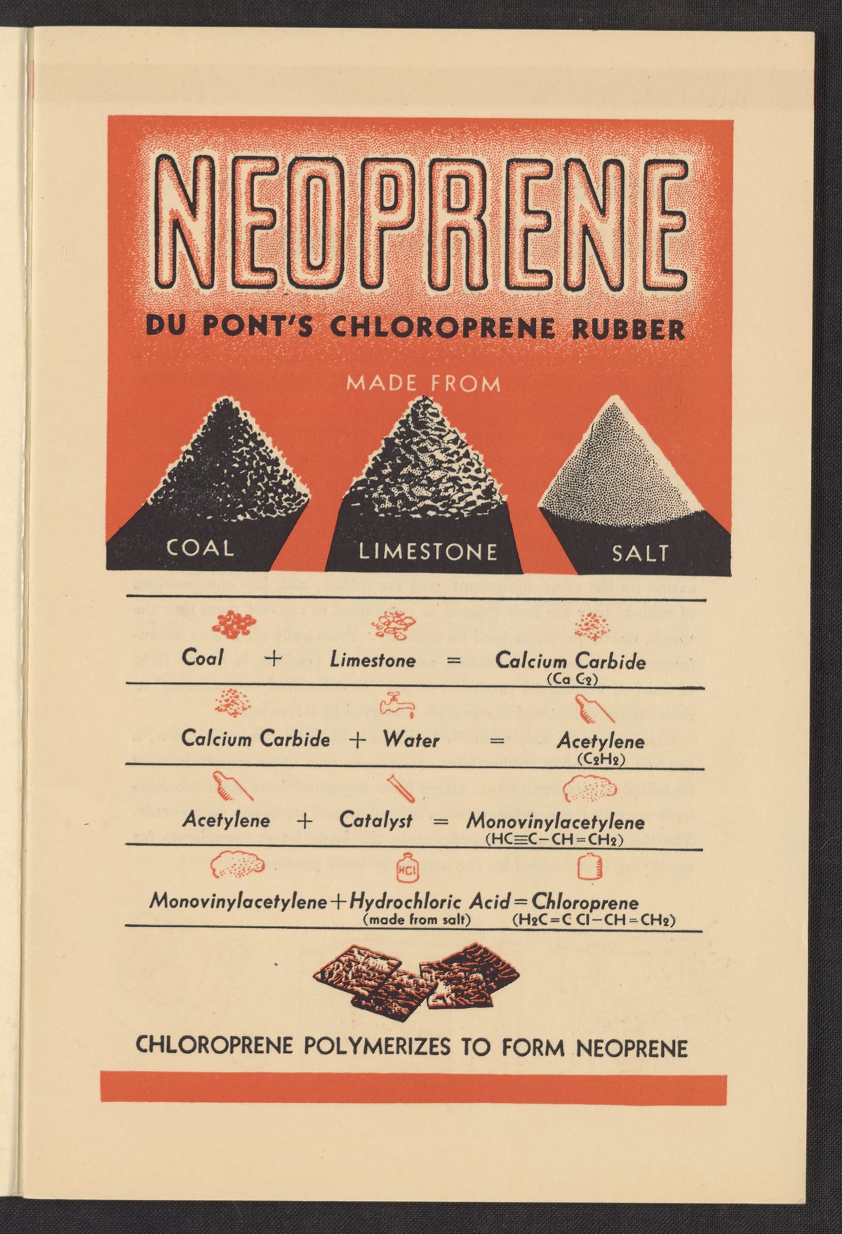 E.I. du Pont de Nemours & Company. Rubber Chemicals Division. “Neoprene A Remarkable Engineering Material.” Wilmington, Delaware, 1943. TS1925 .D87 1943. Science History Institute. Philadelphia. https://digital.sciencehistory.org/works/hw7347x.
