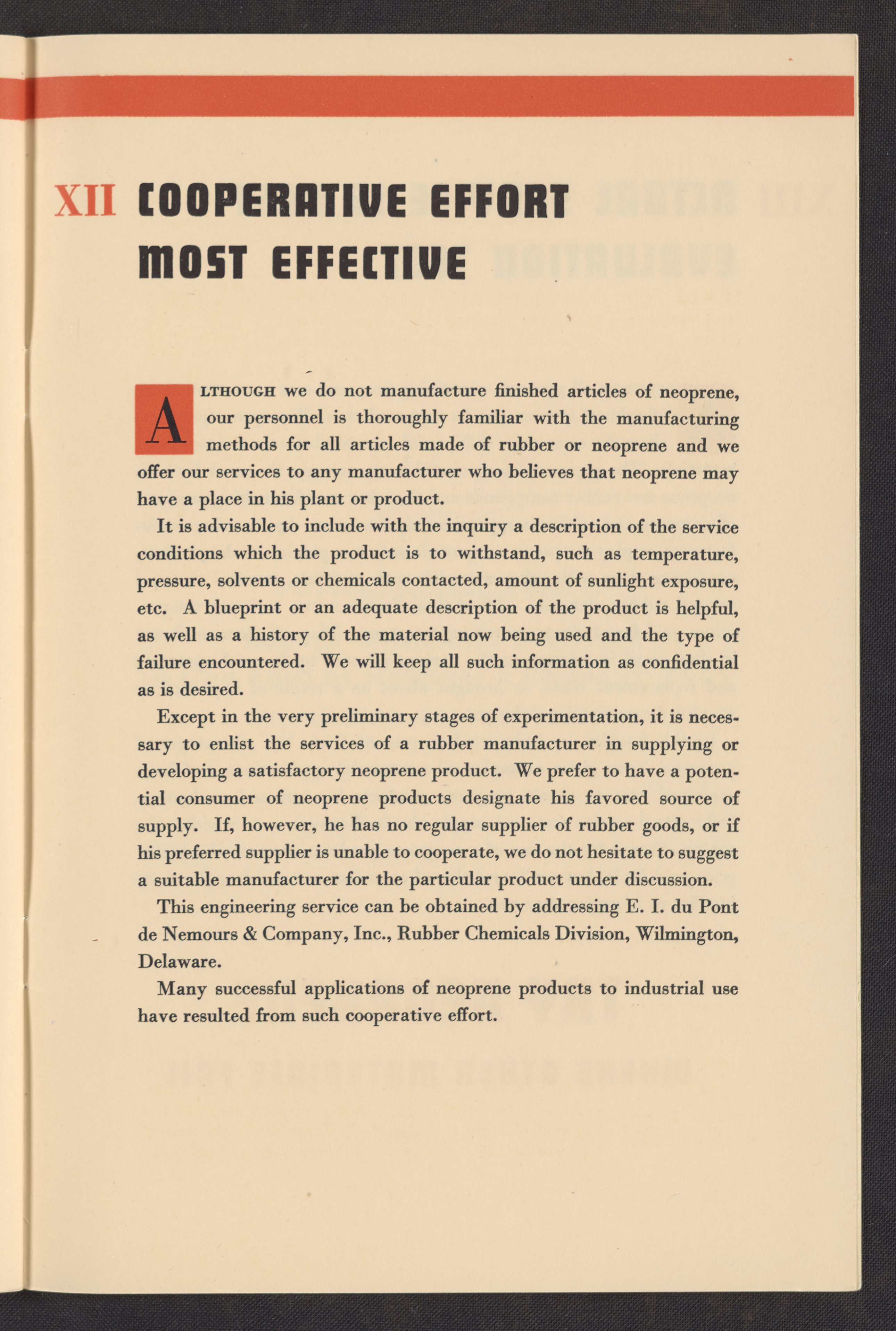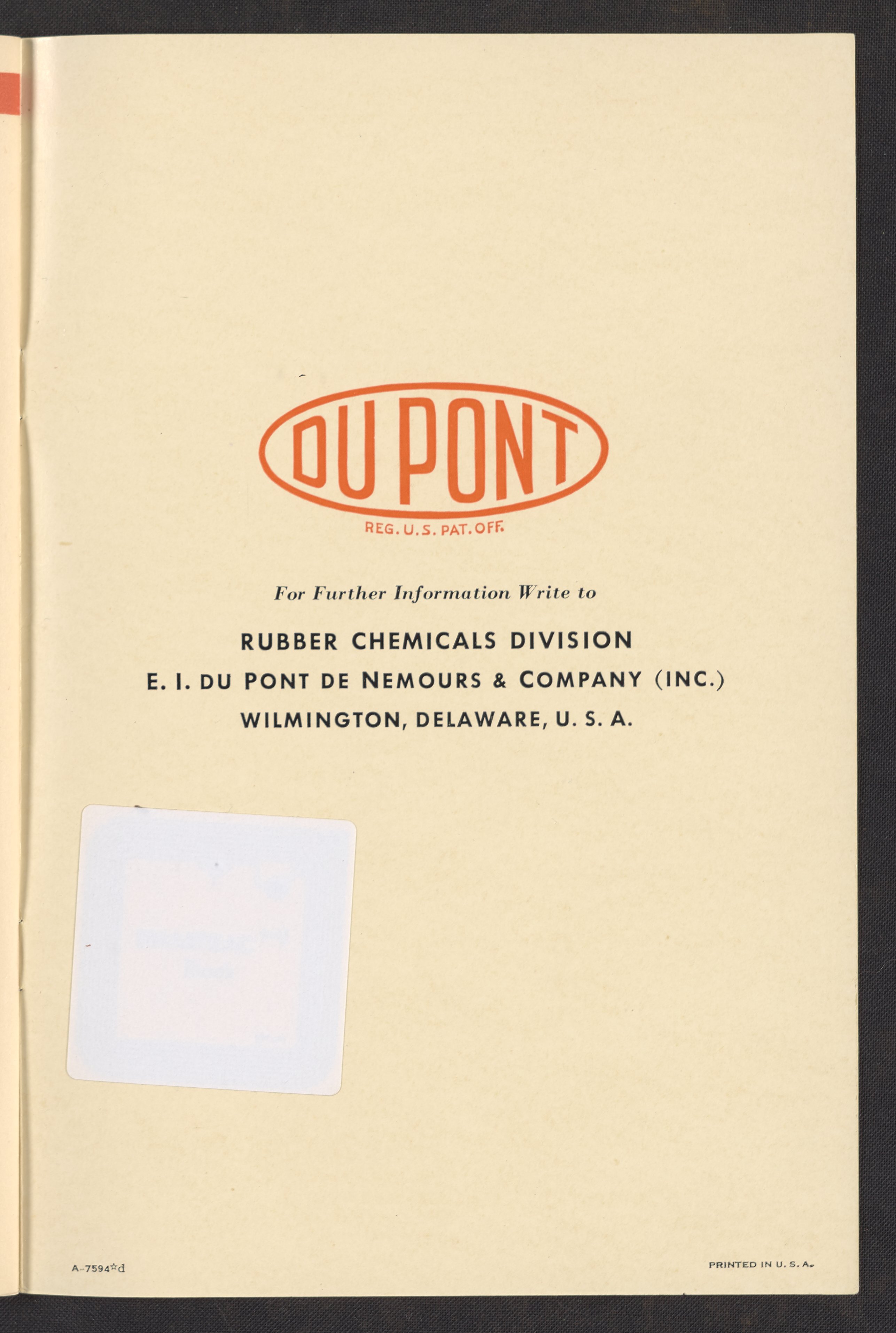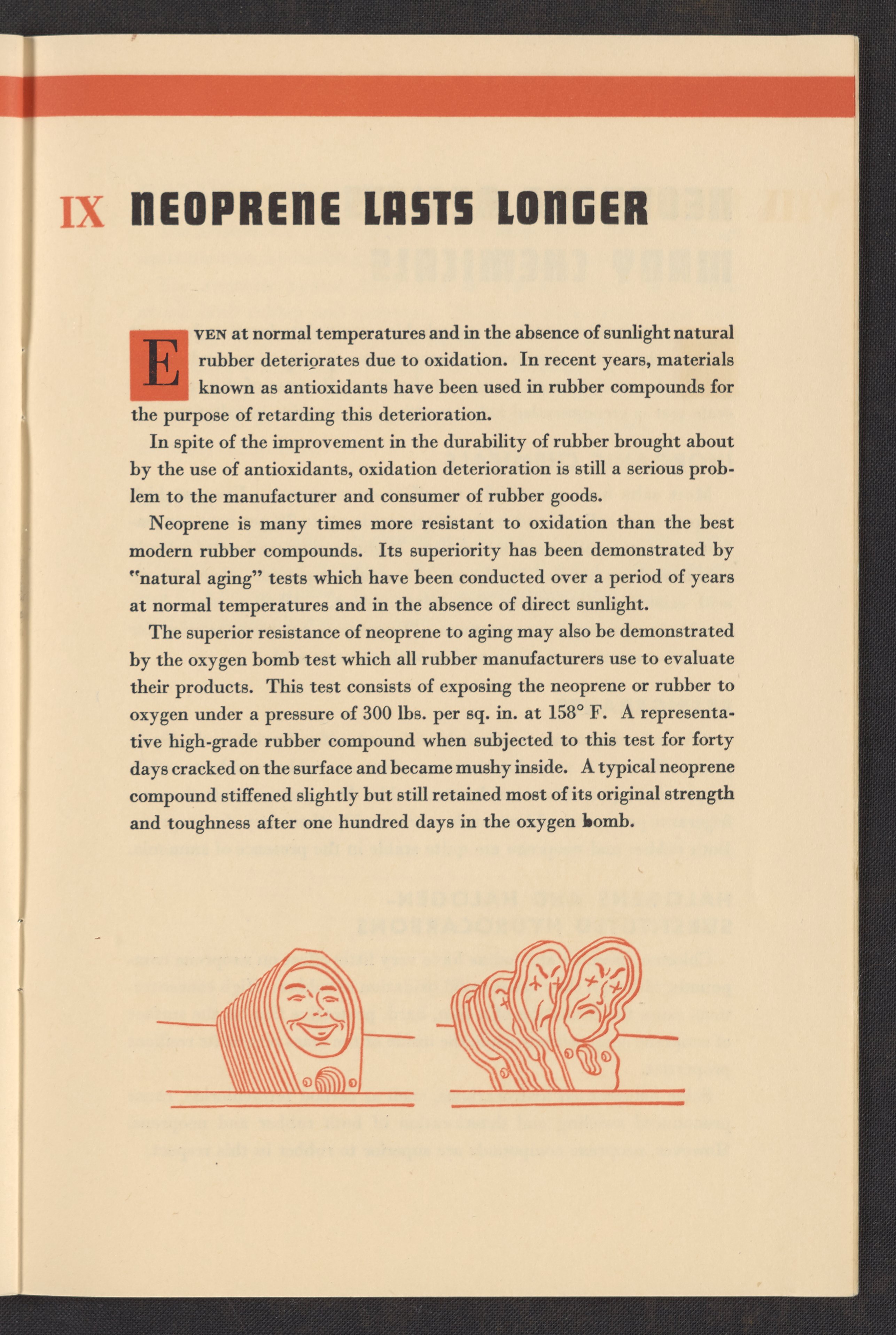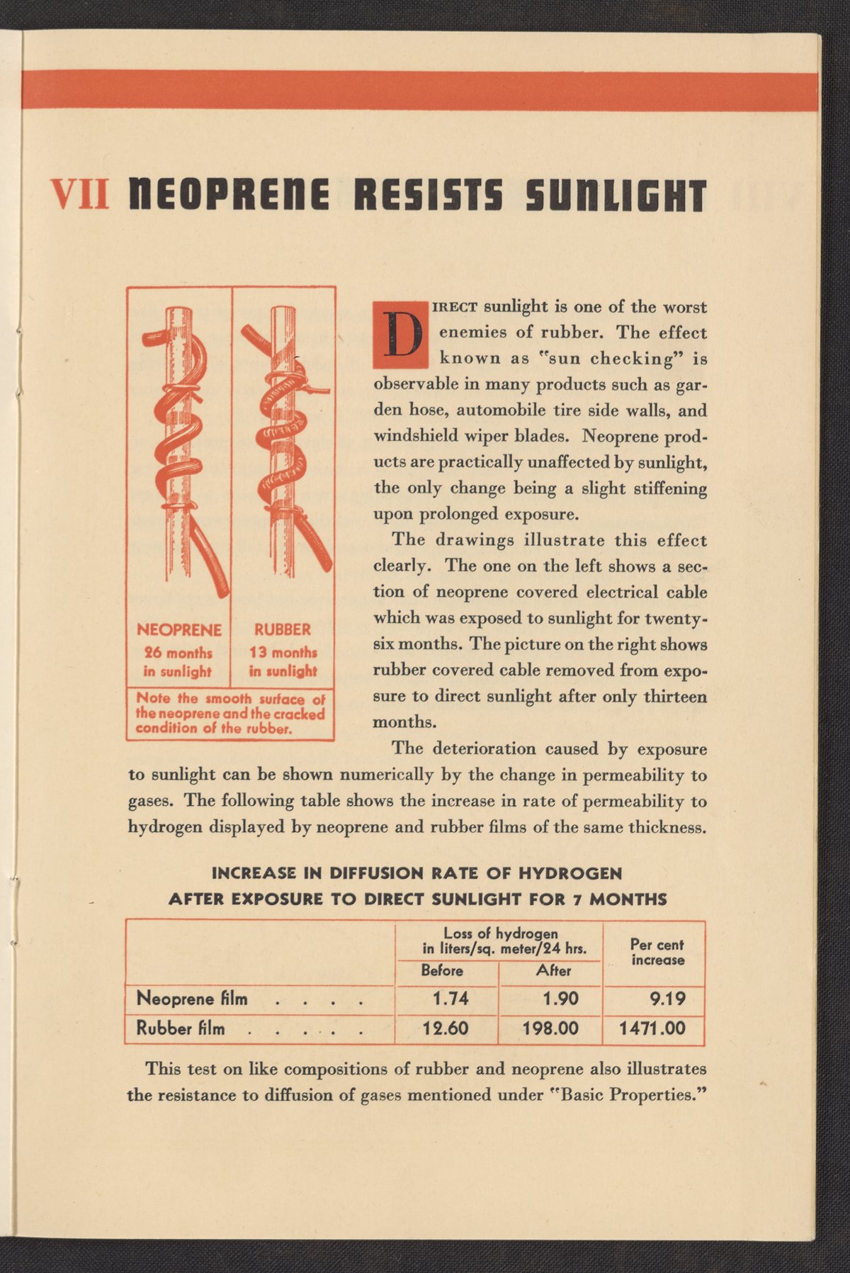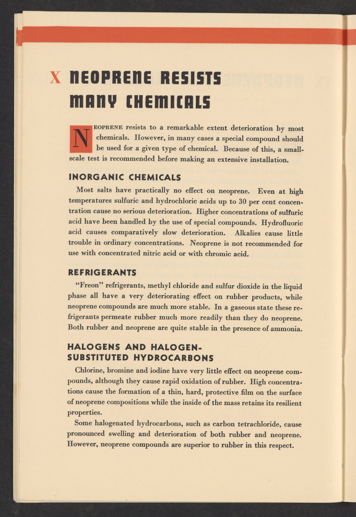E.I. du Pont de Nemours & Company. Rubber Chemicals Division. “Neoprene A Remarkable Engineering Material.” Wilmington, Delaware, 1943. TS1925 .D87 1943. Science History Institute. Philadelphia. https://digital.sciencehistory.org/works/hw7347x.