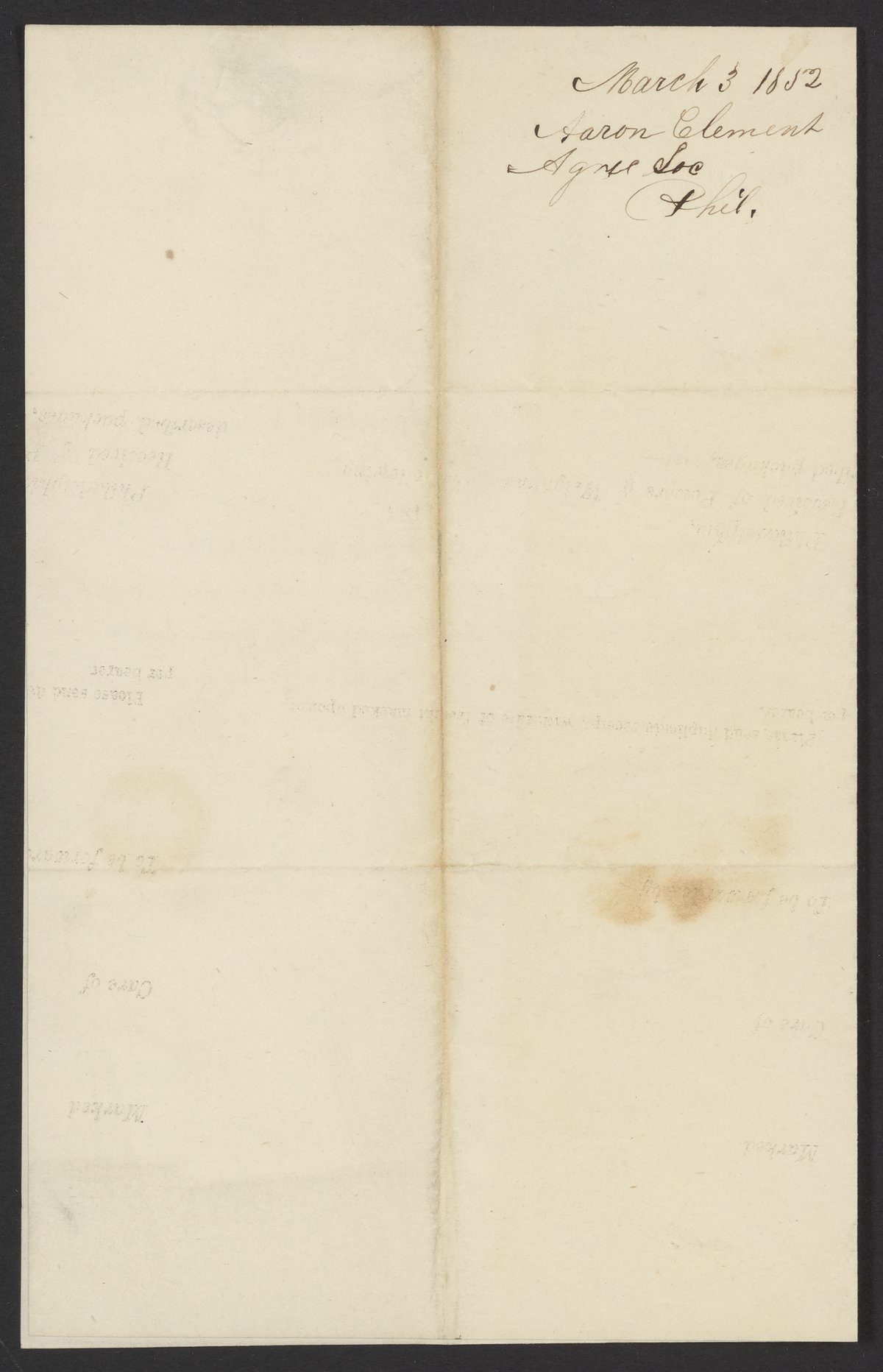Clement, Aaron. “Letter from Aaron Clement on Behalf of the Philadelphia Society for Promoting Agriculture to James Curtis Booth,” March 3, 1852. Papers of James Curtis Booth, Box 1, Folder 6. Science History Institute. Philadelphia. https://digital.sciencehistory.org/works/hwqzcap.
