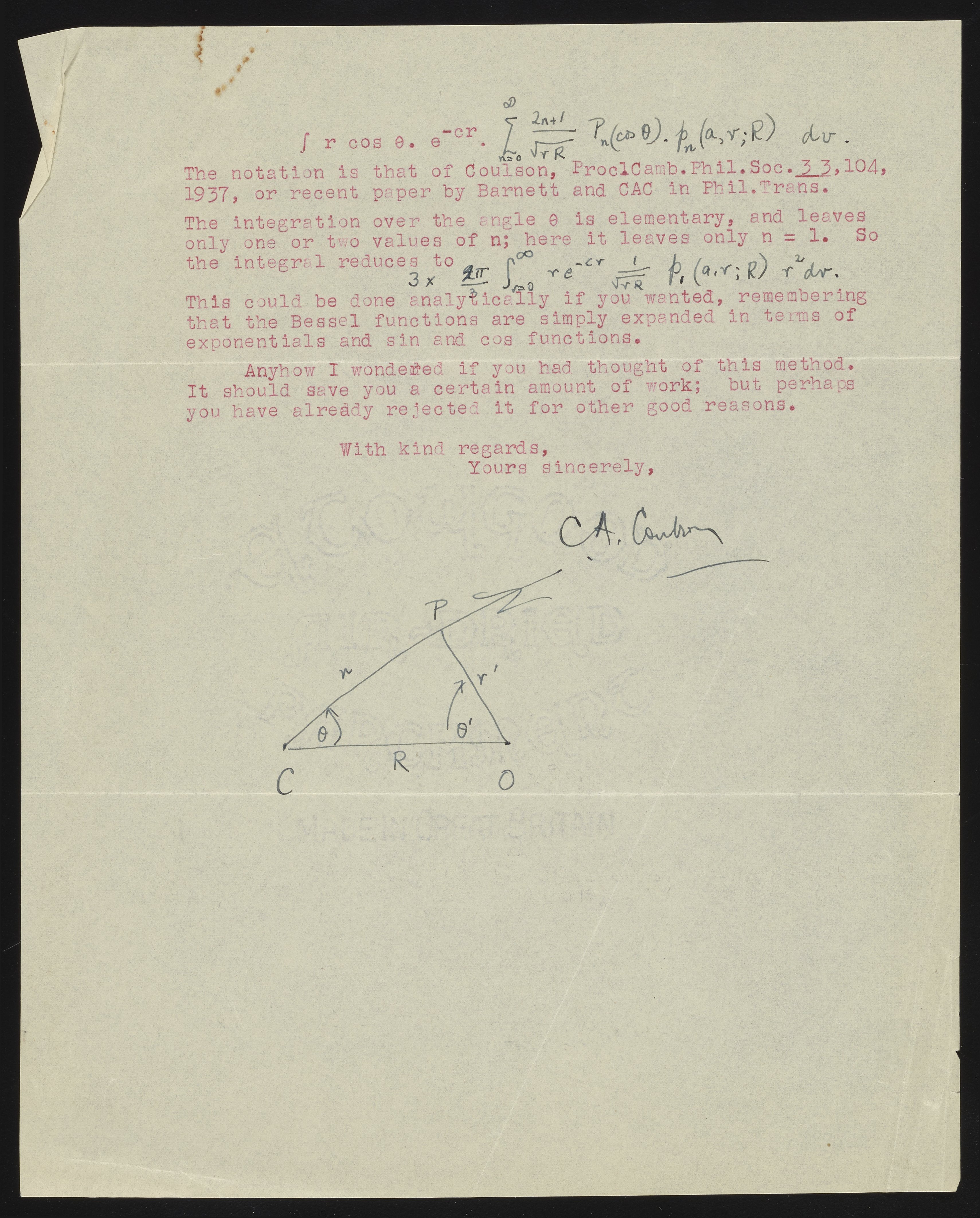 Letter from Charles Coulson to Harrison Shull, 1952