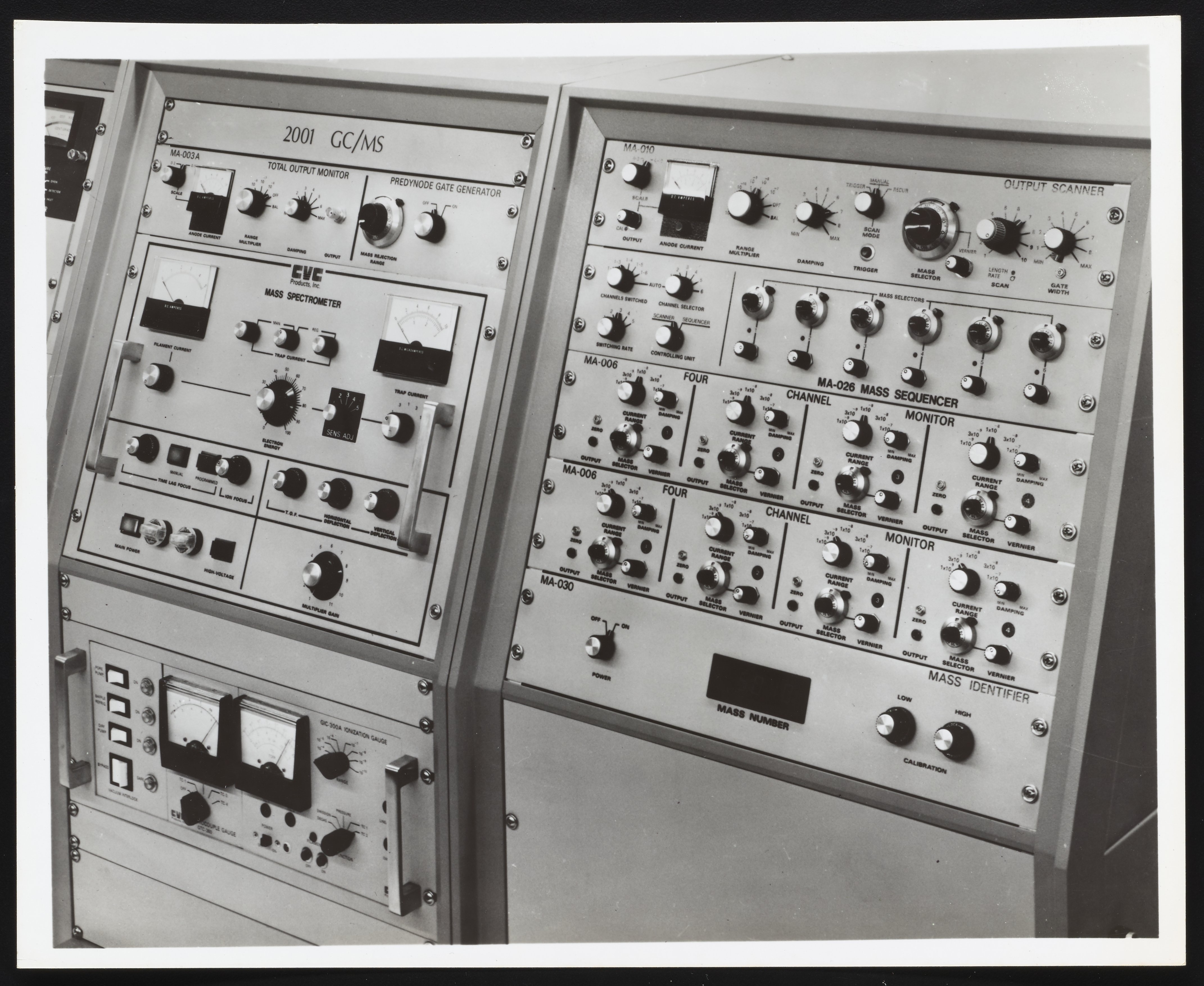 Close-up view of a portion of a Consolidated Vacuum Corporation Model 2001 Masschromatograph, with view of assorted control panels including an output scanner, mass sequencer, and four channel monitor. Also known as CVC Products Inc., Consolidated Vacuum Corporation operated as a subsidiary of the Bendix Corporation prior to Allied Signal's takeover of Bendix in 1983. The Masschromatograph 2001 offered the qualitative and quantitative capabilities of combined gas chromatography and mass spectrometry for a variety of laboratory applications, including forensics, toxicology, and food flavoring.