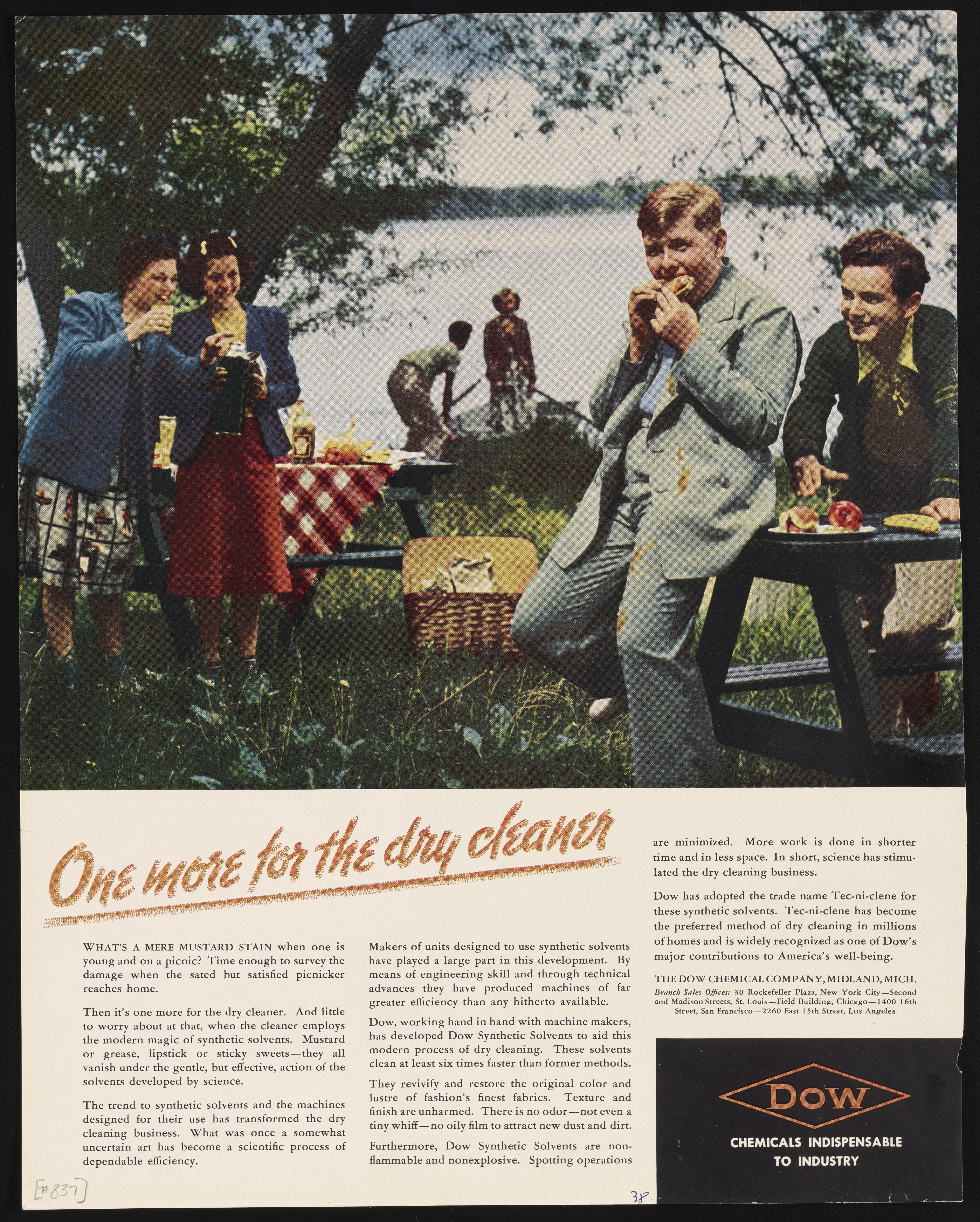Dow Chemical Company. “One More for the Dry Cleaner,” 1938. Advertisements from the Dow Chemical Historical Collection, Box 9. Science History Institute. Philadelphia. https://digital.sciencehistory.org/works/hy7faq8.