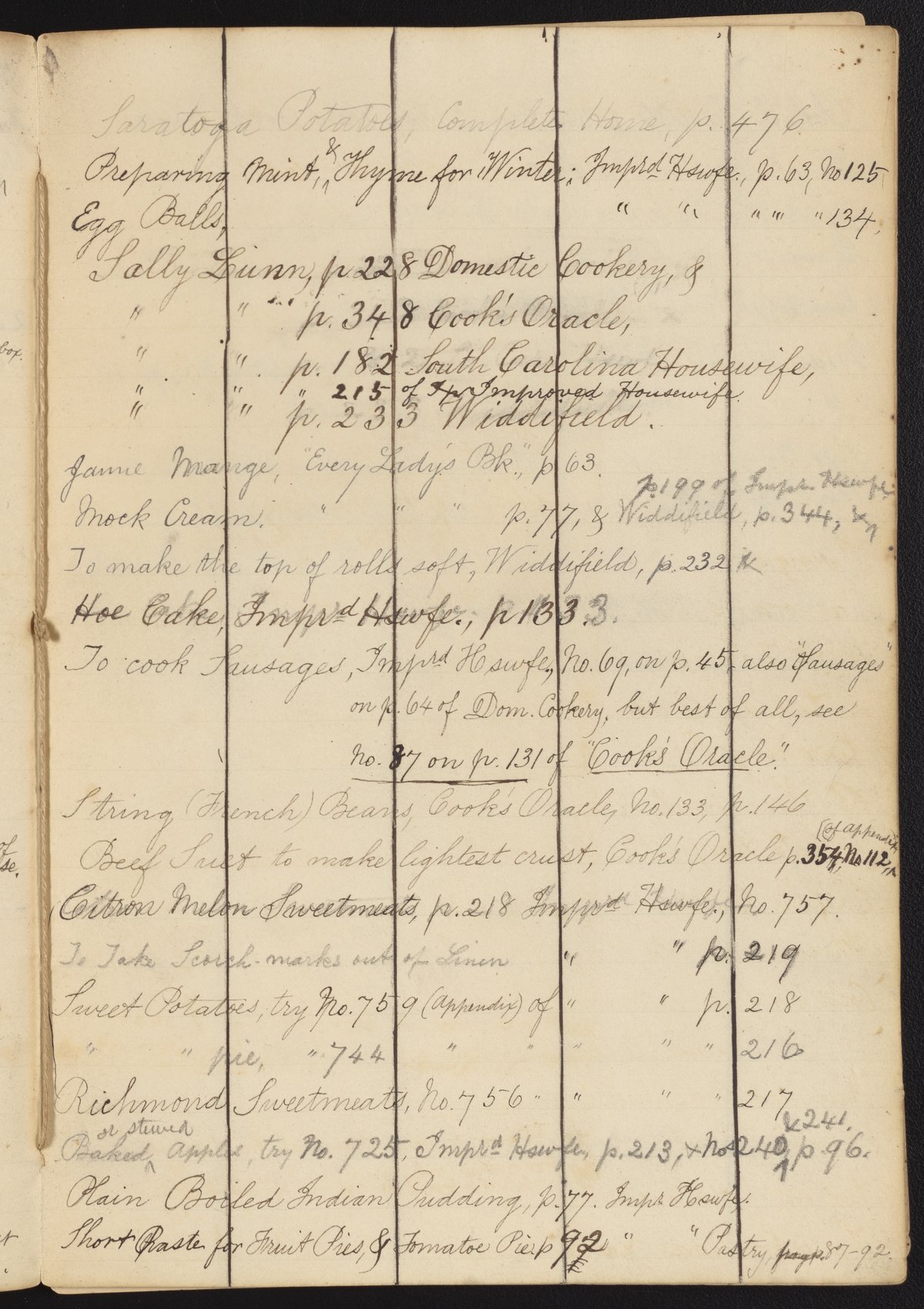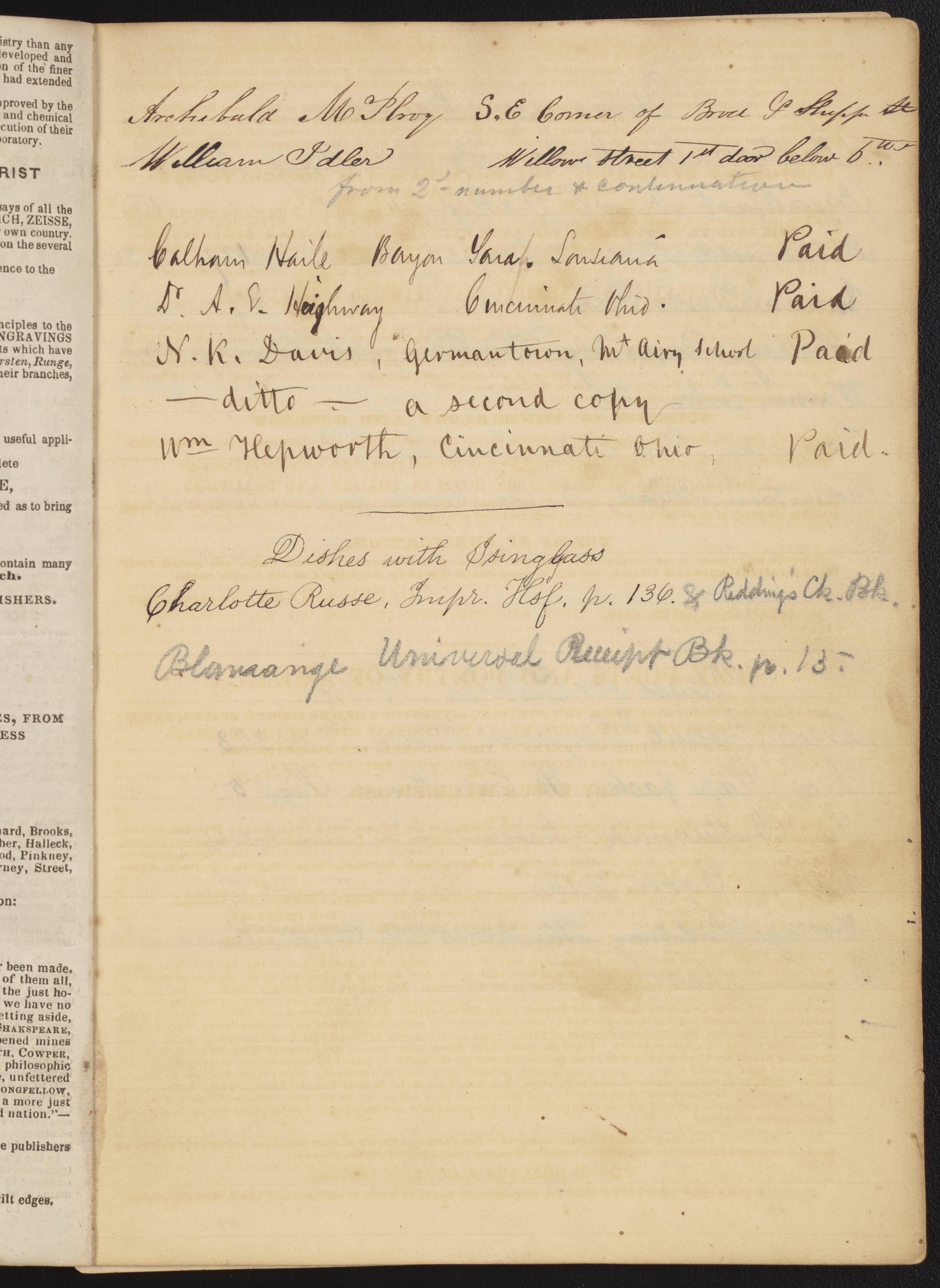 Small JPG1200 x 1696px — 433 KBLarge JPG2880 x 4070px — 2.1 MBFull-sized JPG3994 x 5644px — 3.6 MBOriginal fileTIFF — 3994 x 5644px — 64.6 MBA notebook containing handwritten references to various recipes and uses for ingredients. The first page includes an advertisement for The Encyclopedia of Chemistry, Practical and Theoretical: Embracing Its Application to the Arts, Metallurgy, Mineralogy, Geology, Medicine, and Pharmacy (1850) by James Curtis Booth (1810-1888) and Campbell Morfit (1820-1897).