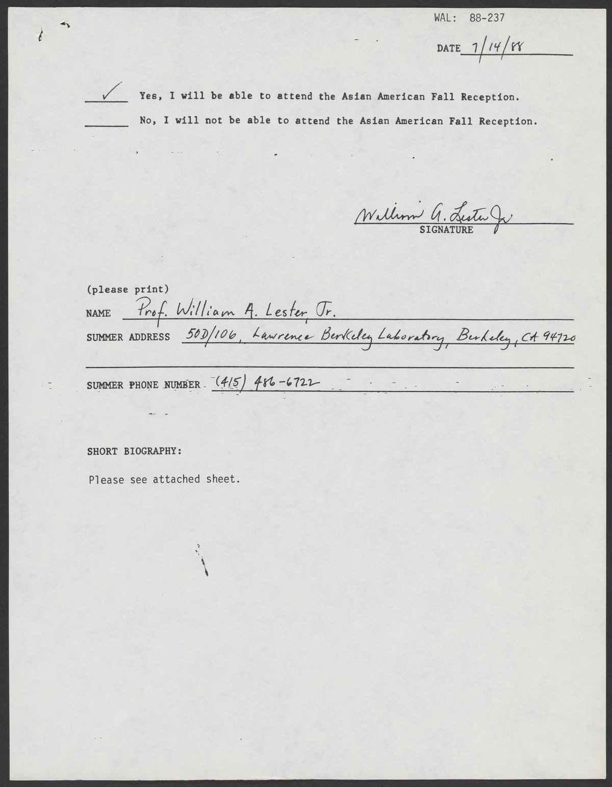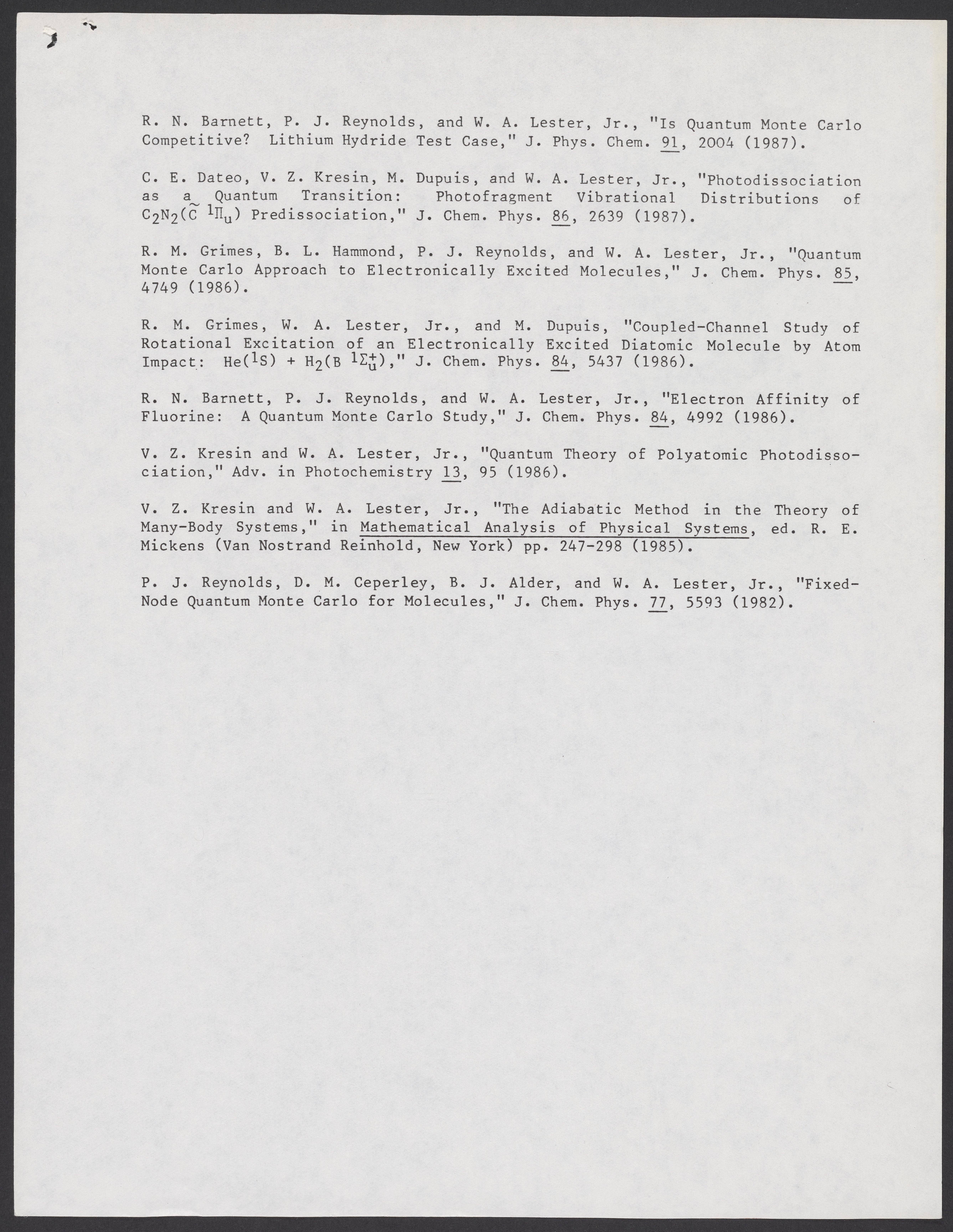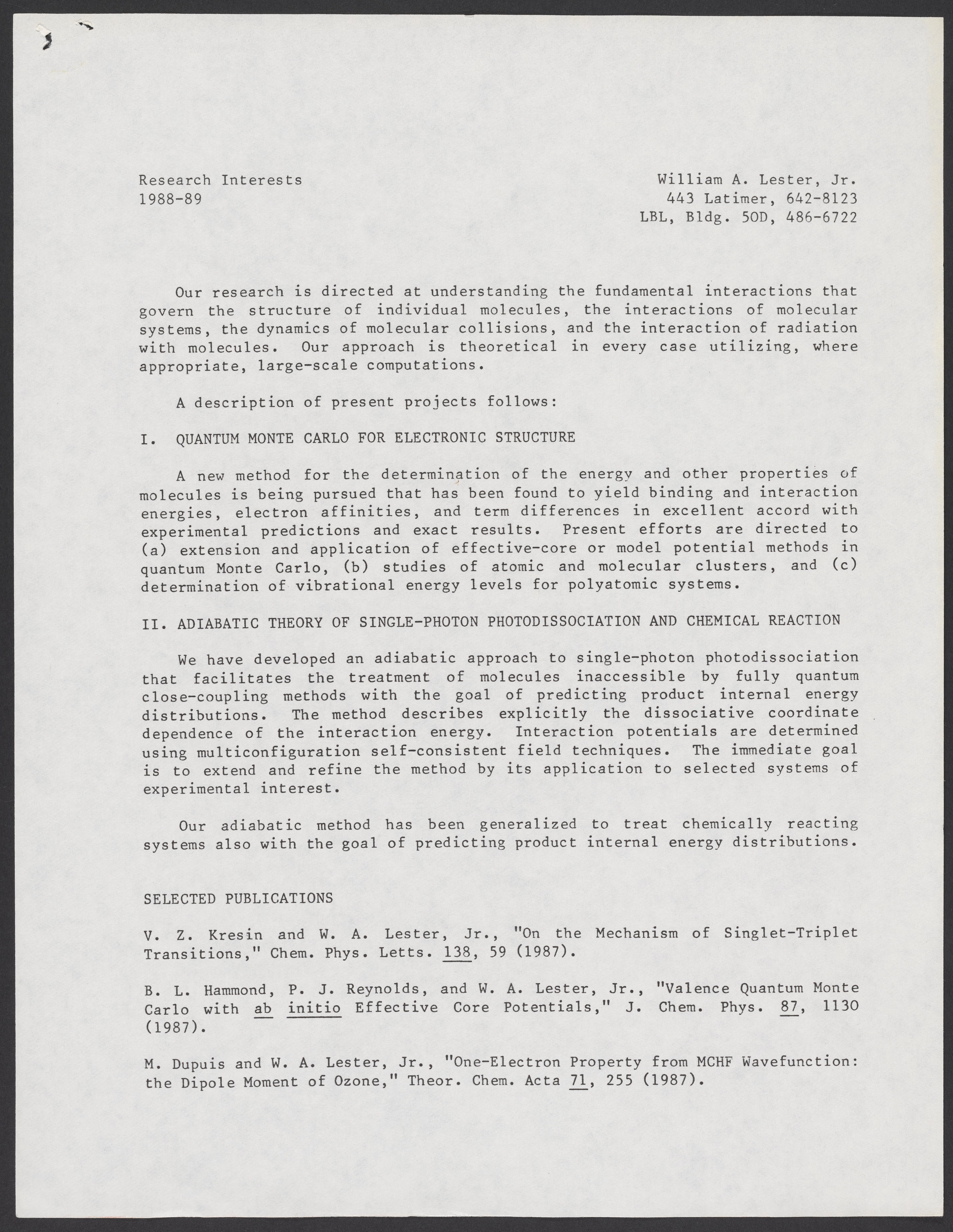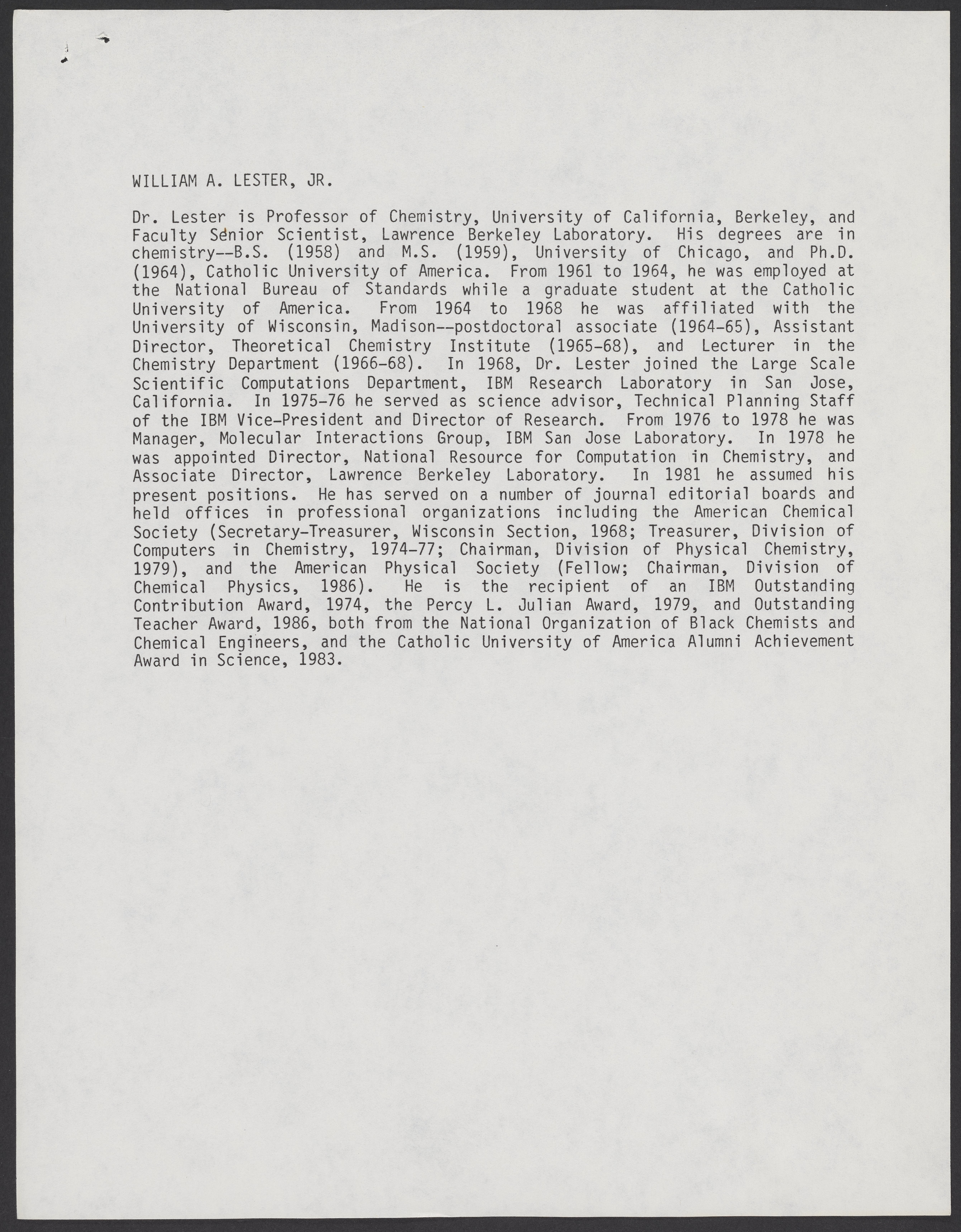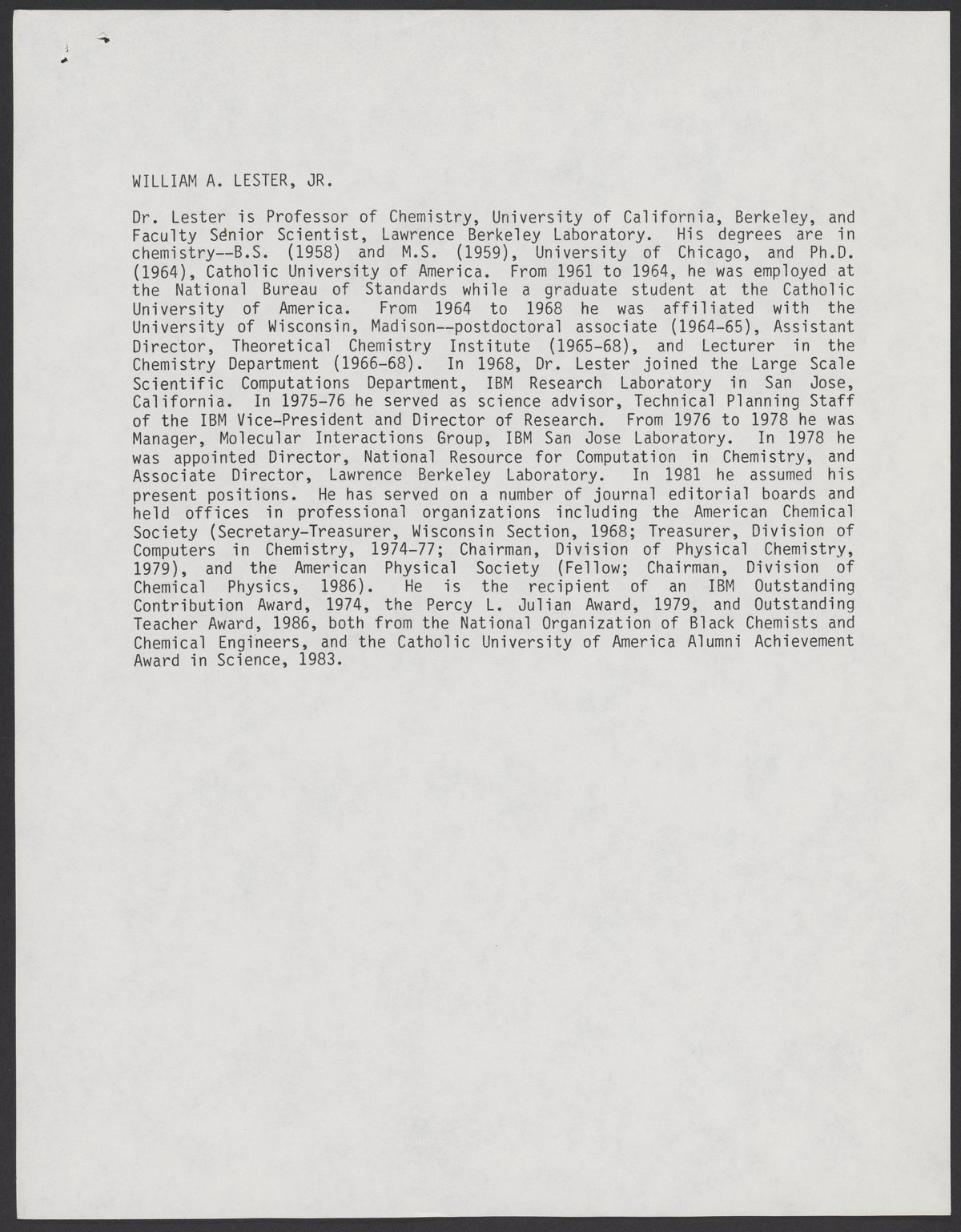 Lester, William A., Jr. “Biography of William A. Lester, Jr., 1988,” July 14, 1988. William A. Lester, Jr. Papers, Box 33, Folder 22. Science History Institute. Philadelphia. https://digital.sciencehistory.org/works/i1iwjyp.