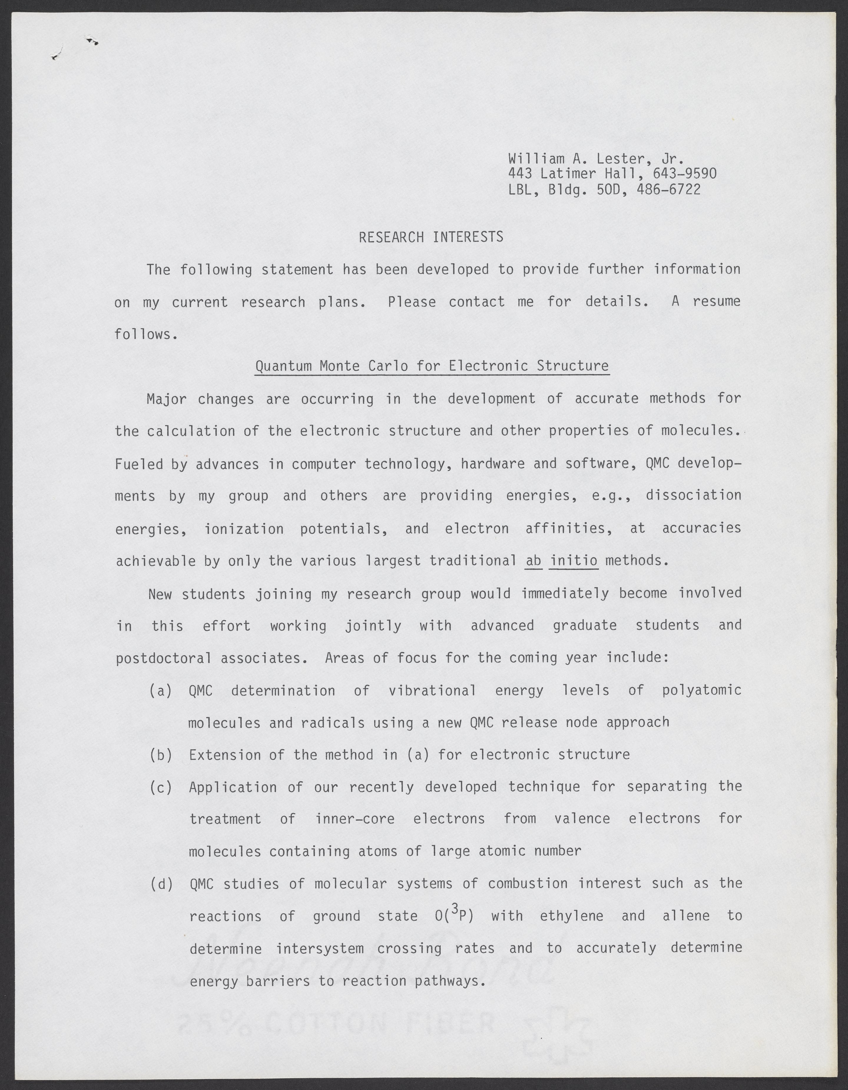 Document with biography and research interests of William A. Lester, Jr. (1937-).