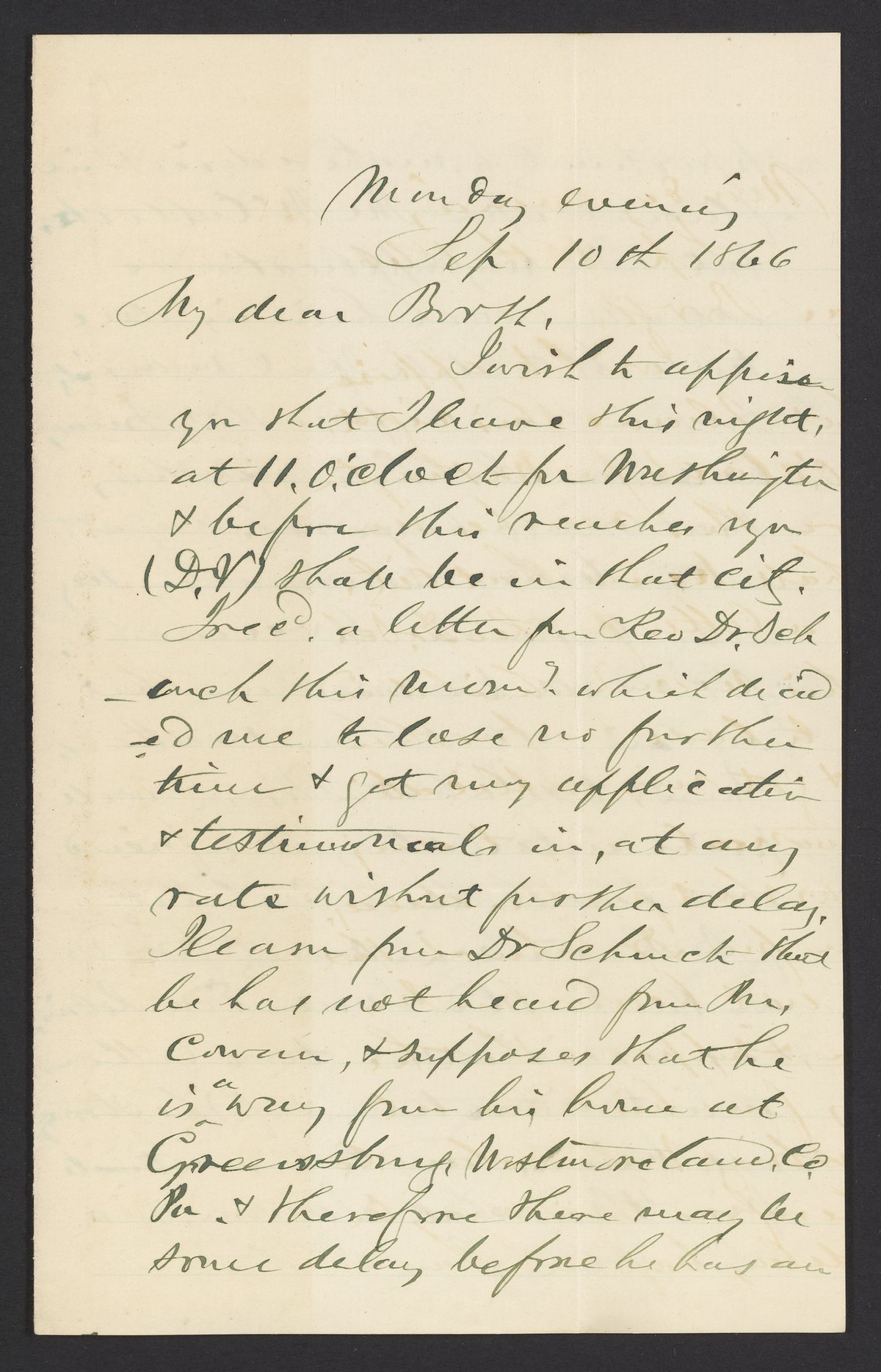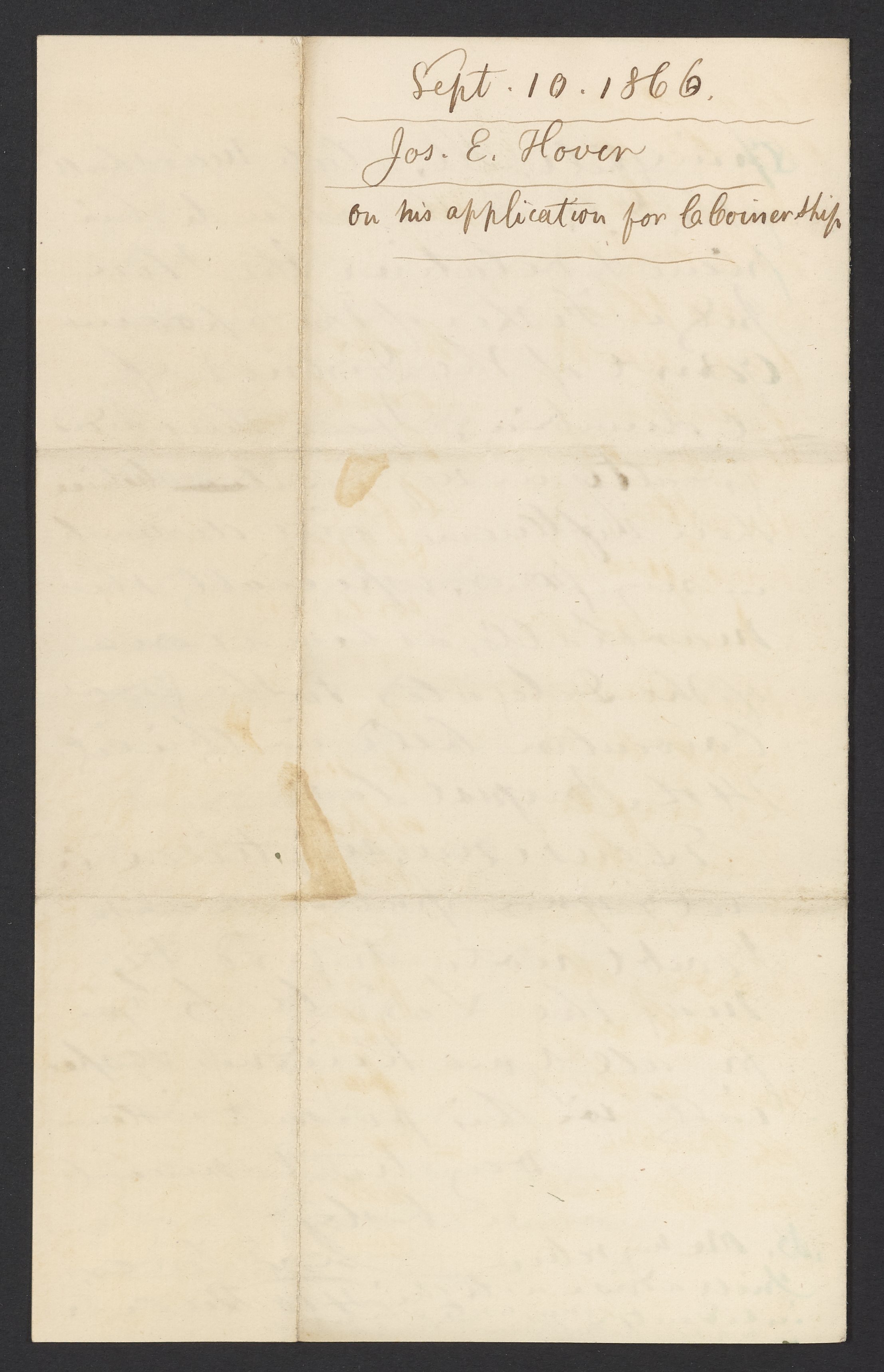 Letter from Joseph E. Hoven to James Curtis Booth, September 10, 1866