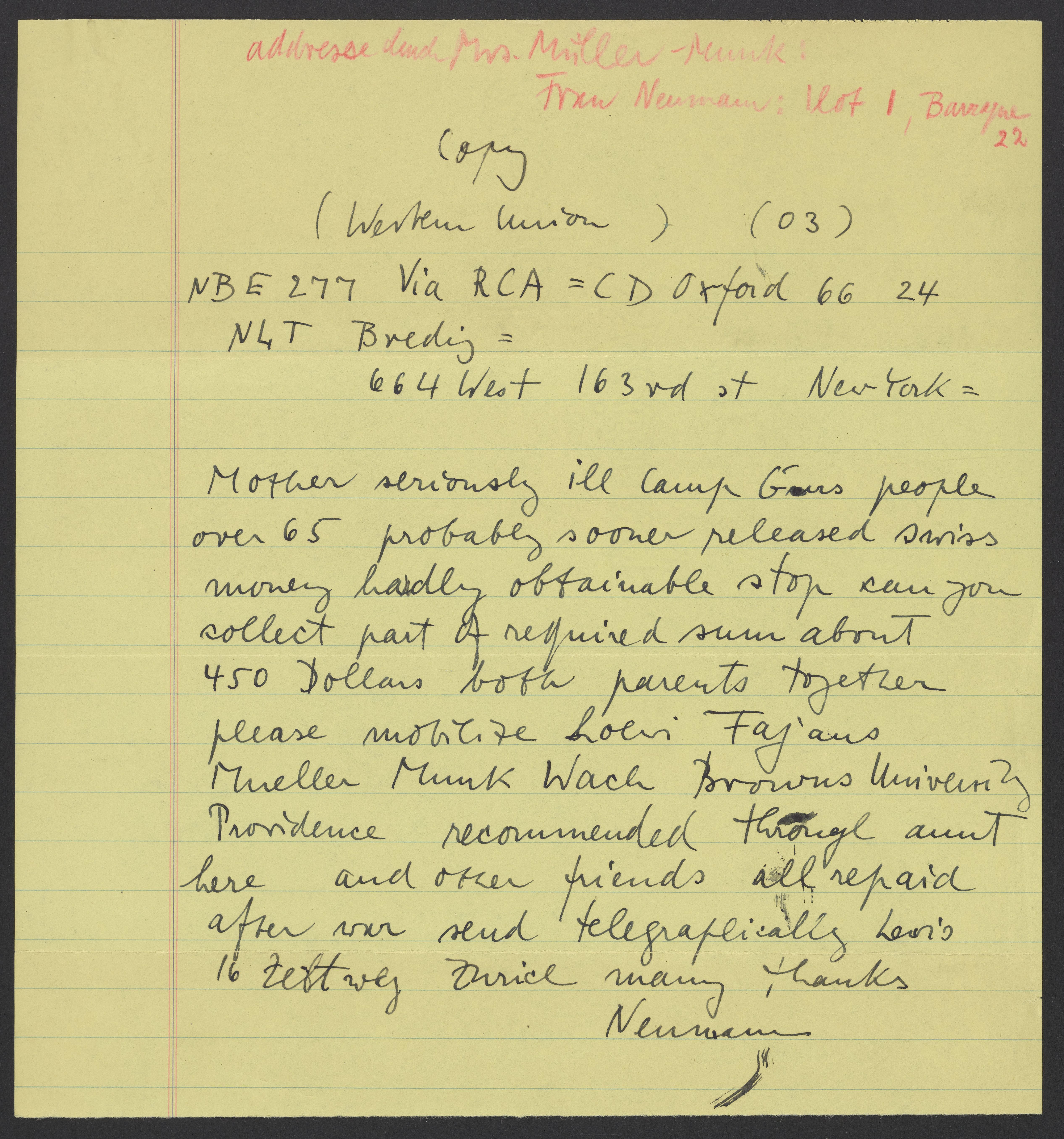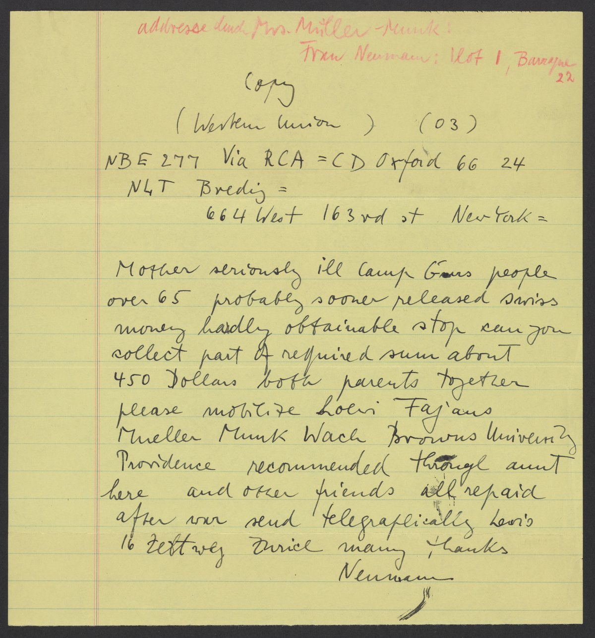 Elisabeth Neumann asks Max Bredig (1902-1977) to contact Otto Loewi (1873-1961). Kasimir Fajans (1887-1975), and "Mueller Munk" for assistance. Neumann's parents have been detained in a Nazi internment camp in Southern France, and in this letter it says her mother is very ill.
