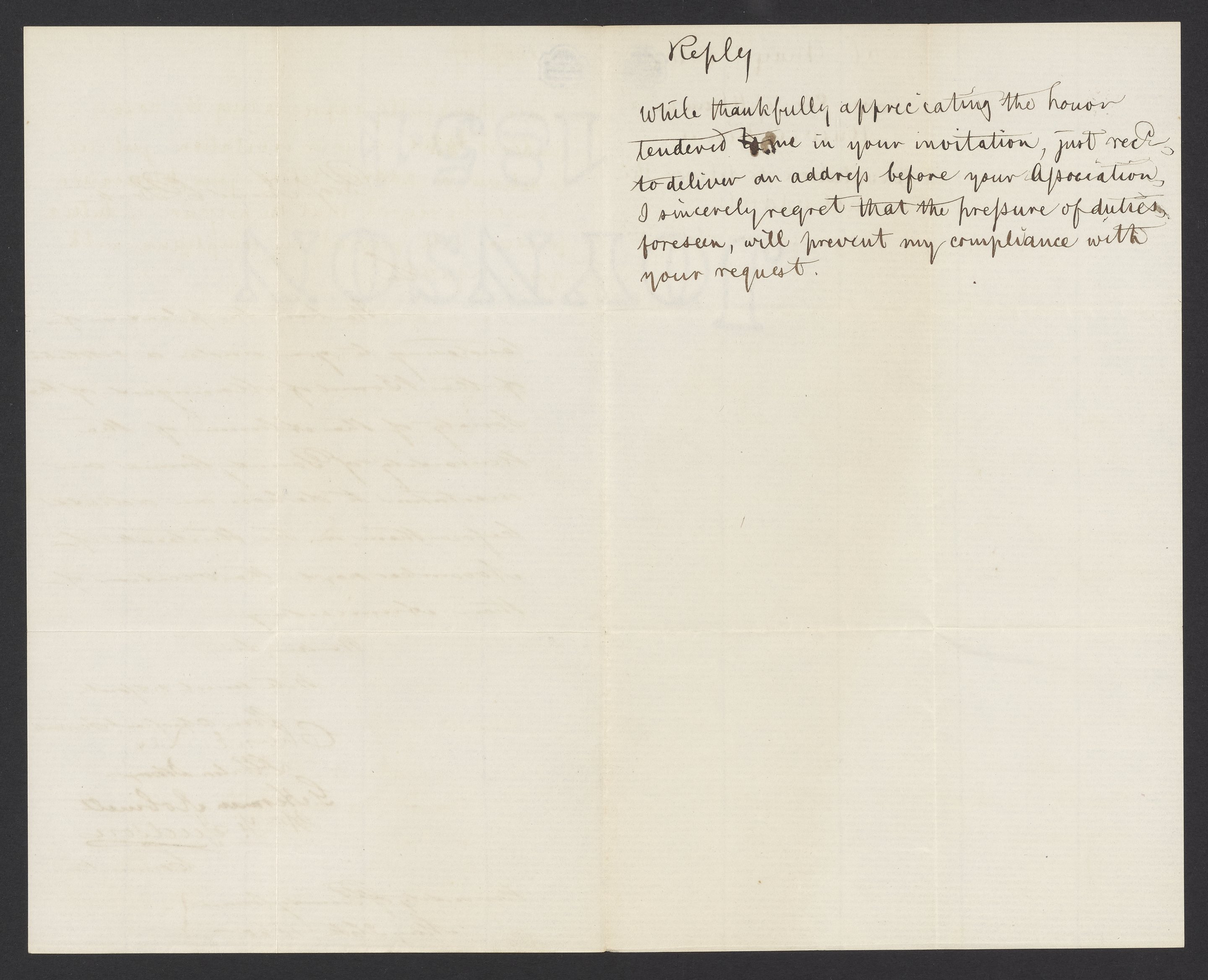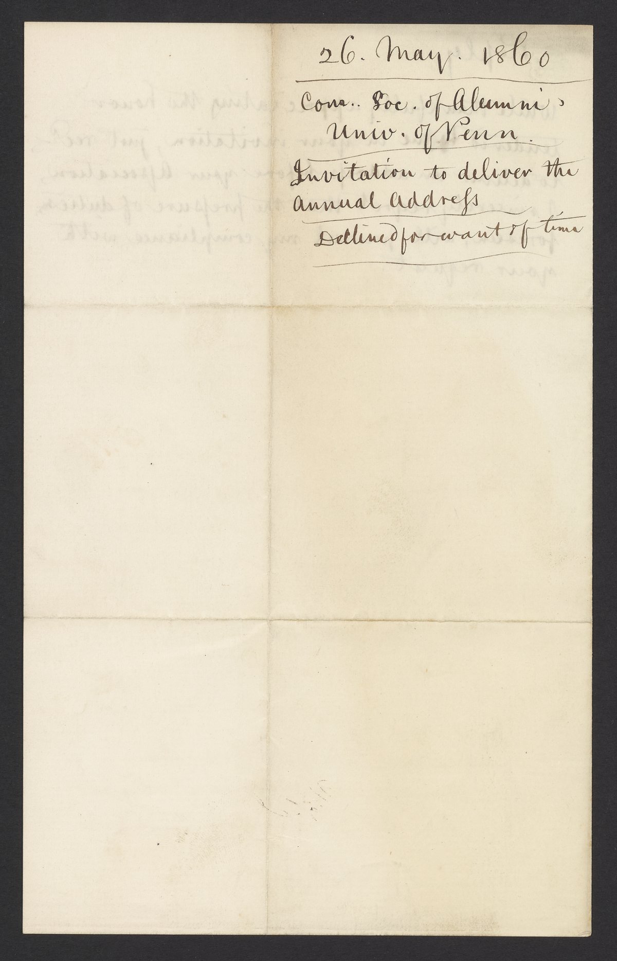 Small JPG1200 x 1871px — 279 KBFull-sized JPG2166 x 3378px — 801 KBOriginal fileTIFF — 2166 x 3378px — 21.0 MBThe Committee for the Society of Alumni of the University of Pennsylvania writes to James Curtis Booth (1810-1888) with the invitation to deliver the University's Annual Address. Booth includes his reply on the inside of the letter, in which he declines the invitation "for want of time."