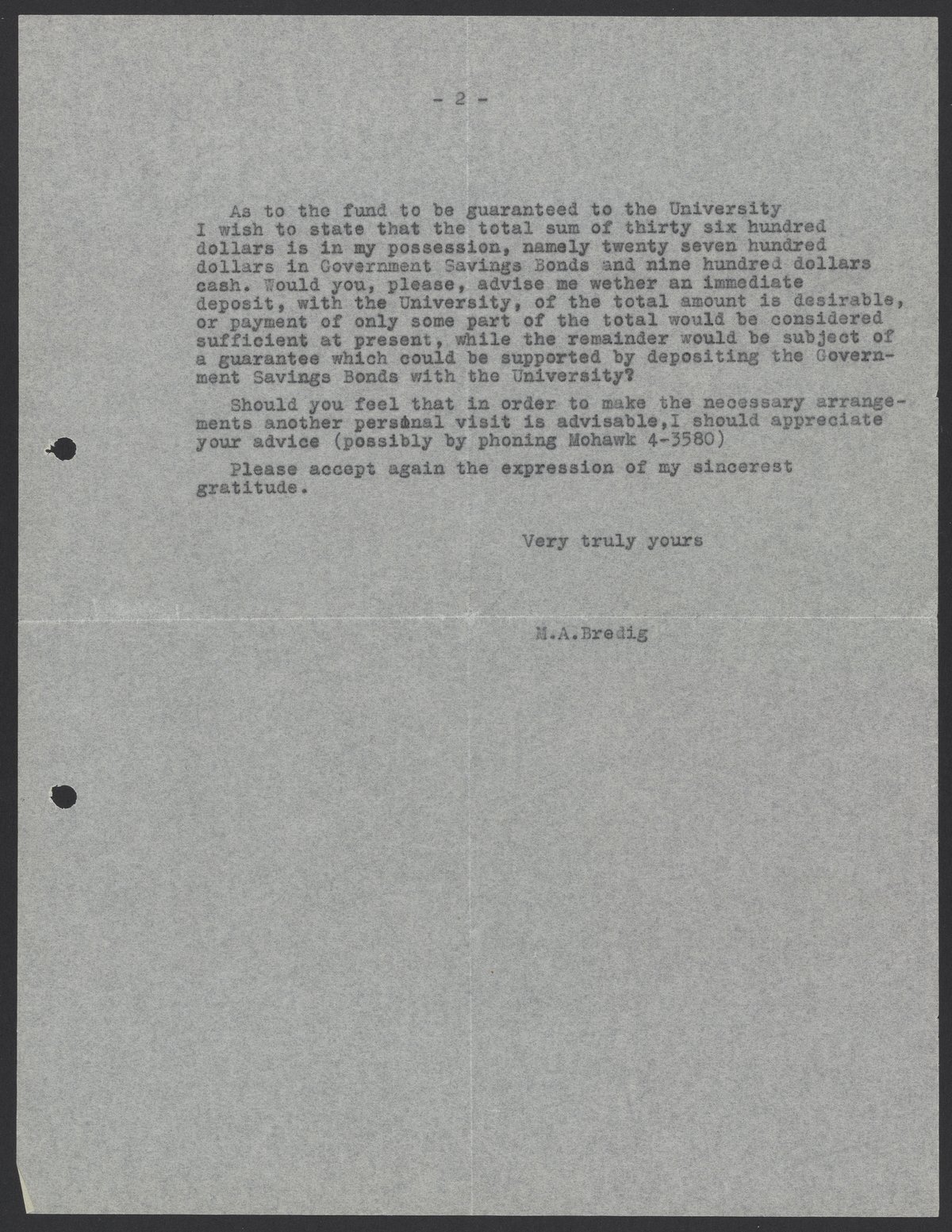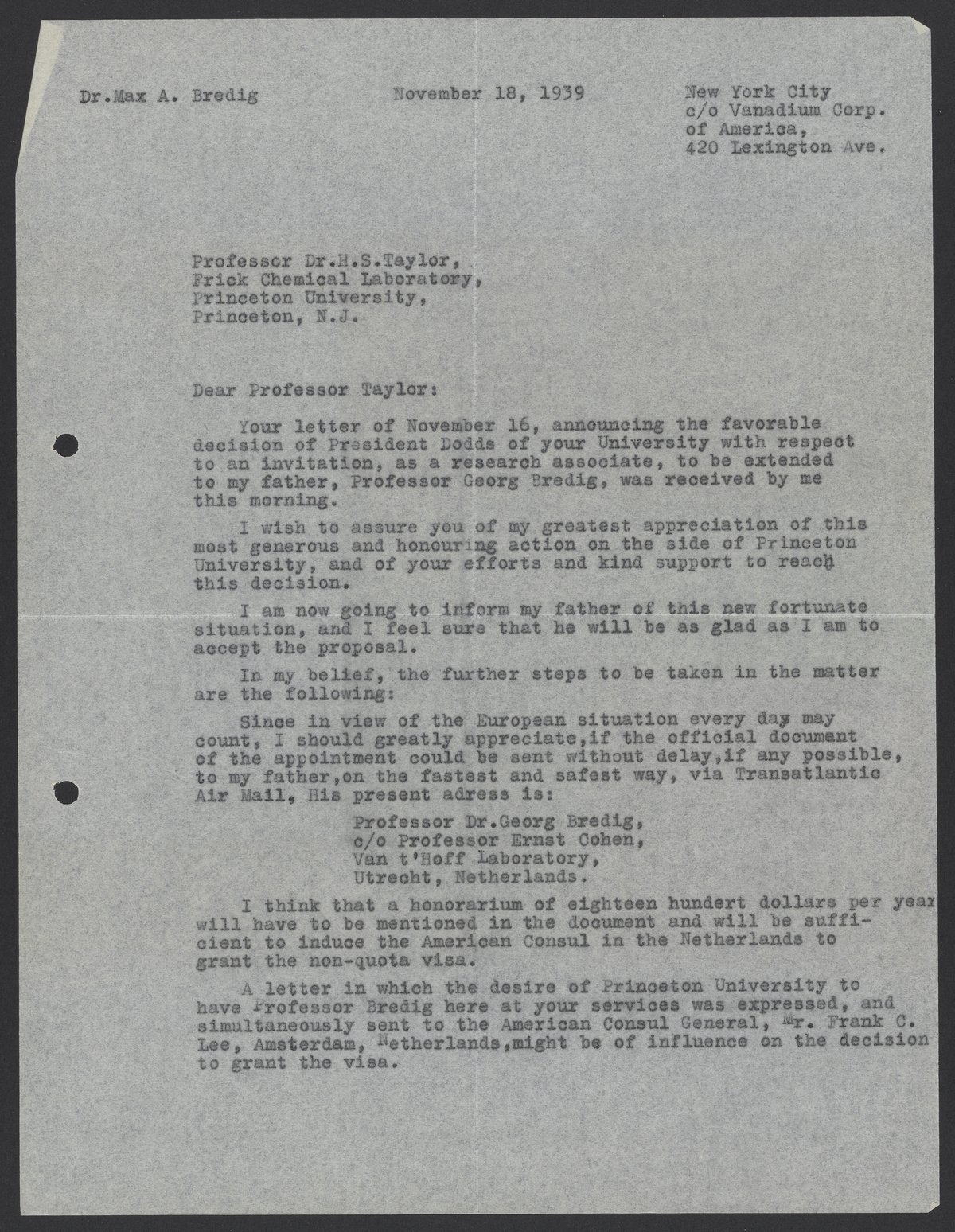 Small JPG1200 x 1548px — 384 KBLarge JPG2880 x 3714px — 2.5 MBFull-sized JPG5302 x 6838px — 8.0 MBOriginal fileTIFF — 5302 x 6838px — 104 MBMax Bredig (1902-1977) writes to Hugh S. Taylor (1890-1974) with thanks and relief to know that his father, Georg Bredig (1868-1944), will likely be offered a research associate position at Princeton University. This position will ease Georg's immigration process to the United States. Max expresses the urgency for his father to leave Europe and provides Taylor with details regarding the necessary documentation needed for his father to obtain a visa as soon as possible.