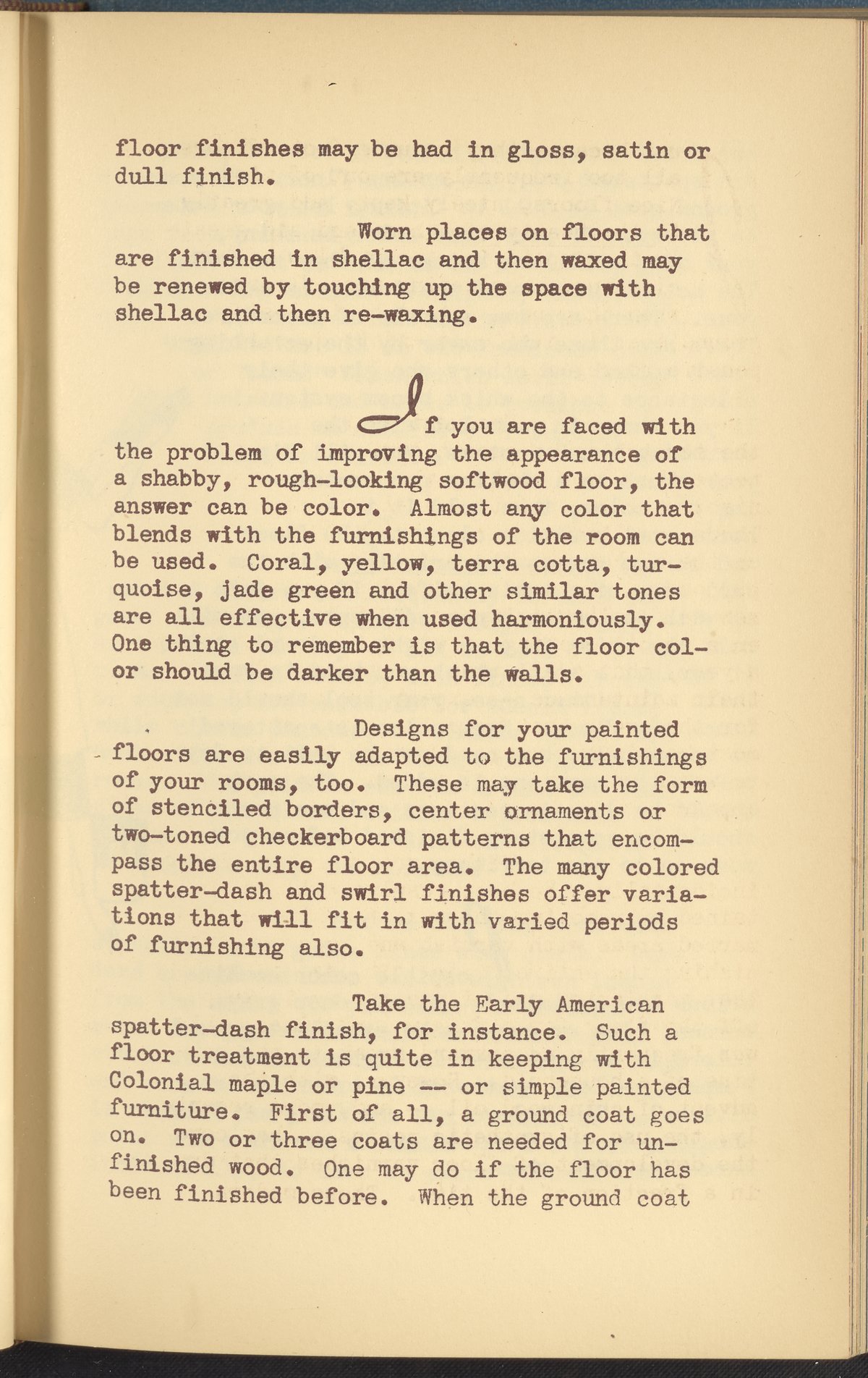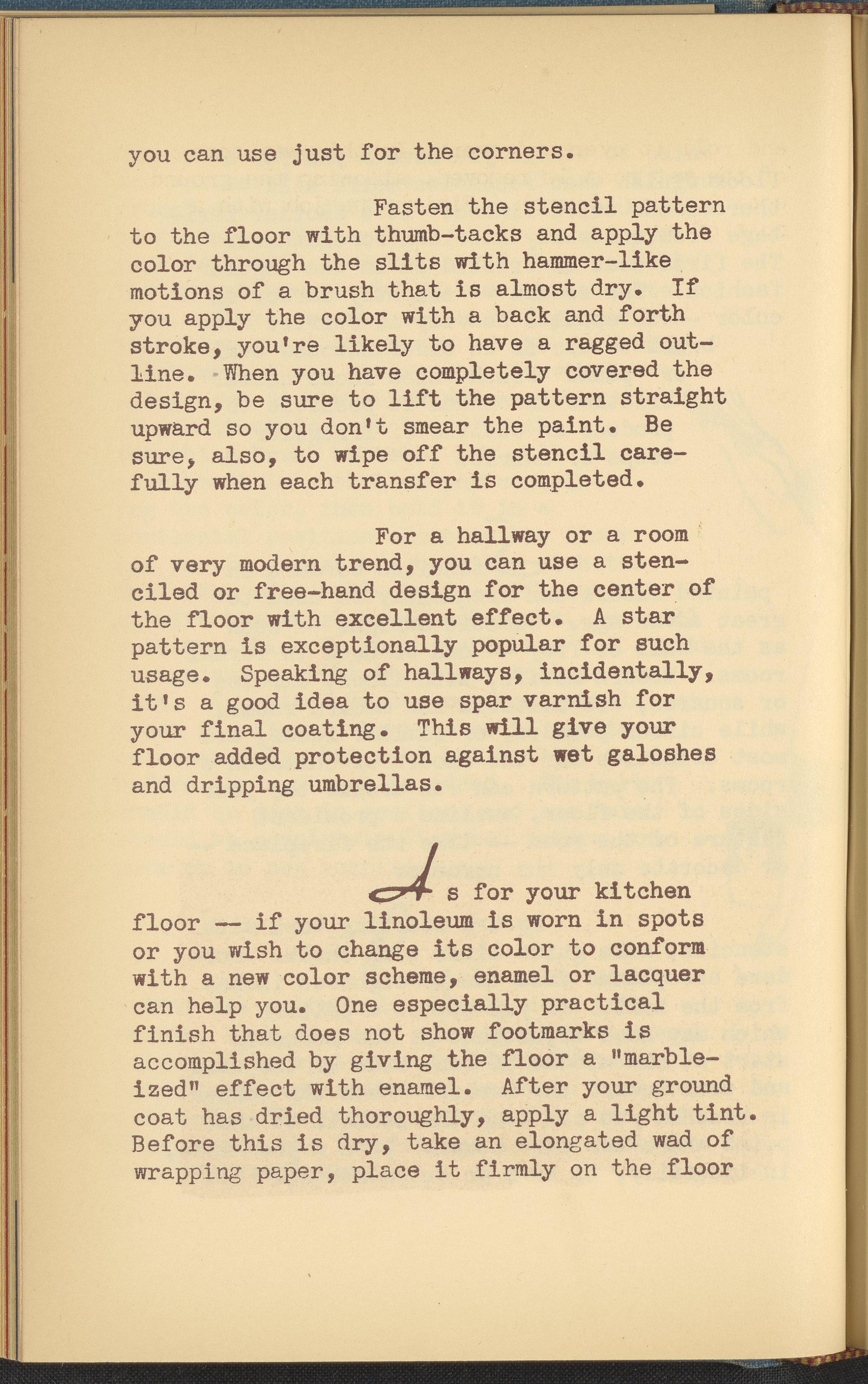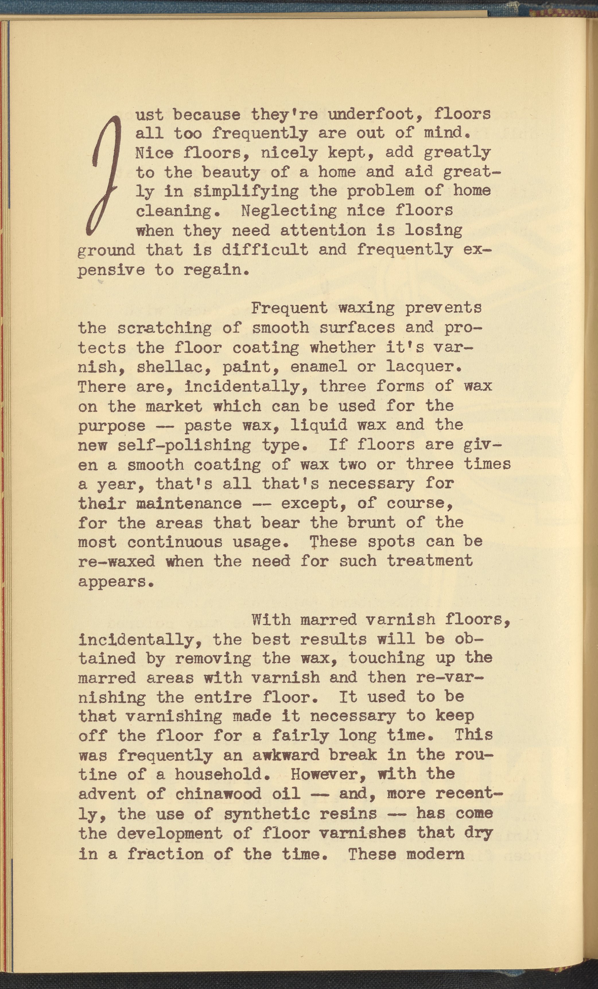 Booklet corresponding to a radio broadcast program created by the National Paint, Varnish, and Lacquer Association. The booklet discusses cleaning and caring for the floors in one's home. Prescribes frequent waxing, touching up varnishes and shellac, adding color, and even adding design. Provides instruction and inspiration for refinishing flooring. Includes small stylized illustrations throughout and decorated covers.