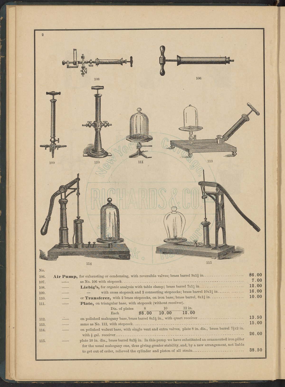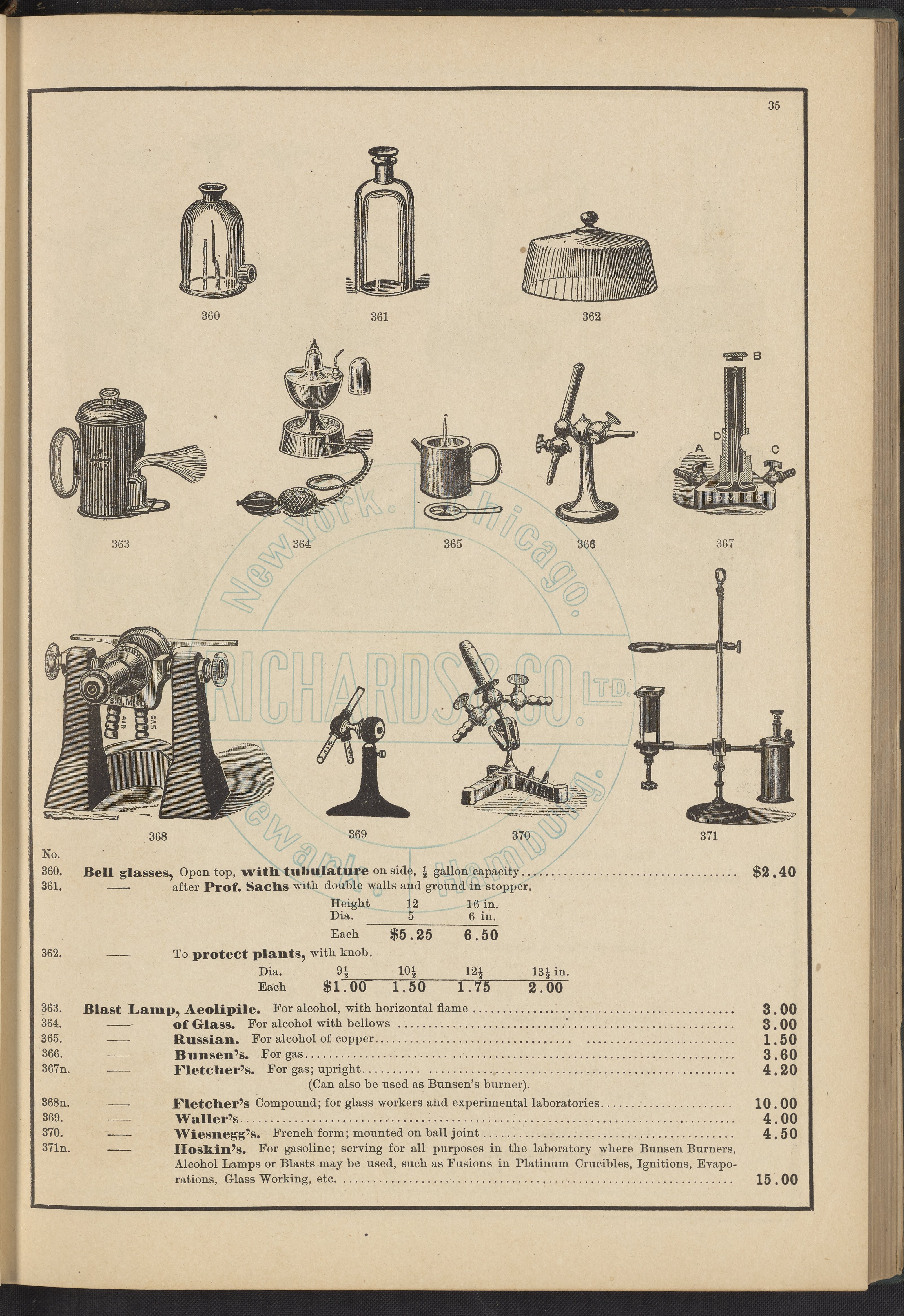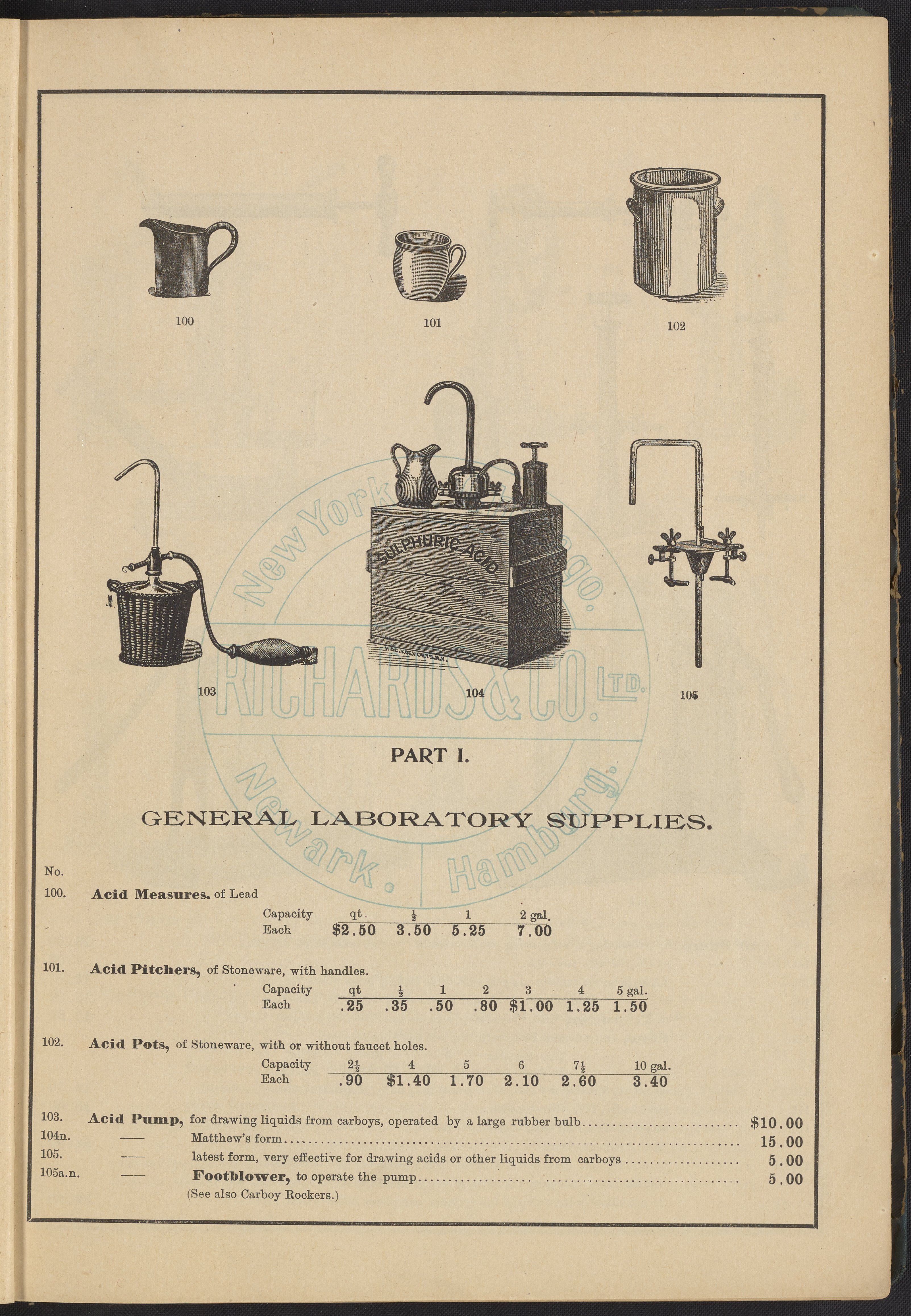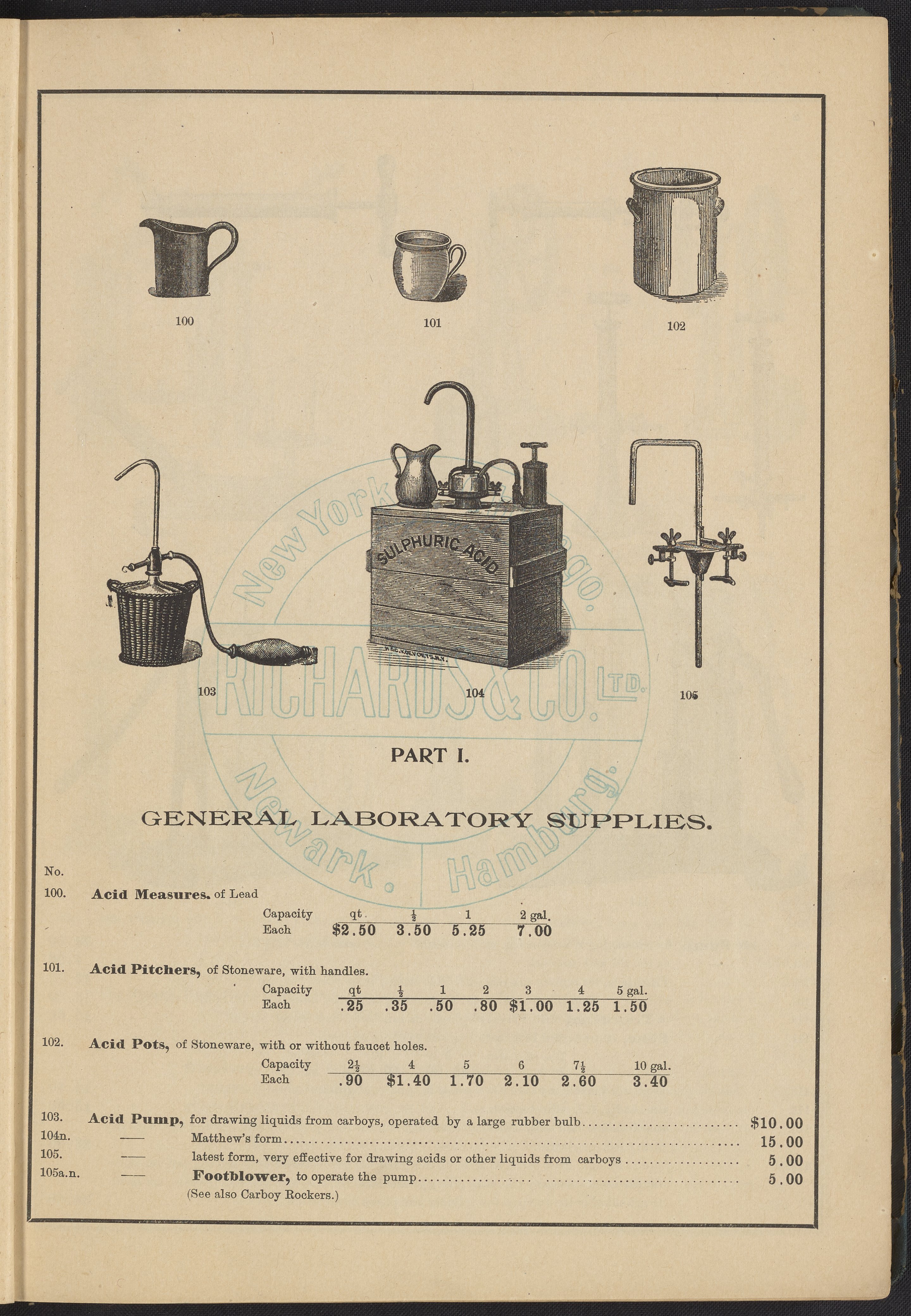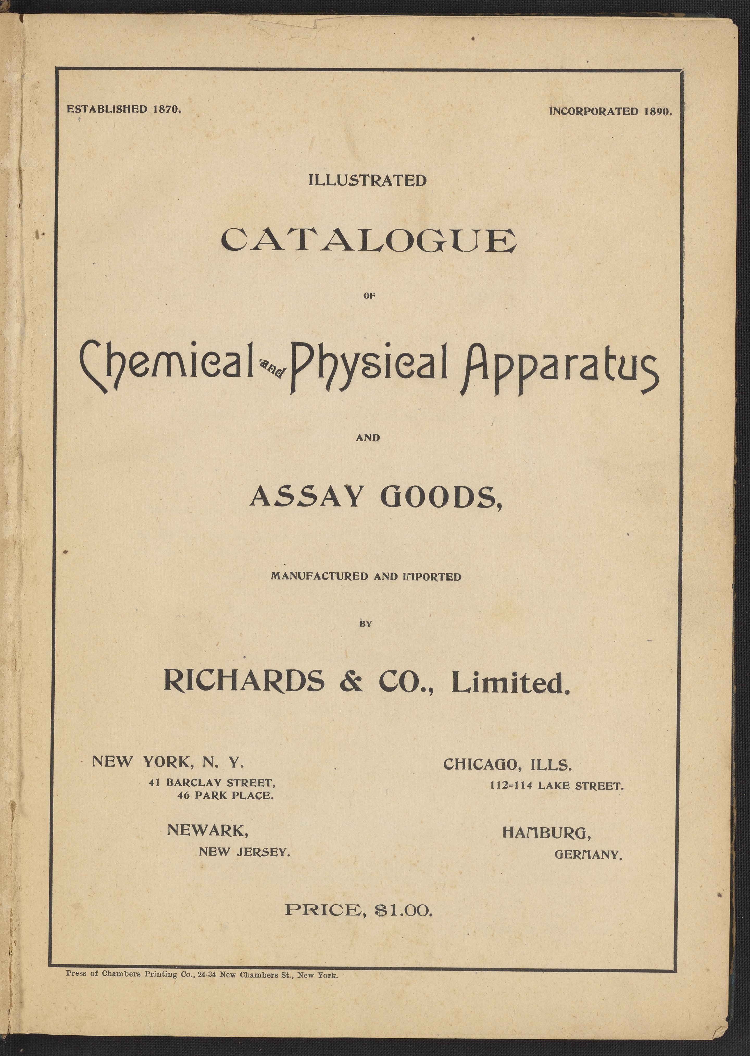 Richards & Co. (New York, N.Y.). “Illustrated Catalogue of Chemical and Physical Apparatus and Assay Goods, Manufactured and Imported by Richards & Co., Limited.” New York, New York: Richards & Co. (New York, N.Y.), 1890–1899. Q184 .R53. Science History Institute. Philadelphia. https://digital.sciencehistory.org/works/ip5xqsz.