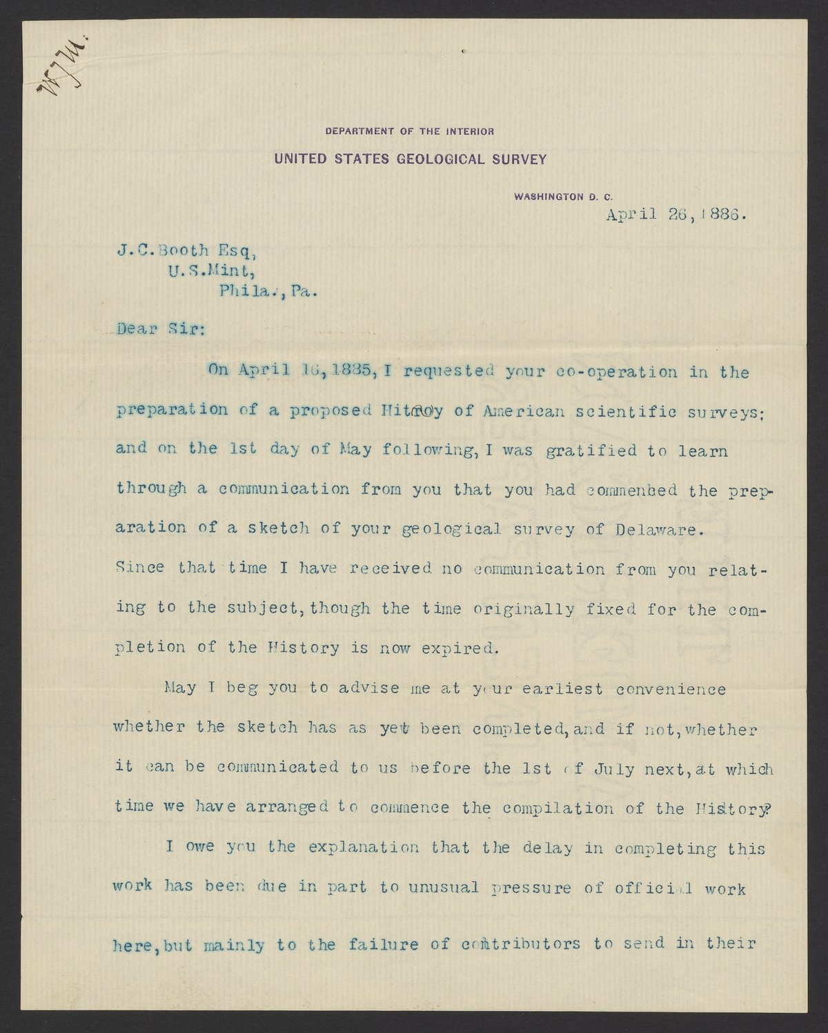 Letter from John Wesley Powell to James Curtis Booth, April 26, 1886