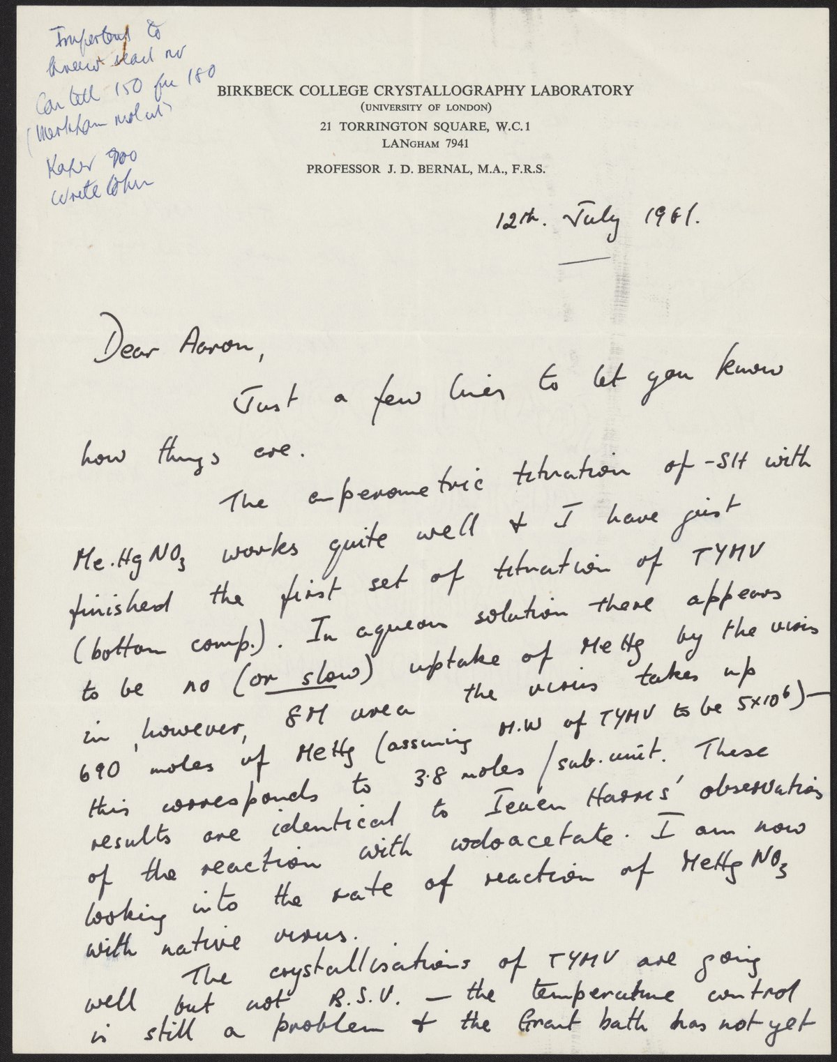 “Letter to Aaron Klug, July 12, 1961,” July 12, 1961. History of Molecular Biology Collection, Box 17, Folder 12. Science History Institute. Philadelphia. https://digital.sciencehistory.org/works/is8mev8.