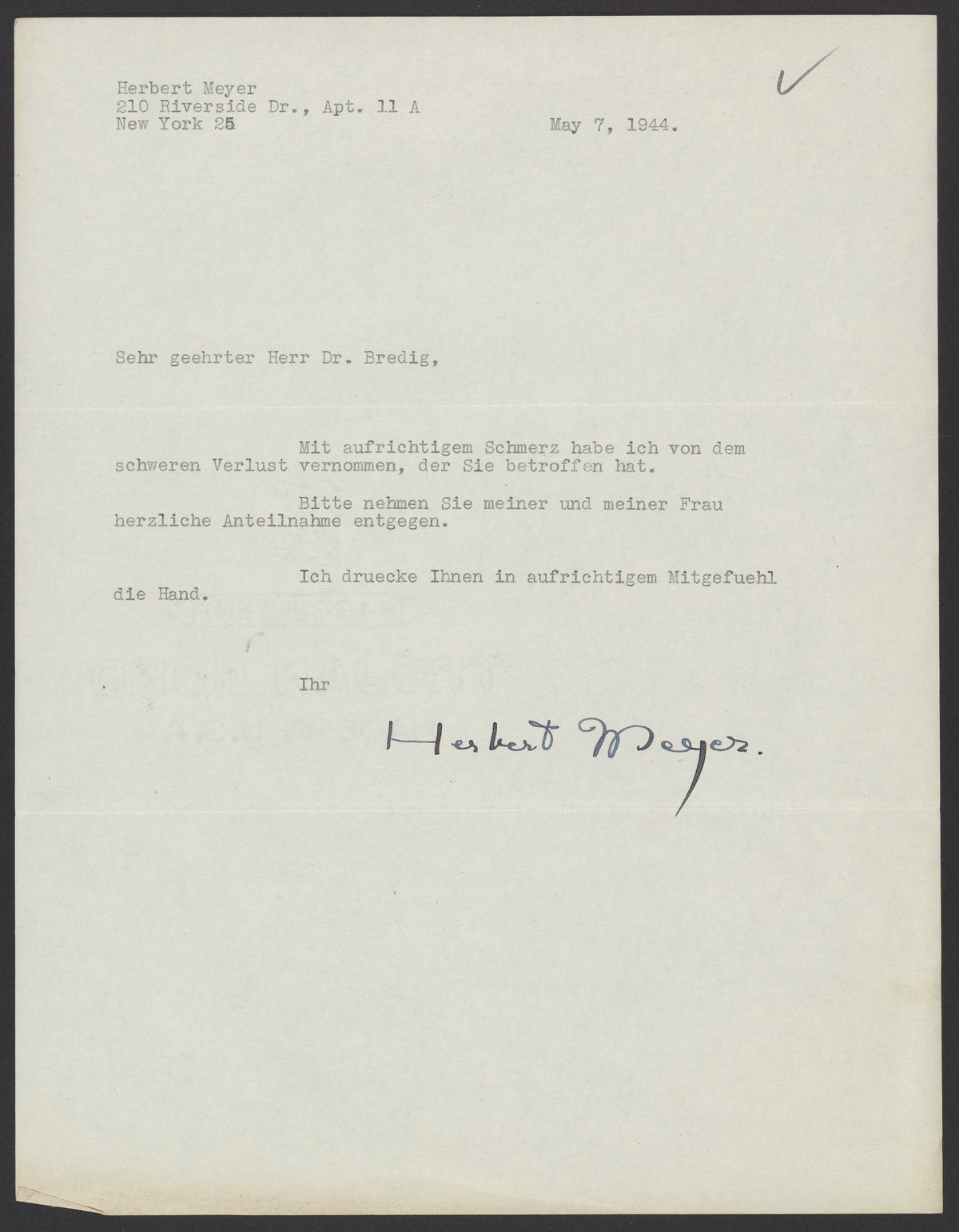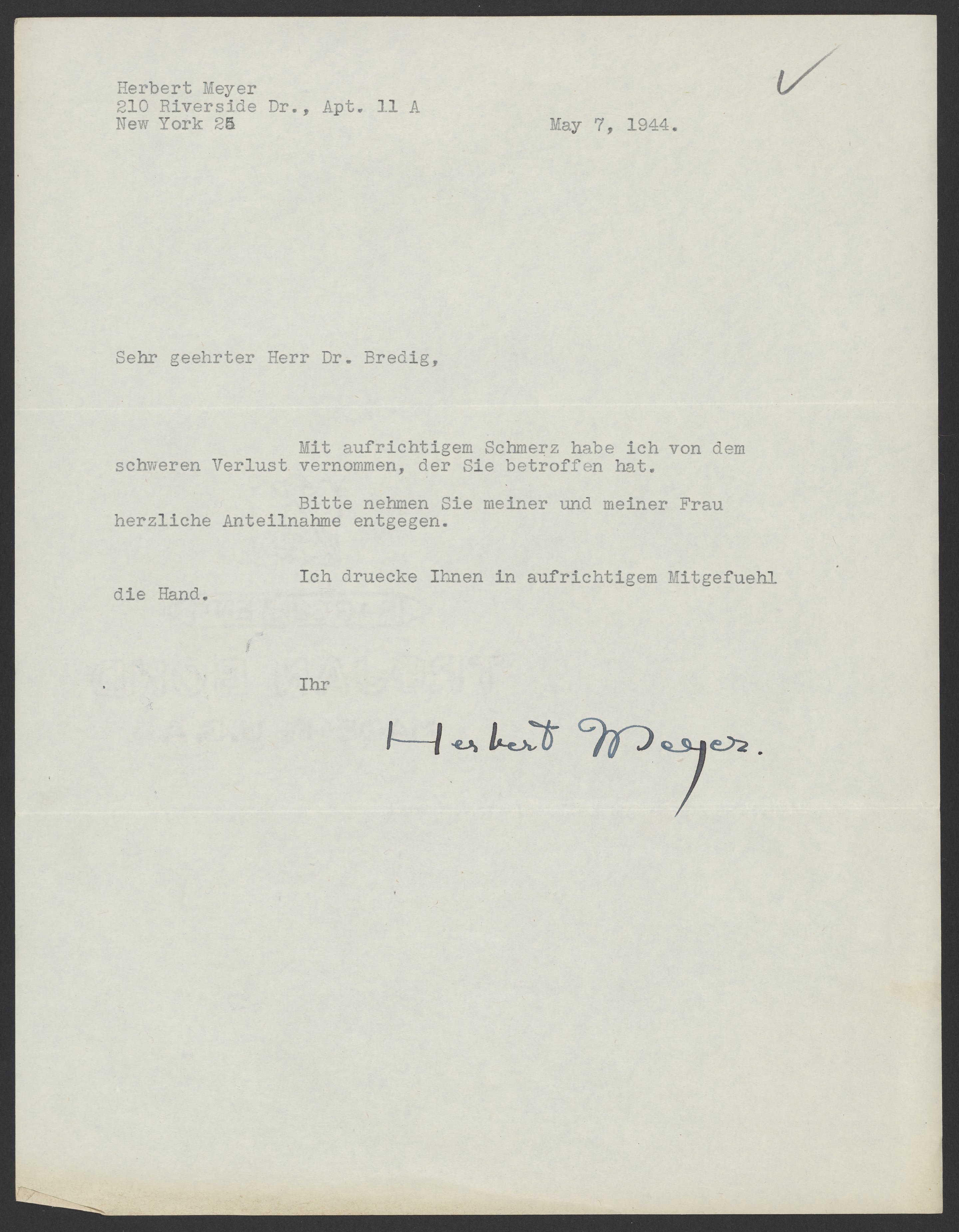 Letter of condolence from Herbert Meyer to Max Bredig