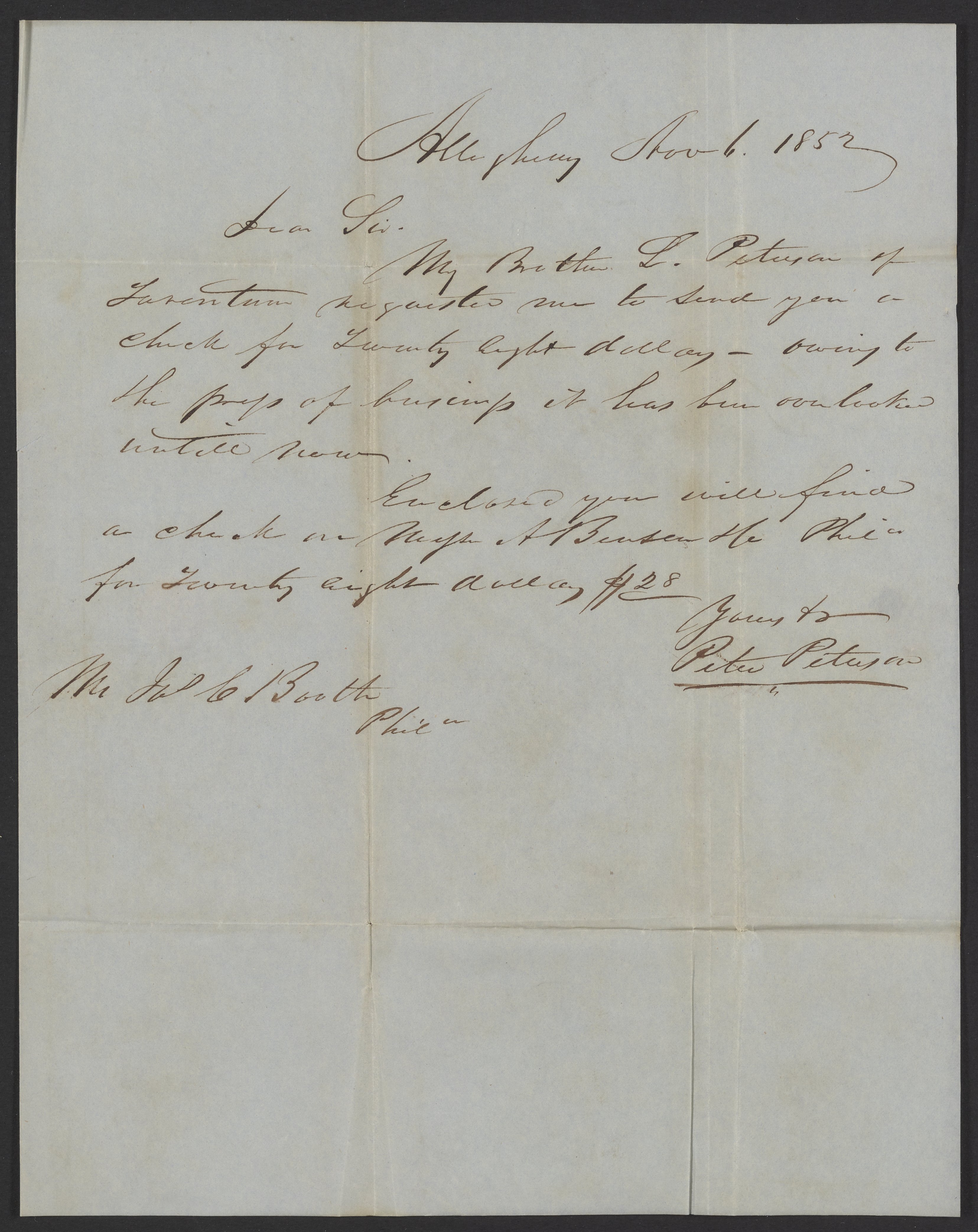 Small JPG1200 x 1511px — 217 KBLarge JPG2880 x 3626px — 1.2 MBFull-sized JPG3311 x 4169px — 1.6 MBOriginal fileTIFF — 3311 x 4169px — 39.6 MBPeter Peterson, brother of Lewis Peterson, encloses a check for James Curtis Booth (1810-1888) to pay for the water-sample analysis Booth completed.