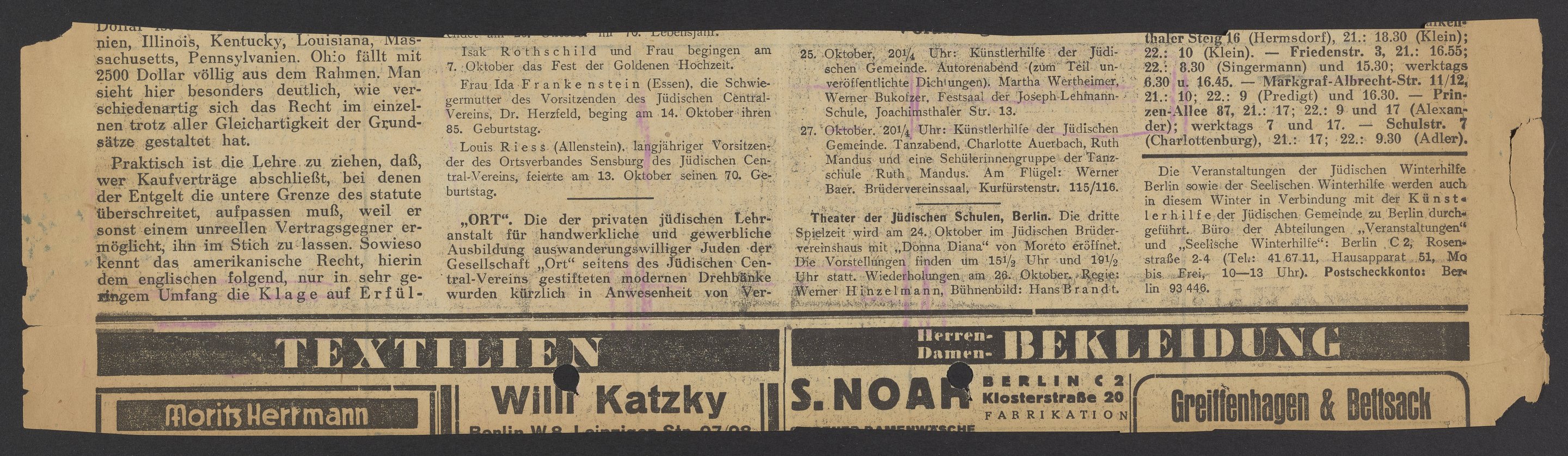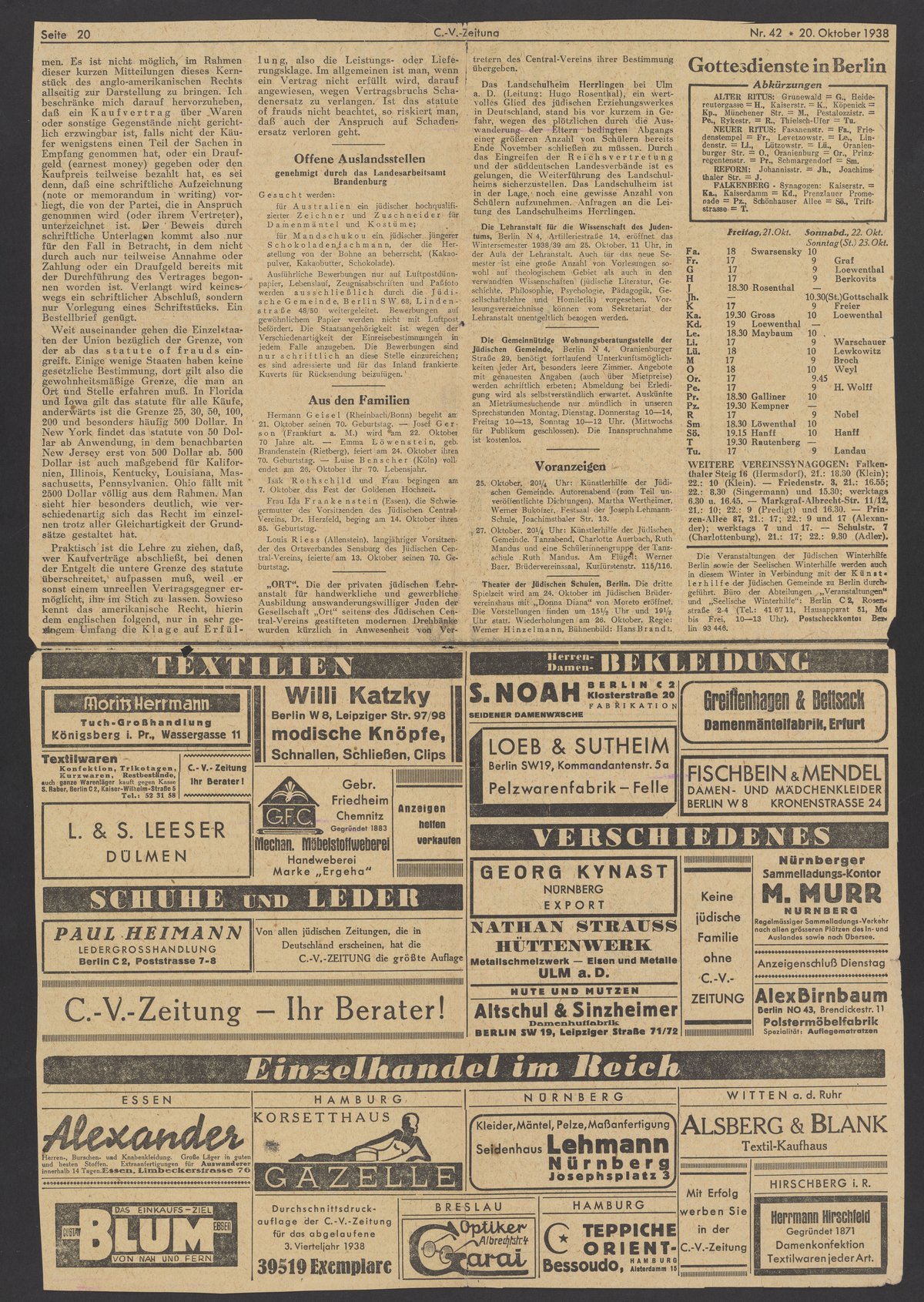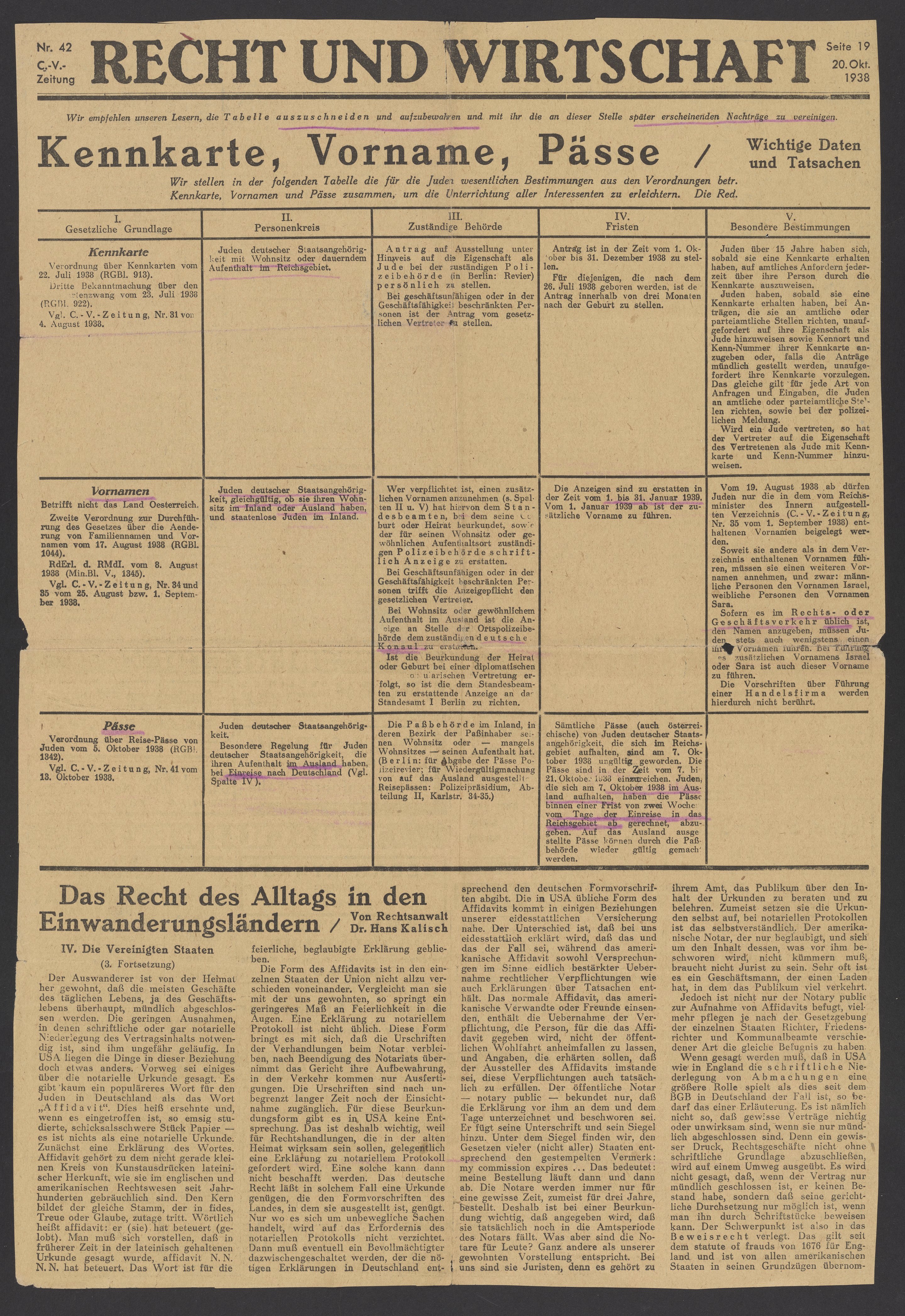 Small JPG1200 x 350px — 105 KBLarge JPG2880 x 840px — 543 KBFull-sized JPG7752 x 2261px — 3.6 MBOriginal fileTIFF — 7752 x 2261px — 50.2 MBNewspaper article from C.V.-Zeitung (Central-Verein-Zeitung), a Jewish newspaper published in Berlin from 1922-1938, with a table of regulations for identification cards, first names, and passports for German-Jewish people. The chart lists the laws, who it affects, the authority, deadlines, and any special provisions.