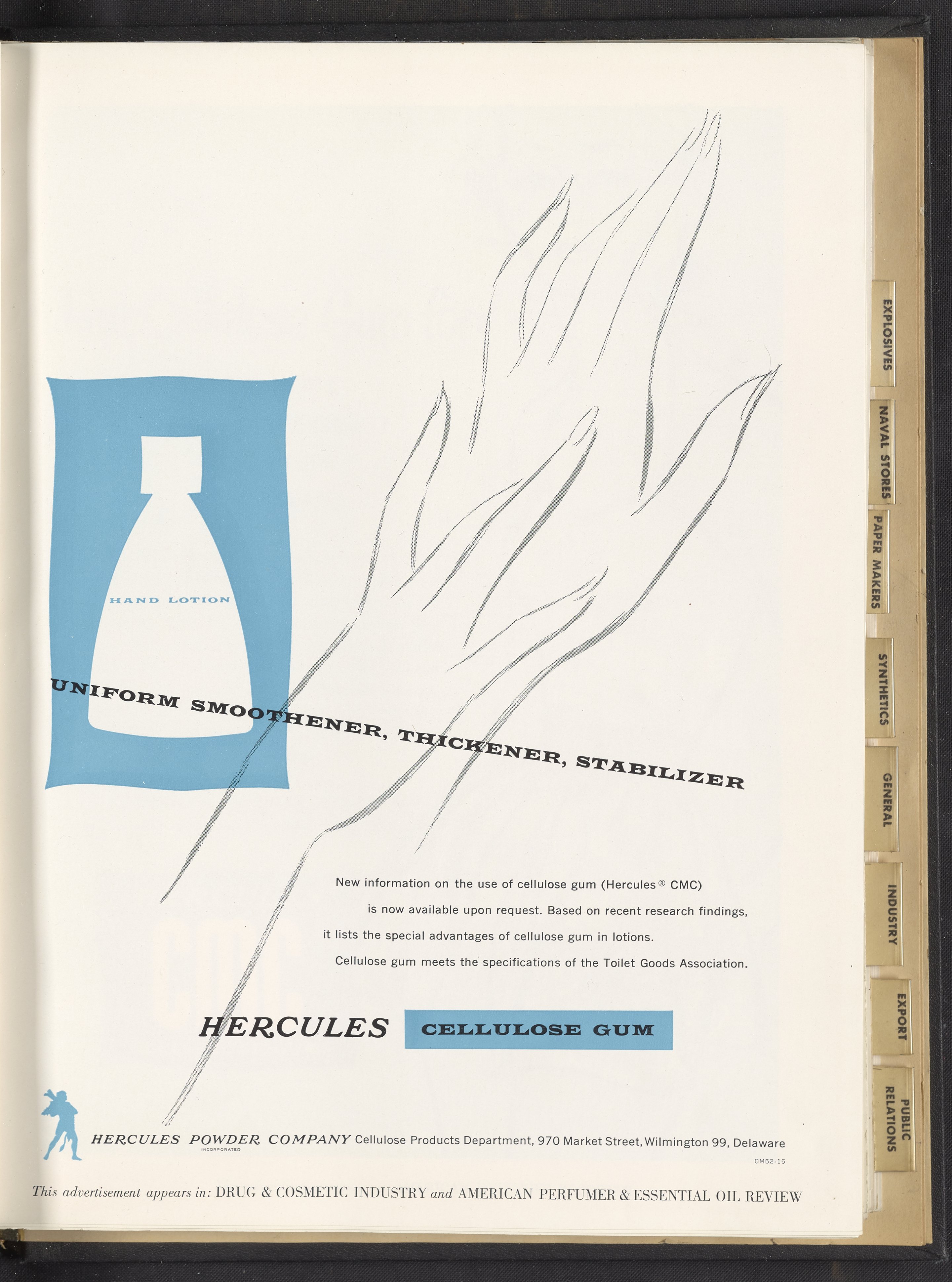 Hercules Incorporated. “Uniform Smoothener, Thickener, Stabilizer.” 1952 Hercules Advertisements, 1952. Records of Hercules Incorporated, Volume 1952. Science History Institute. Philadelphia. https://digital.sciencehistory.org/works/iv3bkpe.