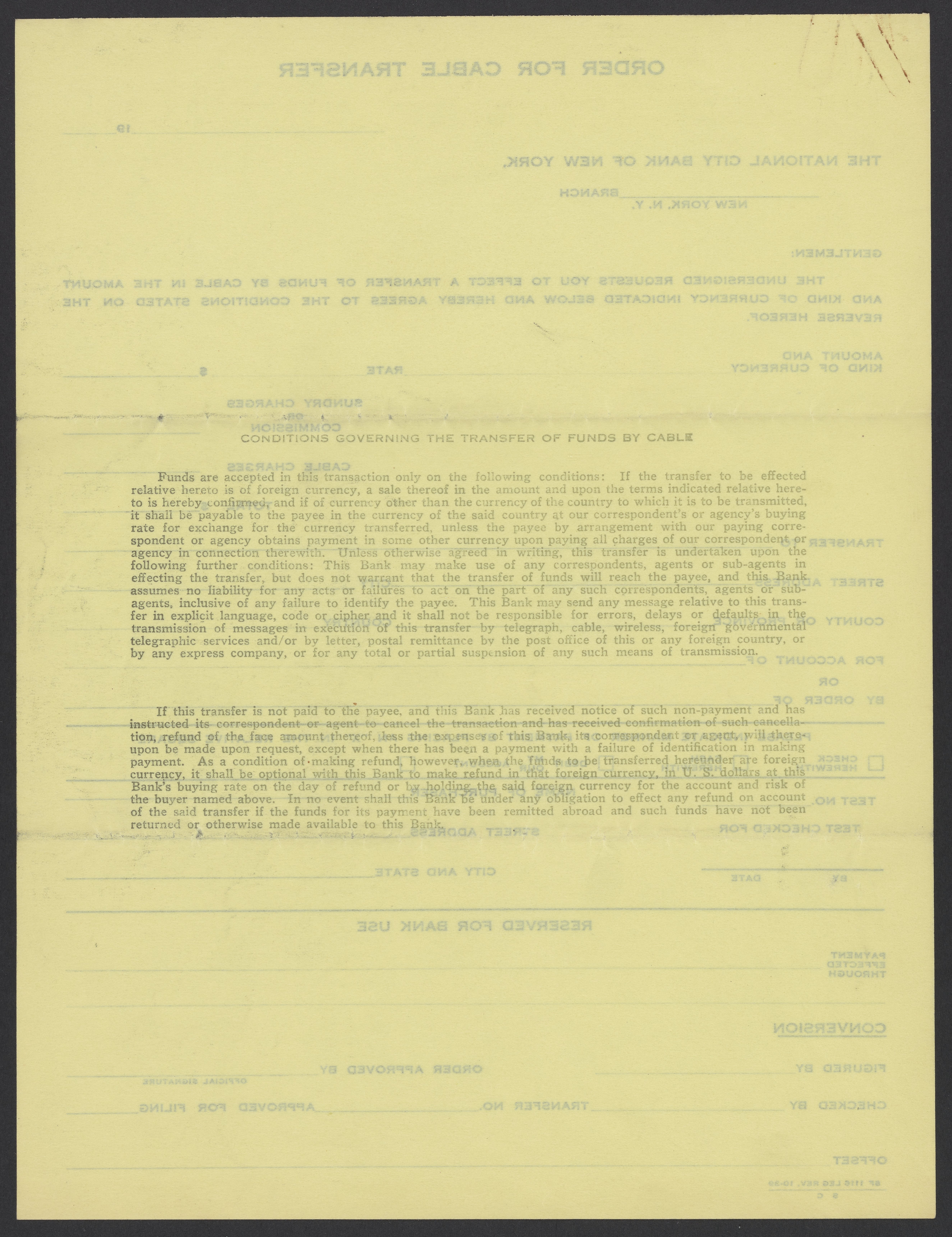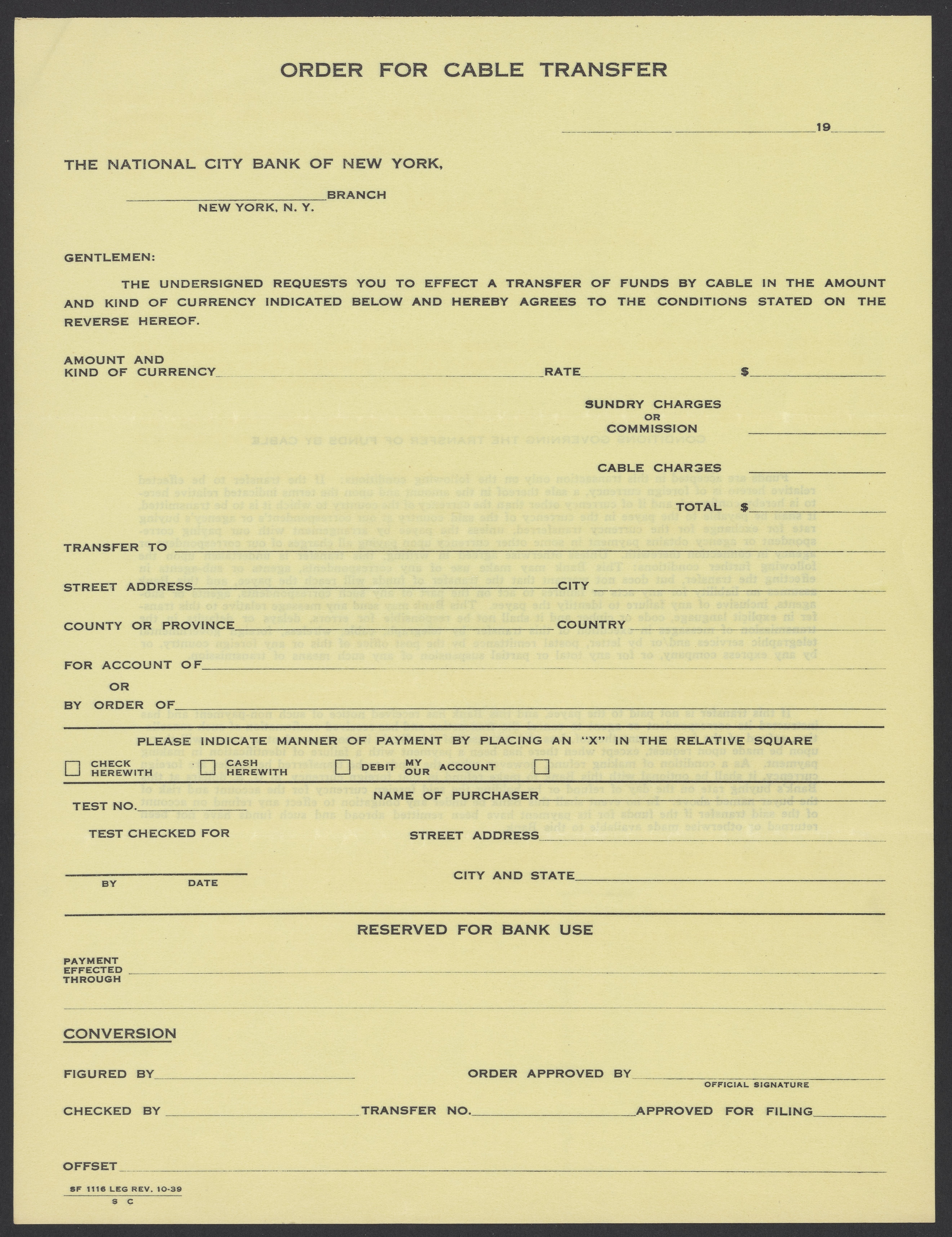 National City Bank of New York. “Order for Cable Transfer Form,” circa 1940. Papers of Georg and Max Bredig, Box 9, Folder 10. Science History Institute. Philadelphia. https://digital.sciencehistory.org/works/iwpgpyr.