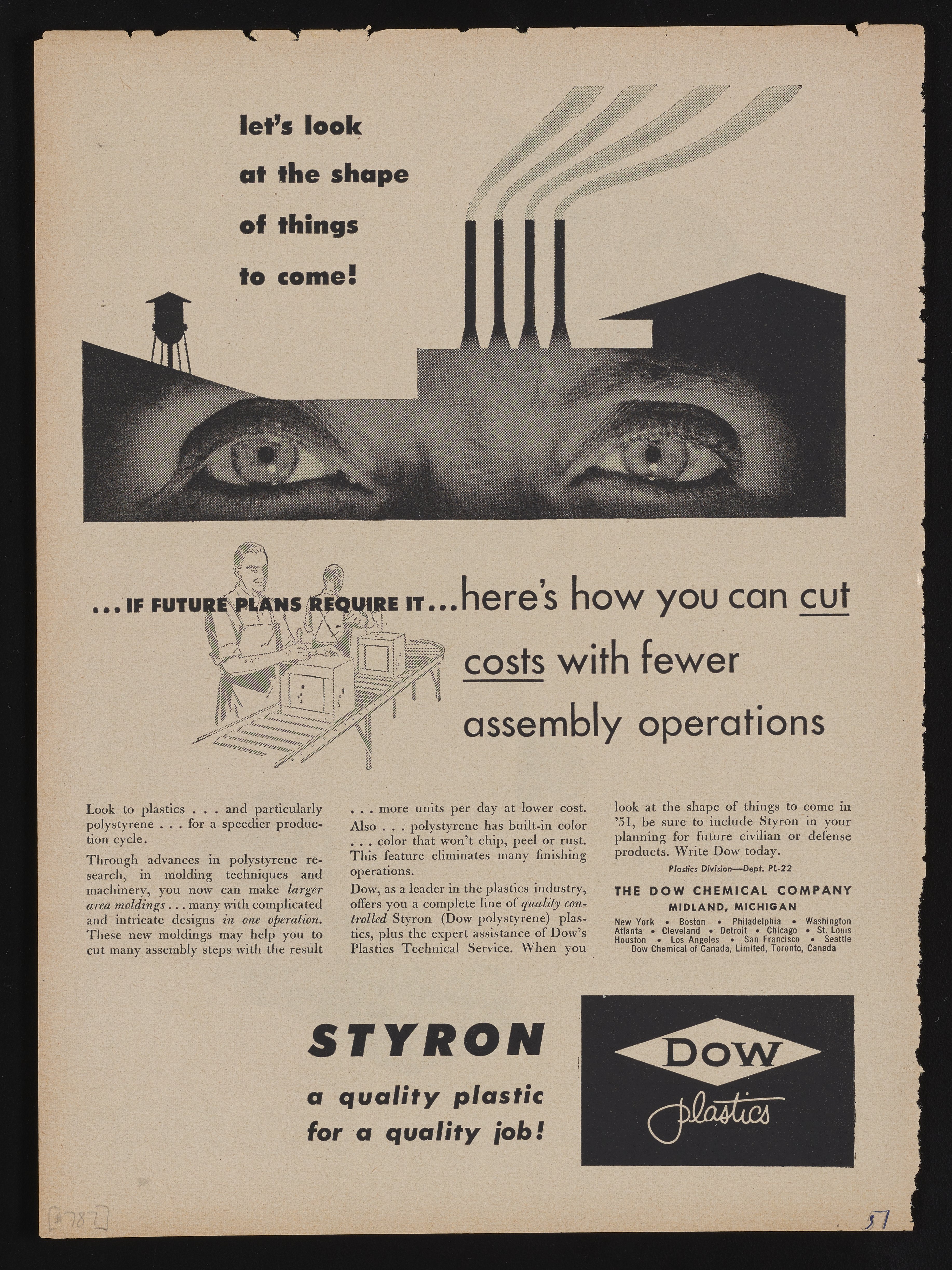 Print advertisement for Styron, the trade name for Styrenic plastics historically manufactured and sold by the Dow Chemical Company for a variety of industrial and consumer applications. The advertisement shows a man's eyes framed by the silhouette for a factory building with smokestacks. A smaller inset illustration shows two men working at an assembly line. The accompanying text describes the benefits of using Styron and other plastics in manufacturing, particuarly in producing larger area moldings to speed production. This advertisement appeared in the July 9, 1951 edition of Time.