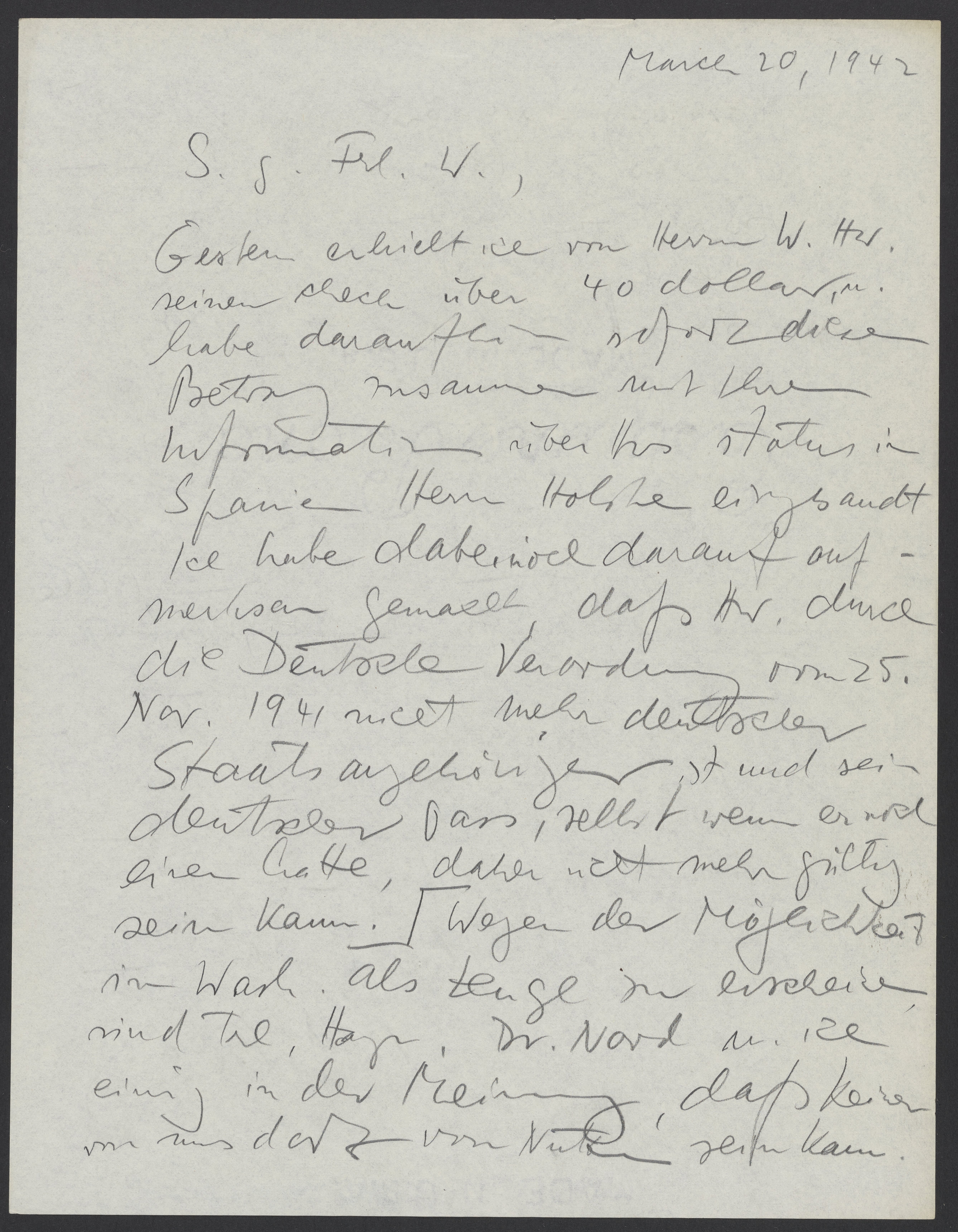 Gestern erhielt ich von Herrn W.H. seinen Scheck über 40 Dollar u. habe daraufhin sofort diesen Betrag mit der Information über H’s Status in Spanien Herrn Holske eingesandt. Ich habe dabei noch darauf aufmerksam gemacht, daß H. durch die deutsche Verordnung von 25. Nov. 1941 nicht mehr Staatsangehöriger ist und sein deutscher Pass, selbst wenn er nicht einen hätte, nicht mehr gültig sein kann. Wegen der Möglichkeit in Washington als Zeuge zu erscheinen, sind Frl. Hayn, Dr. Nord, und ich einig in der Meinung, daß keiner von uns vom Nutzen sein kann.