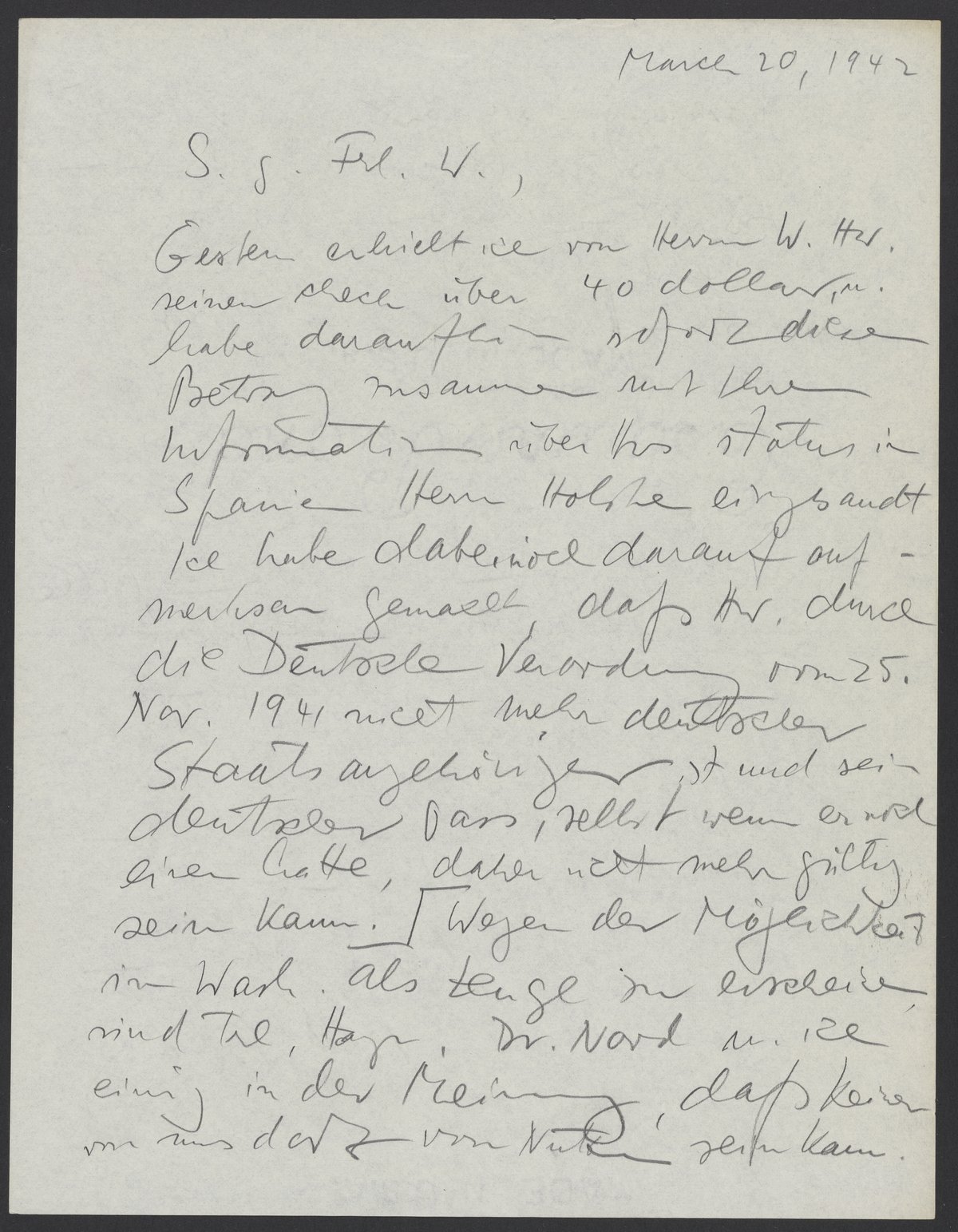 Yesterday, I received a check from Mr. W.H. for $40 and immediately sent this to Mr. Holske with information about Hochwald’s status in Spain. I also pointed out that the German decree of November 25, 1941 meant that Hochwald was no longer a German citizen and that his German passport, even if he didn’t have one, could no longer be valid. Regarding the possibility to appear in Washington as a character witness, Ms. Hayn, Dr. Nord, and I agree that neither of us can be of any use.