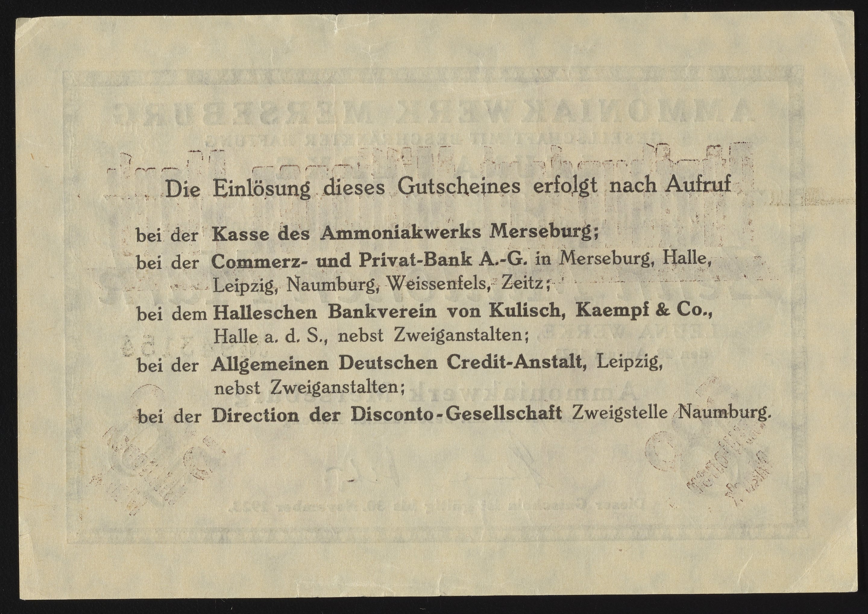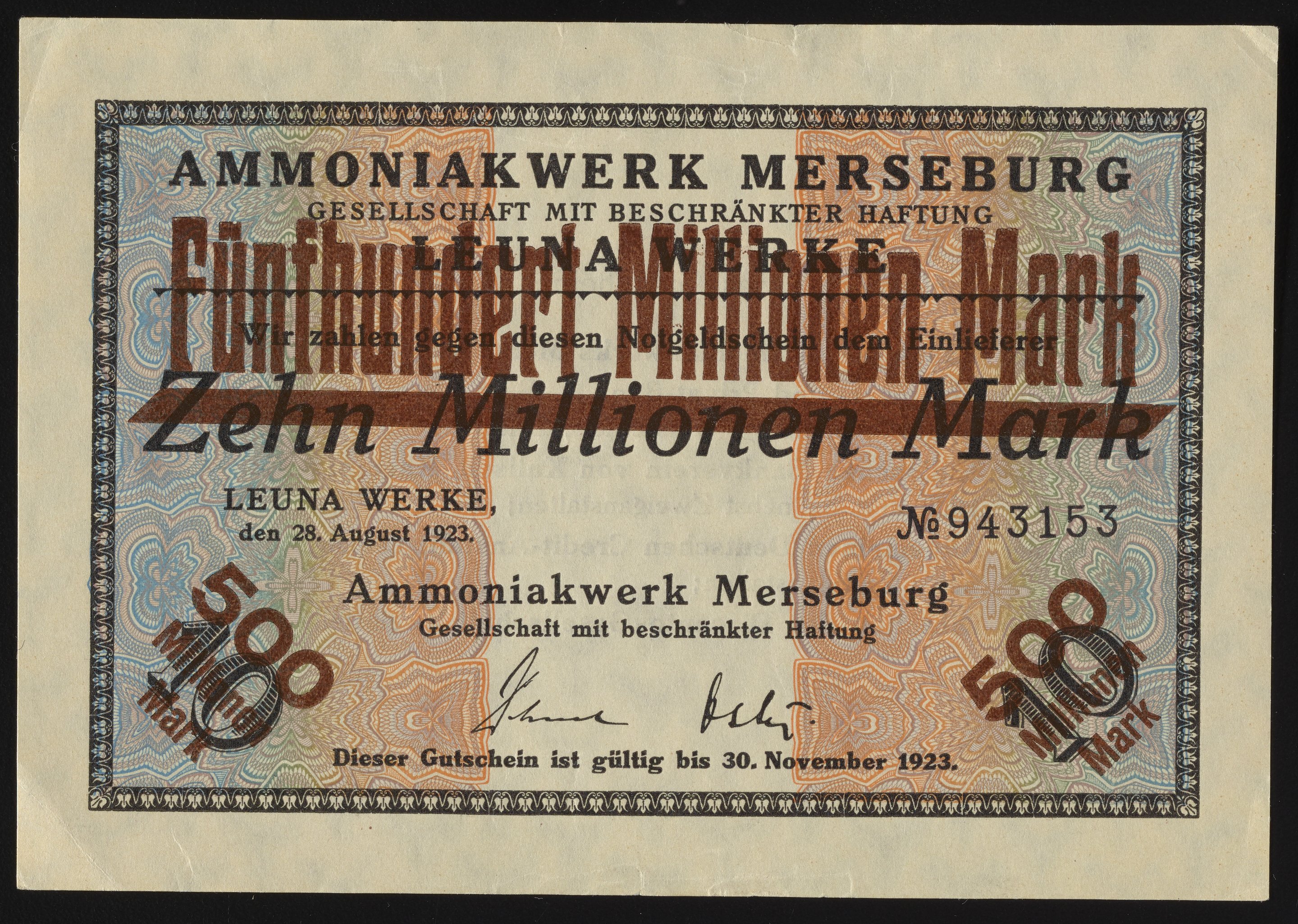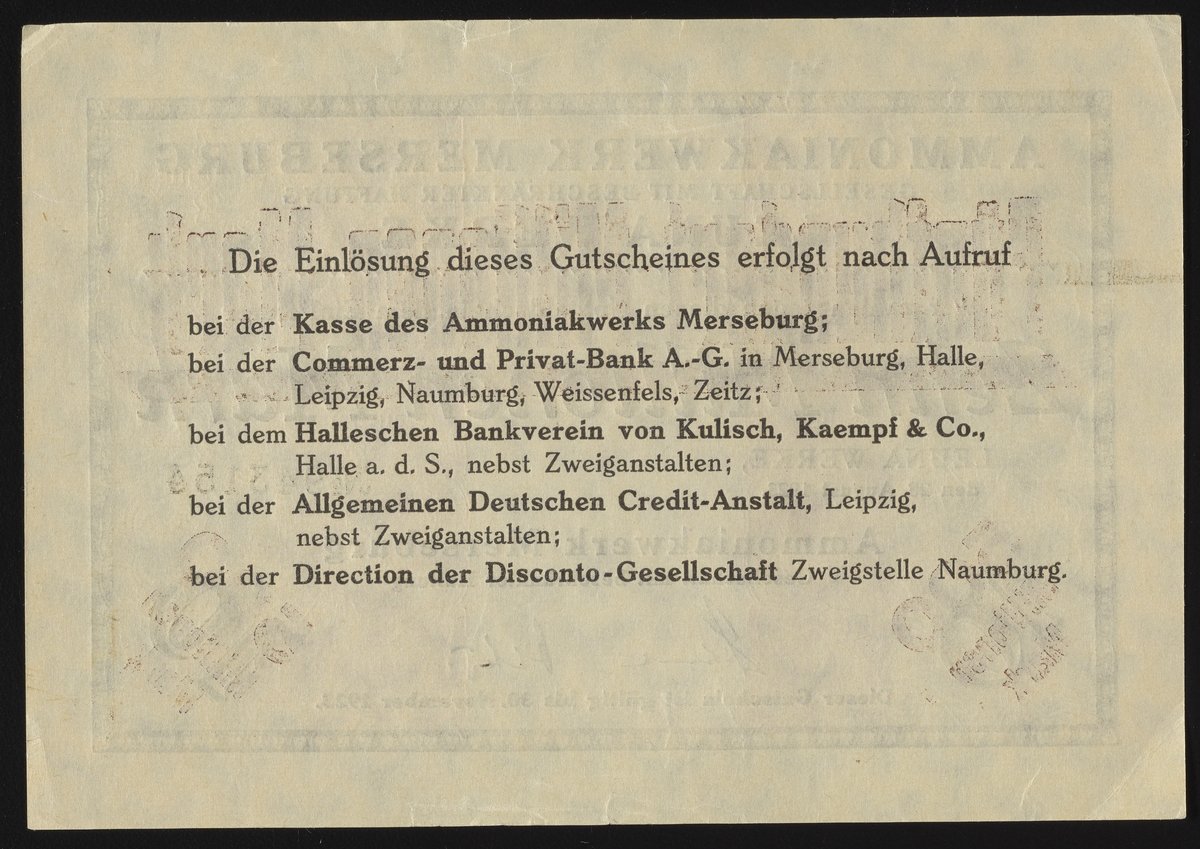 Small JPG1200 x 854px — 286 KBLarge JPG2880 x 2050px — 1.5 MBFull-sized JPG4129 x 2939px — 2.8 MBOriginal fileTIFF — 4129 x 2939px — 34.8 MBThis Zehn Millionen/Fünfhundert Millionen Mark Notgeldschein, or ten million/five hundred million Mark emergency money bill, was issued by Ammoniakwerk Merseburg of Badische Anilin- & Soda-Fabrik. Fünfhundert Millionen was printed over the original Zehn Millionen Mark voucher due to rampant hyperinflation. The verso of the company scrip includes the terms of the scrip. This particular voucher was issued by the Ammoniakwerk Merseburg Leuna-werk, or the ammonia works of Merseburg. Paper features a watermark design.