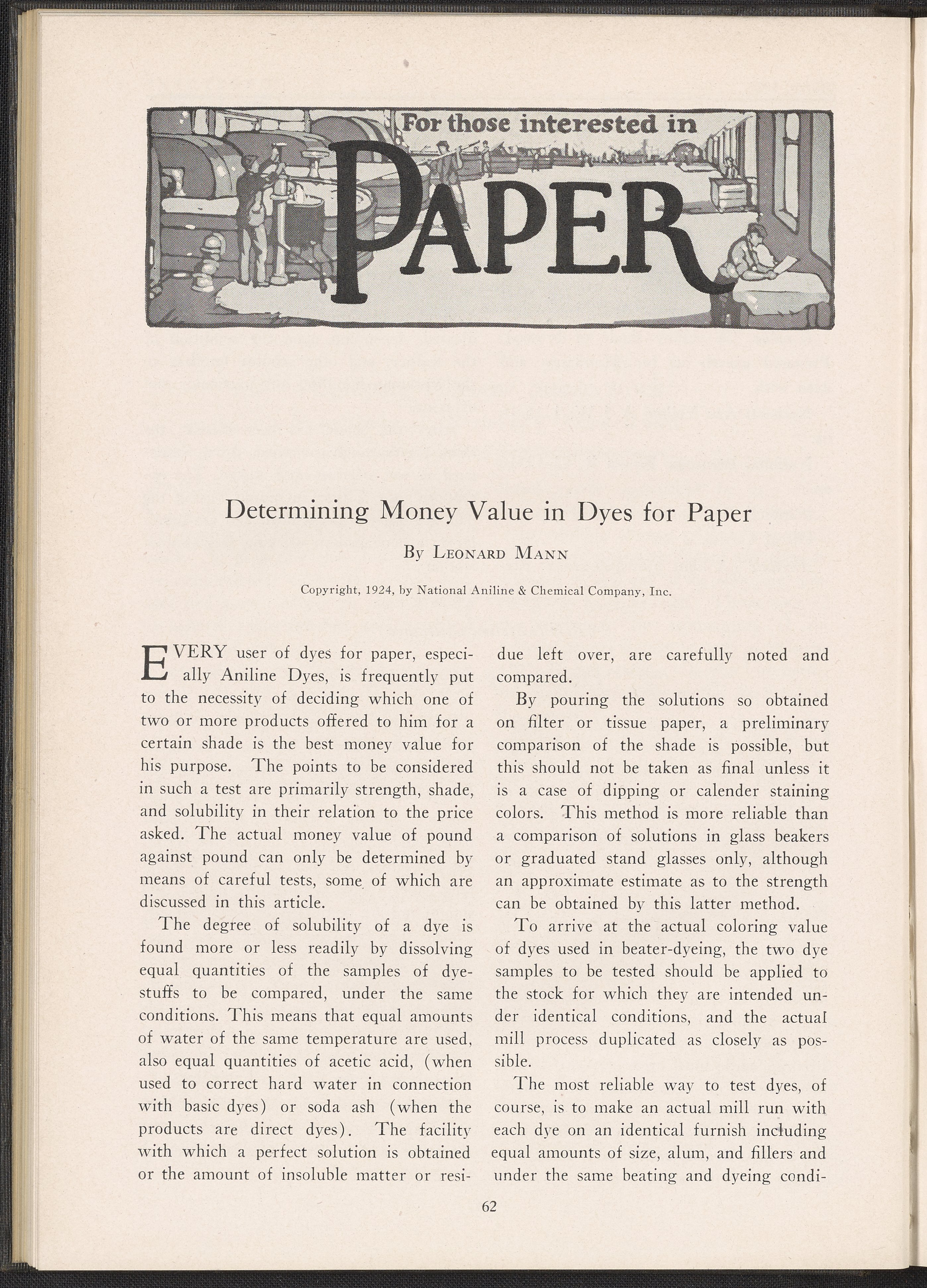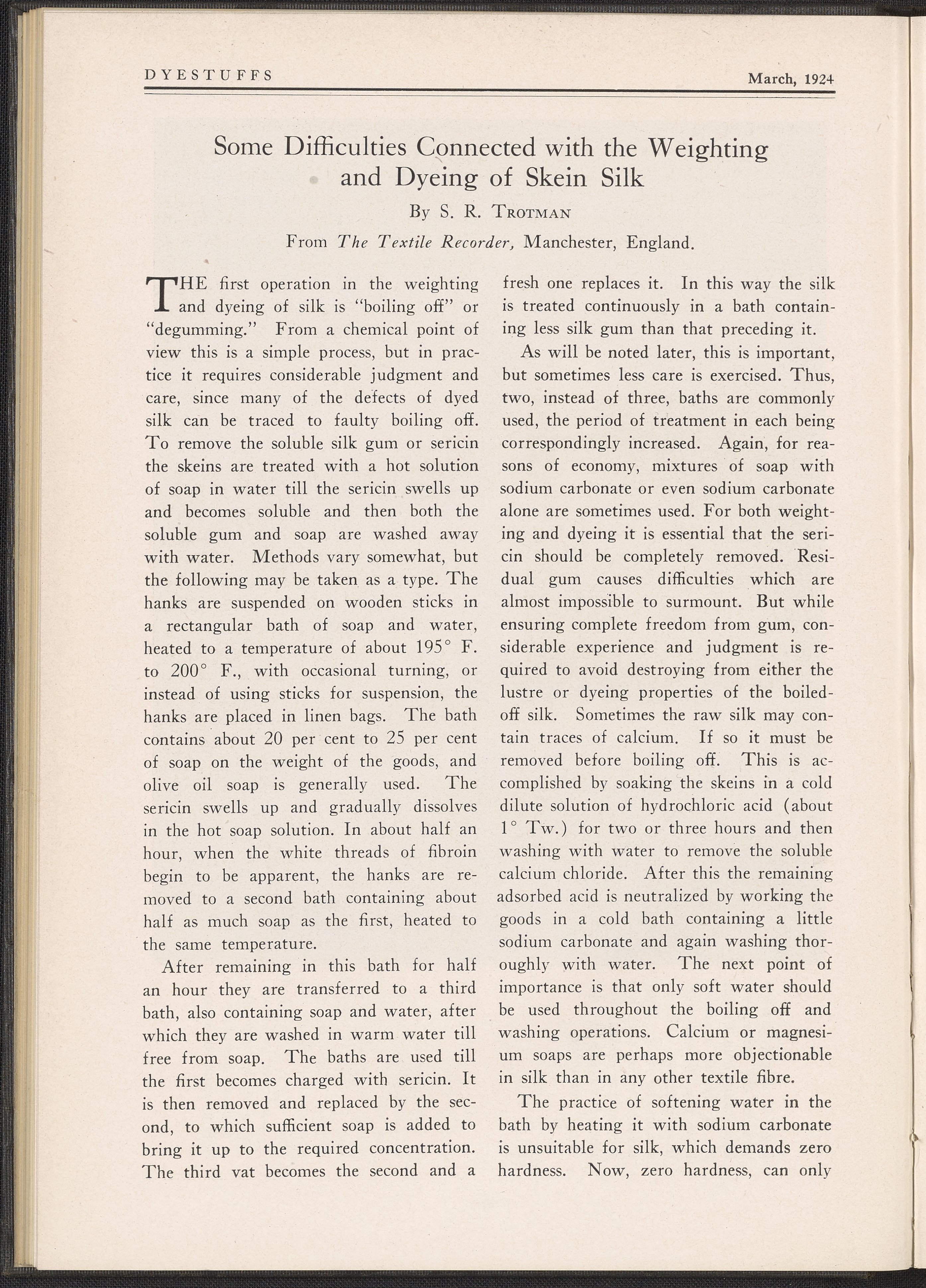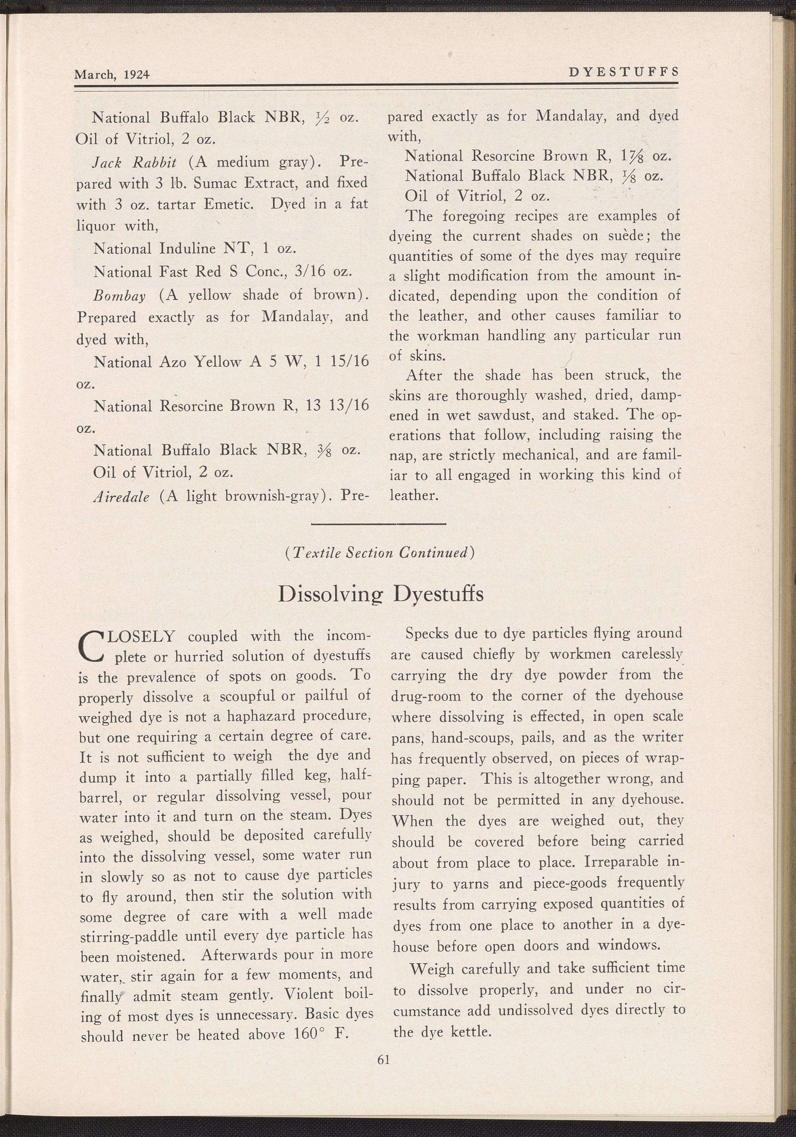 The journal contains reprints of select articles from periodicals in the dyeing and textile fields. This issue contains articles such as Dyeing of Sweater Yarn by Louis J. Matos; Some Difficulties Connected with the Weighting and Dyeing of Skein Silk by S. R. Trotman from The Textile Recorder; Dyeing of Bolivias, Velours, and Other Napped and Pile Fabrics from Fibre and Fabric; Coloring Chrome Suede Stock; and Determining Money Value in Dyes for Paper by Leonard Mann. This issue includes black and white printed illustrations.