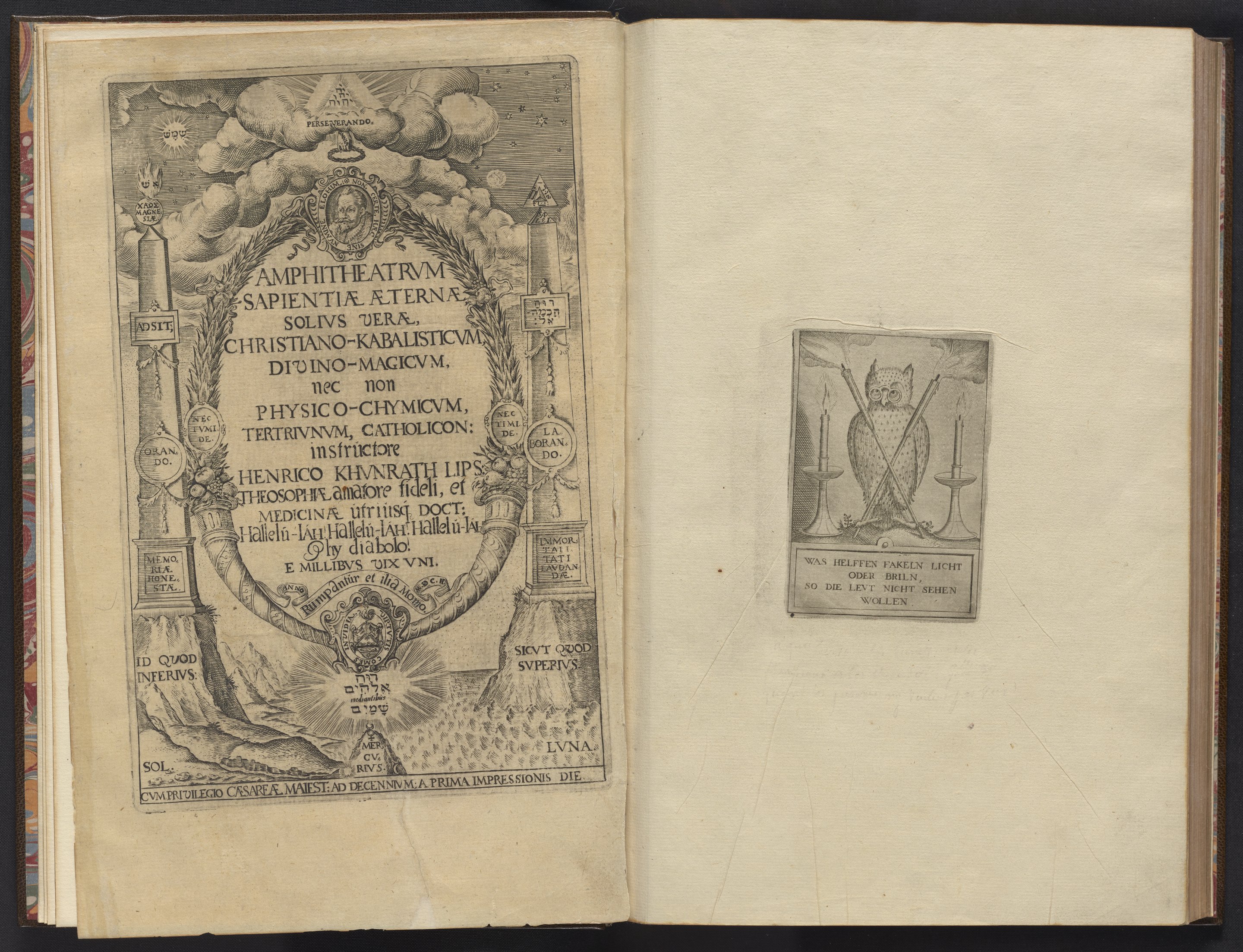 Title page and frontispiece from Amphitheatrum Sapientiae Aeternae, Solius, Verae [Amphitheatre of the Only True Eternal Wisdom]