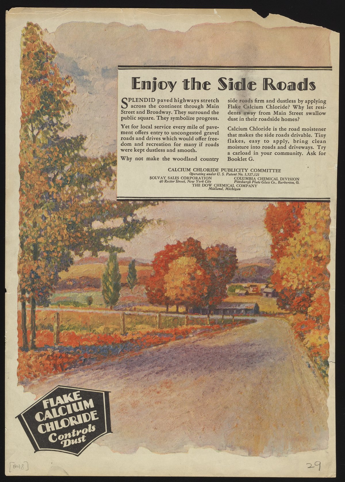 Dow Chemical Company. “Enjoy the Side Roads,” 1929. Advertisements from the Dow Chemical Historical Collection, Box 7. Science History Institute. Philadelphia. https://digital.sciencehistory.org/works/j38607677.