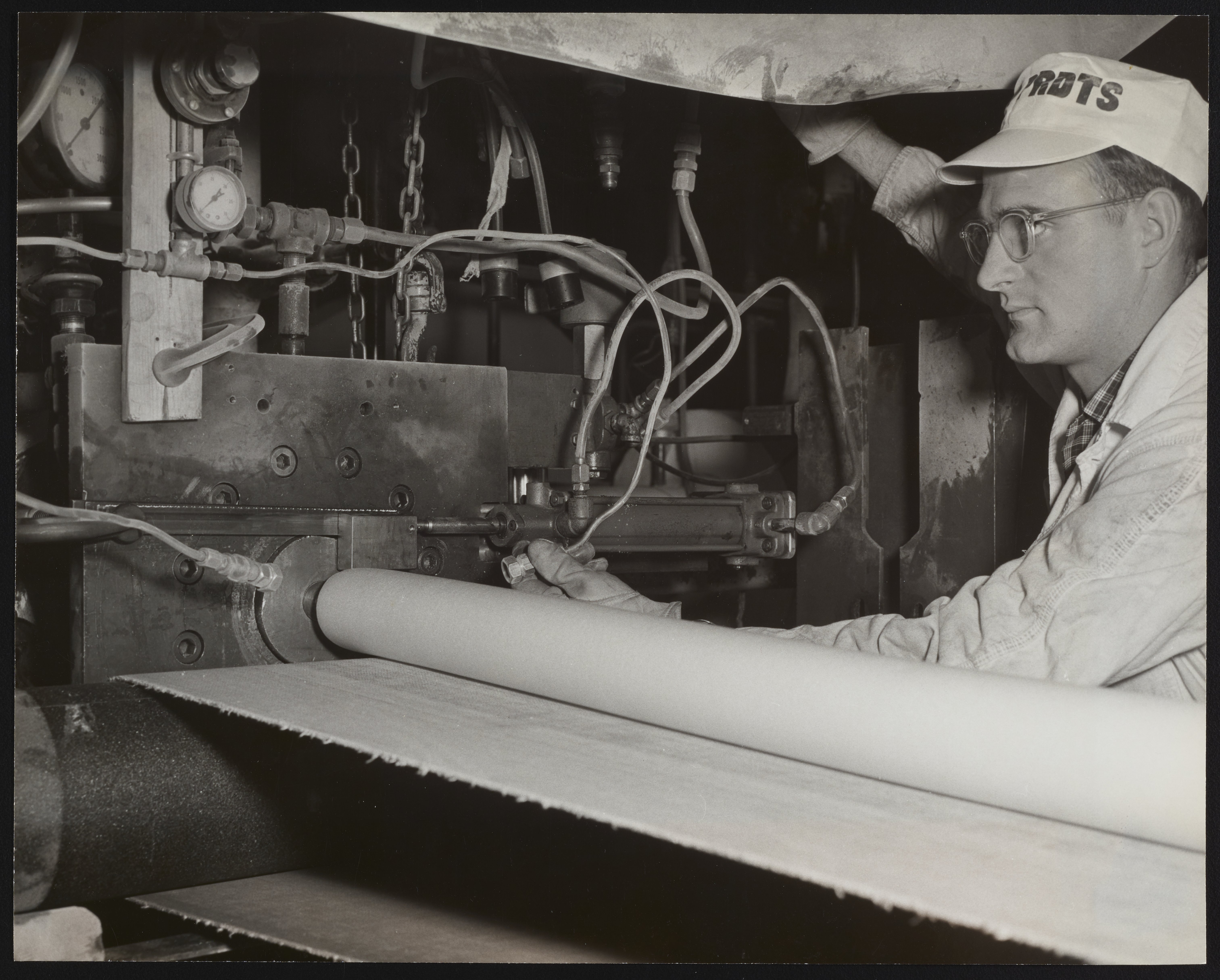 Close-up view of an unidentified employee at work in the saran film manufacturing facilities at the Dow Chemical Company plant located in Midland, Michigan. Initially developed for the U.S. Army to wrap arms and equipment for transport during World War II, saran plastic was subsequently developed and marketed as Saran Wrap for household use.