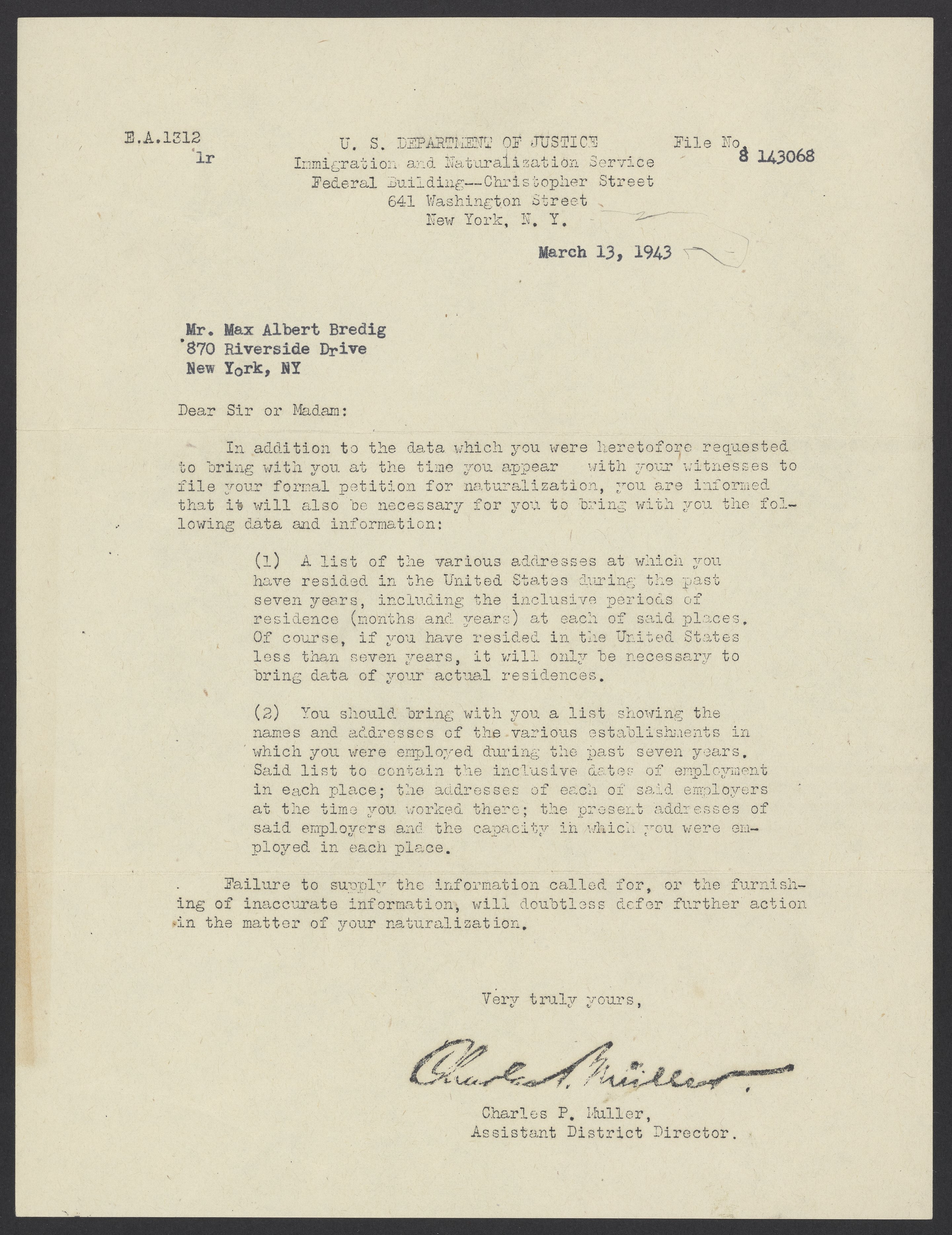 Letter from the U.S. Department of Justice Immigration and Naturalization Service to Max Bredig, March 13, 1943